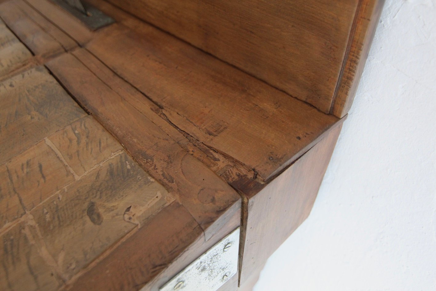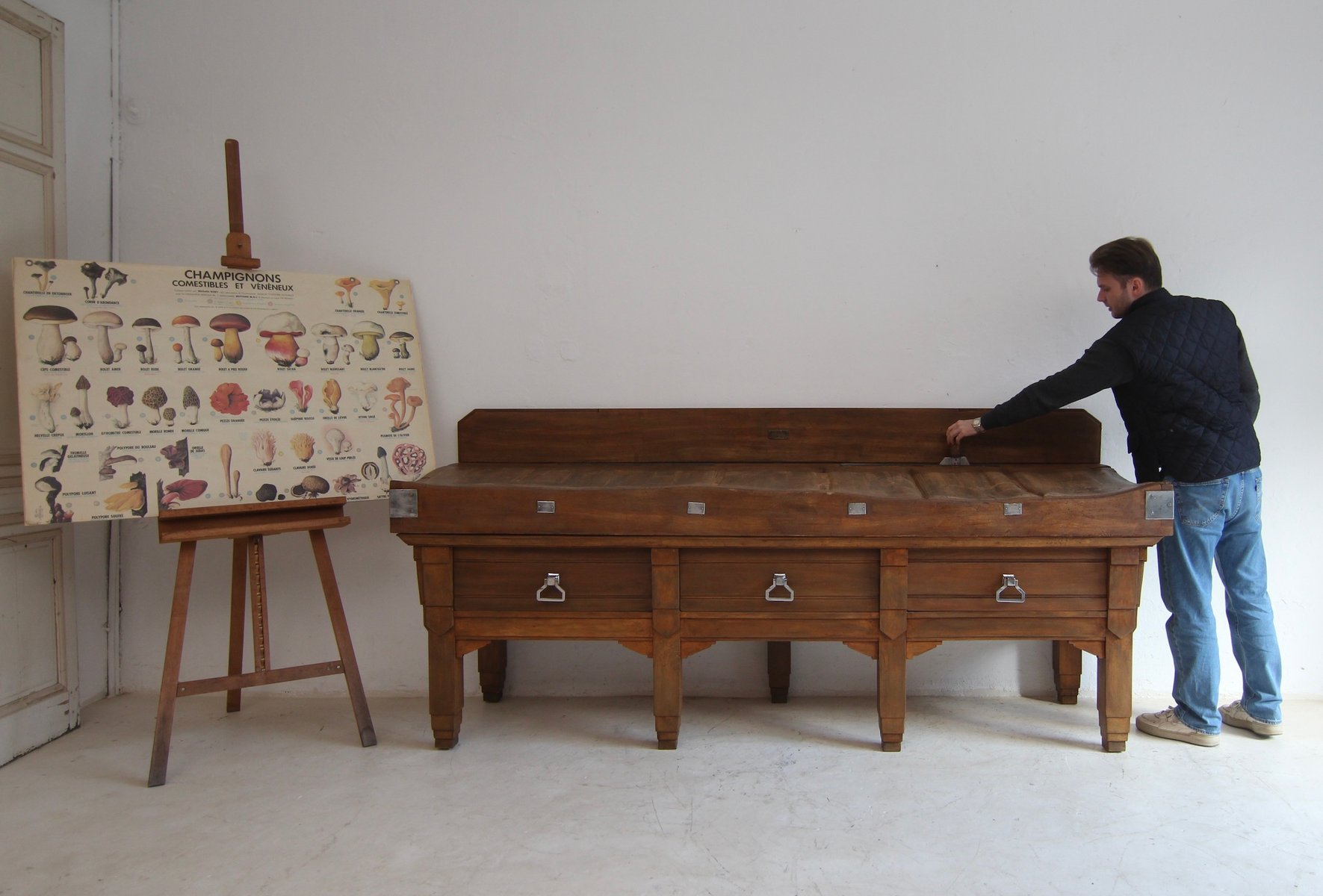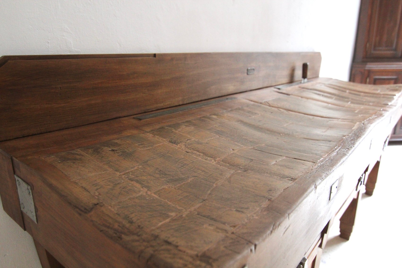 Base con 7 gambe quadrate a gradini e struttura alta con 3 grandi cassetti a coda di rondine. Sopra si trova il solido piano di lavoro, spesso fino a 17 cm, con 2 fessure per coltelli in ottone e uno schienale rimovibile. Maniglie originali Art Déco montate sui cassetti. Una targhetta in ottone sulla spalliera documenta il produttore "Pierre Gyssels" di Bruxelles.