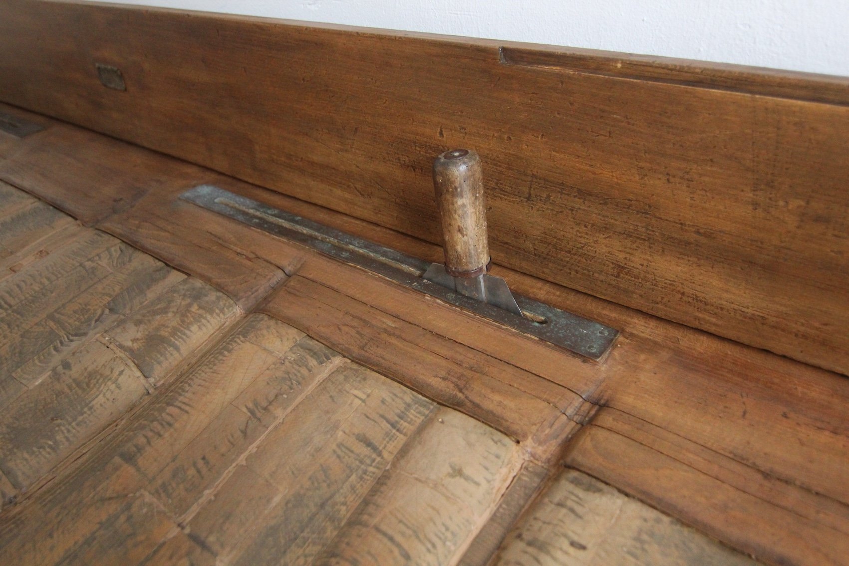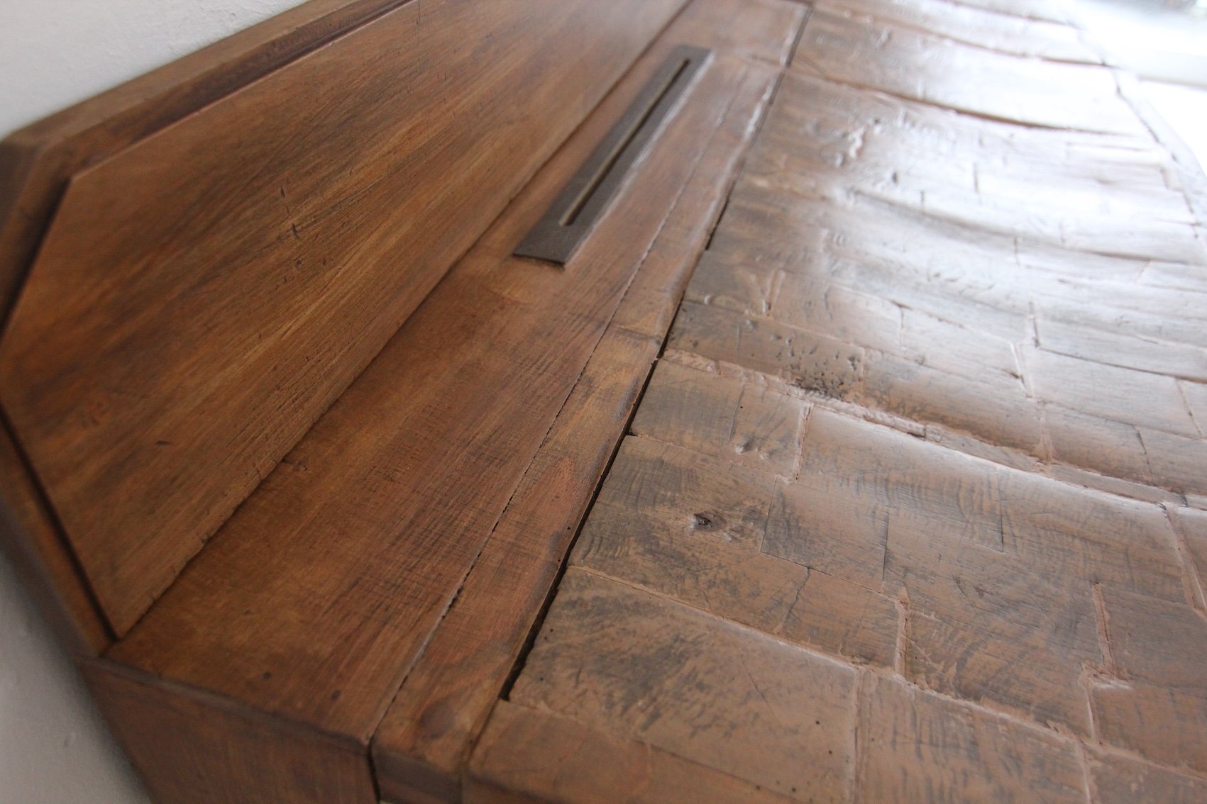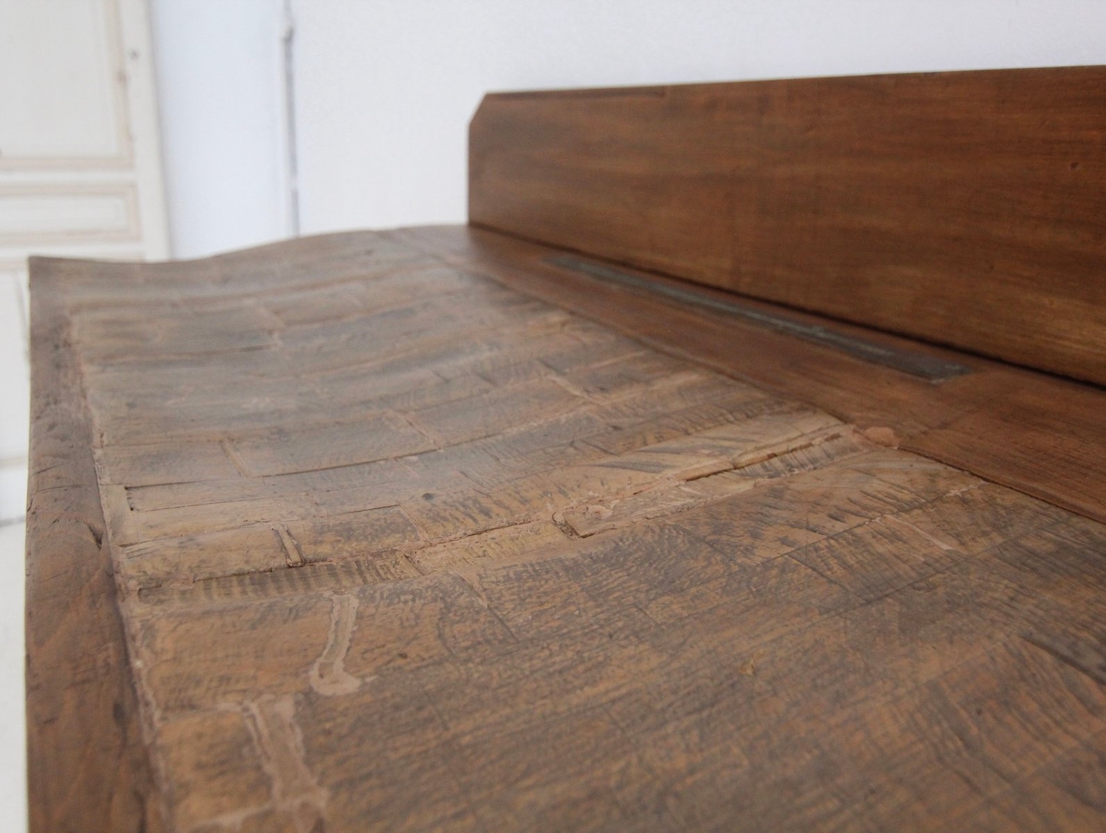 Base con 7 gambe quadrate a gradini e struttura alta con 3 grandi cassetti a coda di rondine. Sopra si trova il solido piano di lavoro, spesso fino a 17 cm, con 2 fessure per coltelli in ottone e uno schienale rimovibile. Maniglie originali Art Déco montate sui cassetti. Una targhetta in ottone sulla spalliera documenta il produttore "Pierre Gyssels" di Bruxelles.