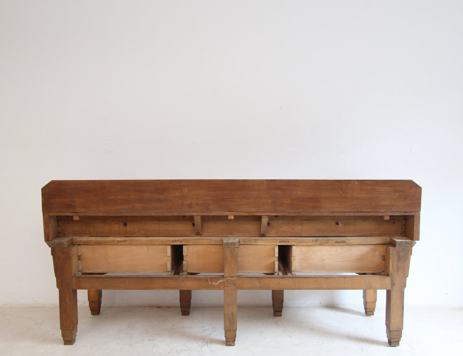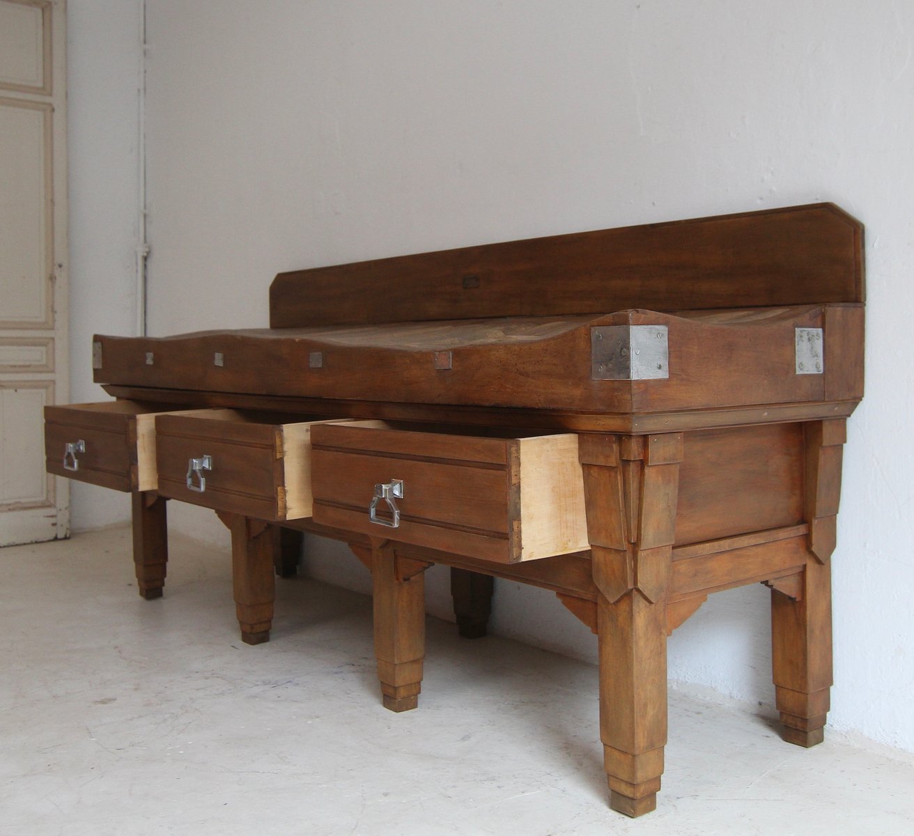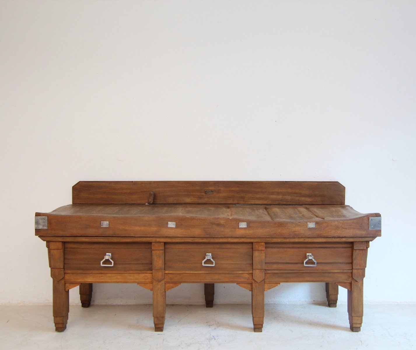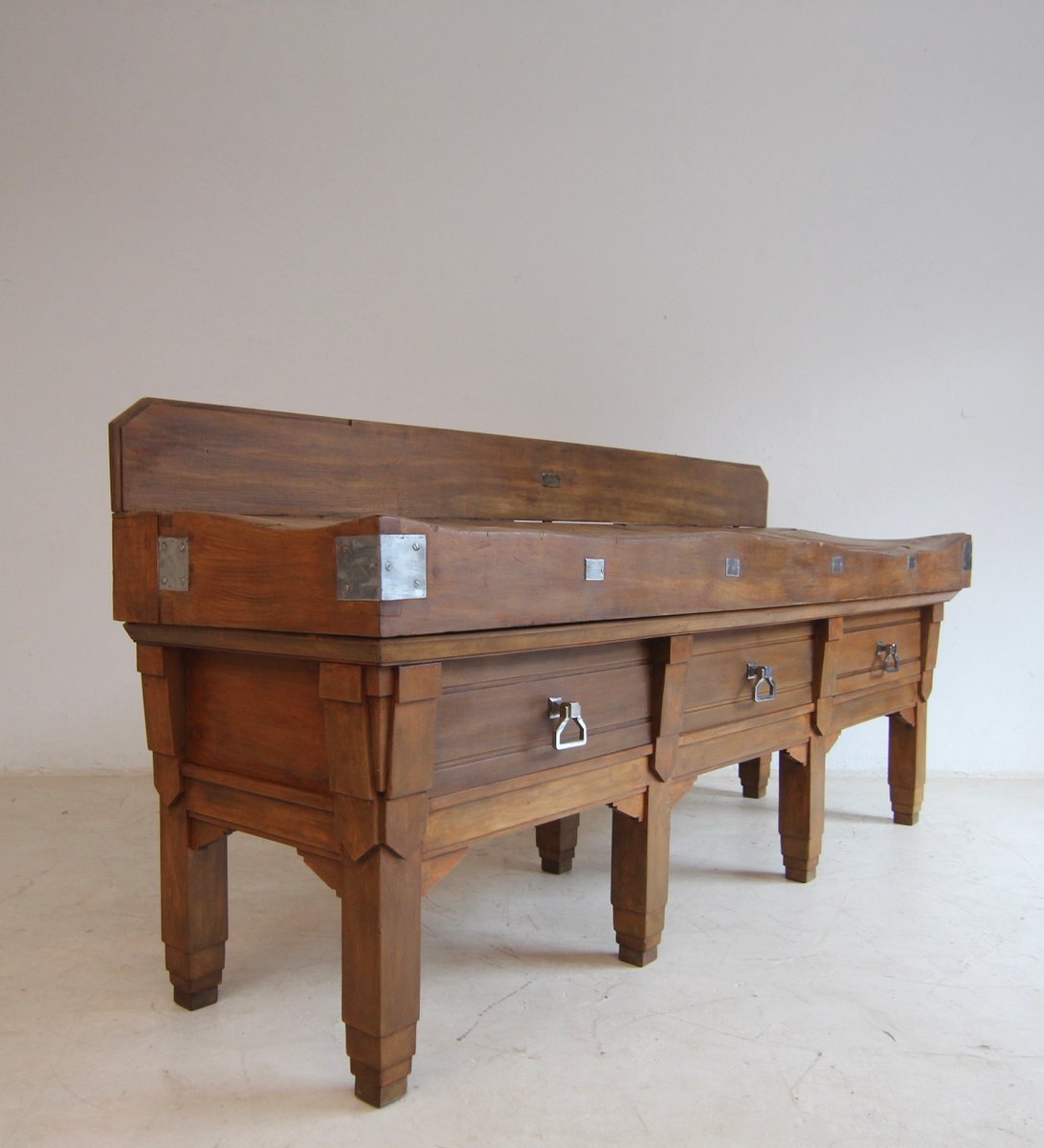 Base with 7 stepped square legs and high frame with 3 large dovetailed drawers. On top is the solid worktop, up to 17 cm thick, with 2 brass knife slots and a removable backboard. Original Art Deco handles mounted on the drawers. A brass plaque on the backboard documents the manufacturer "Pierre Gyssels" in Brussels.