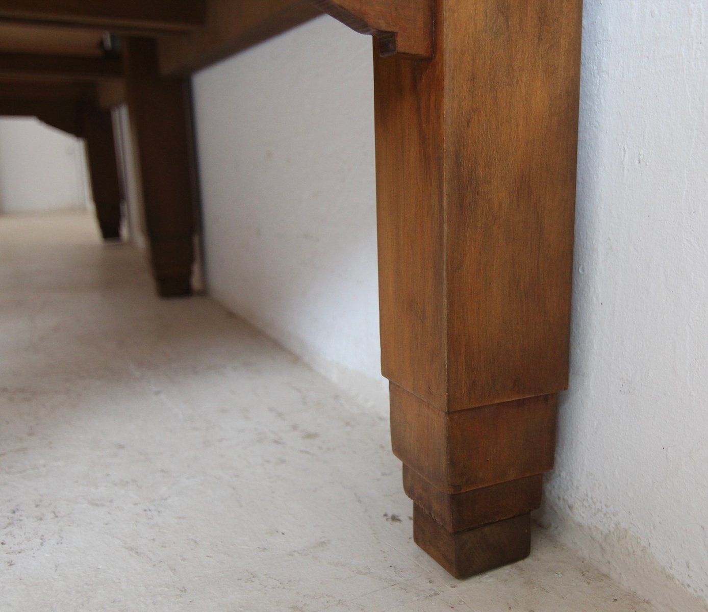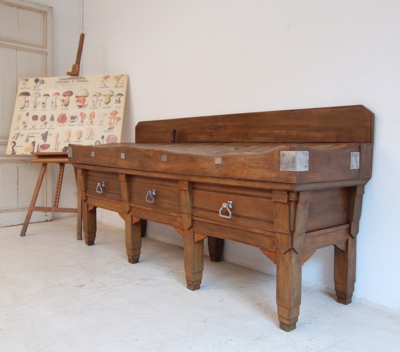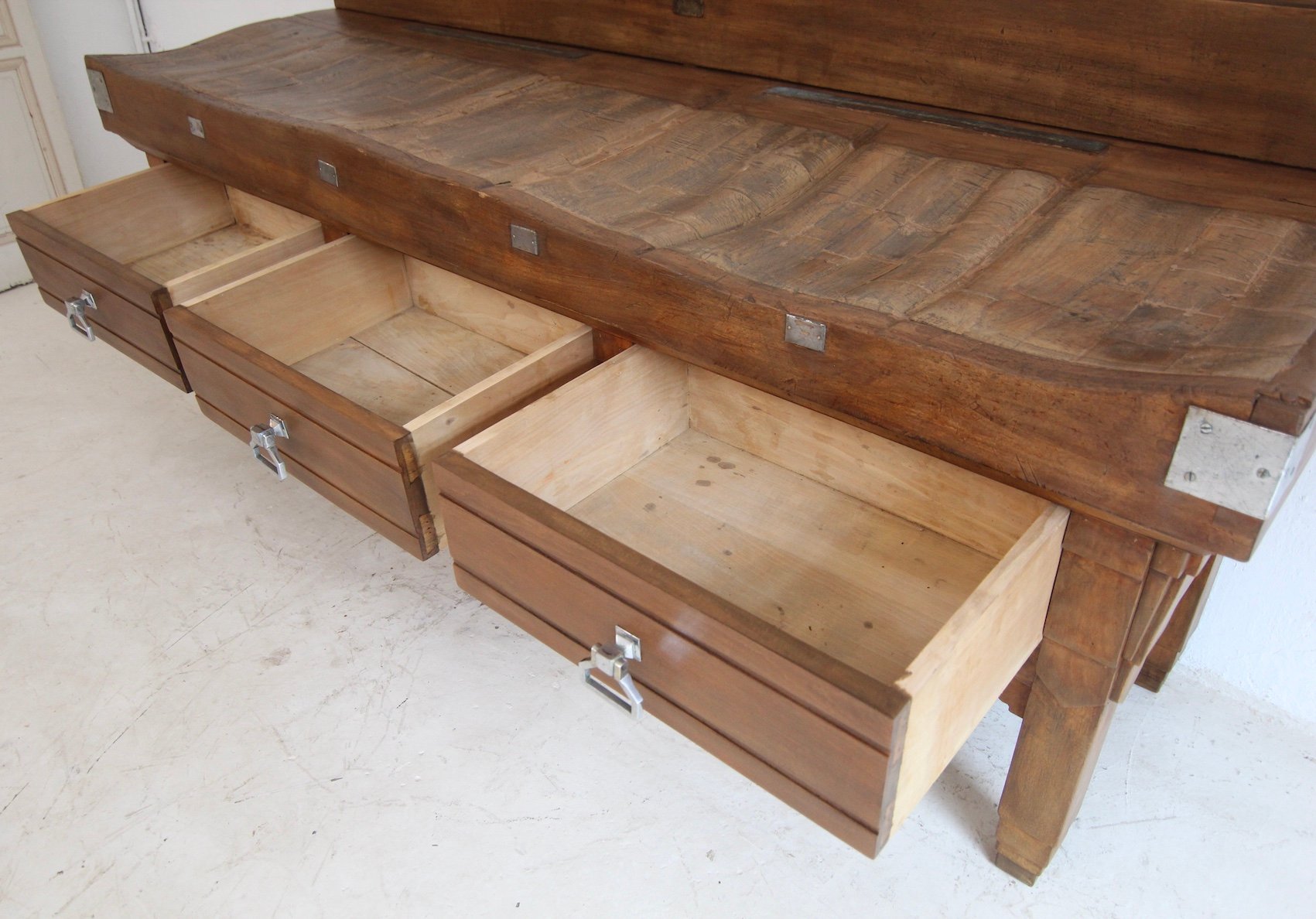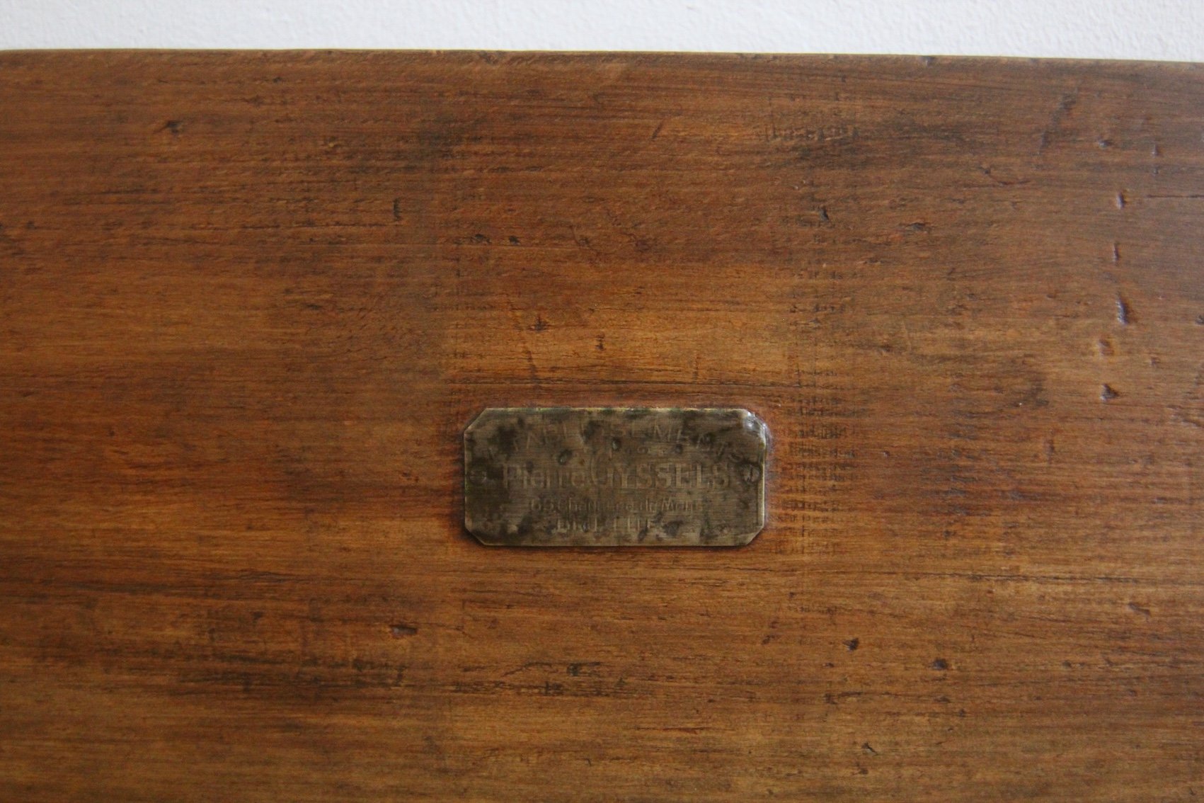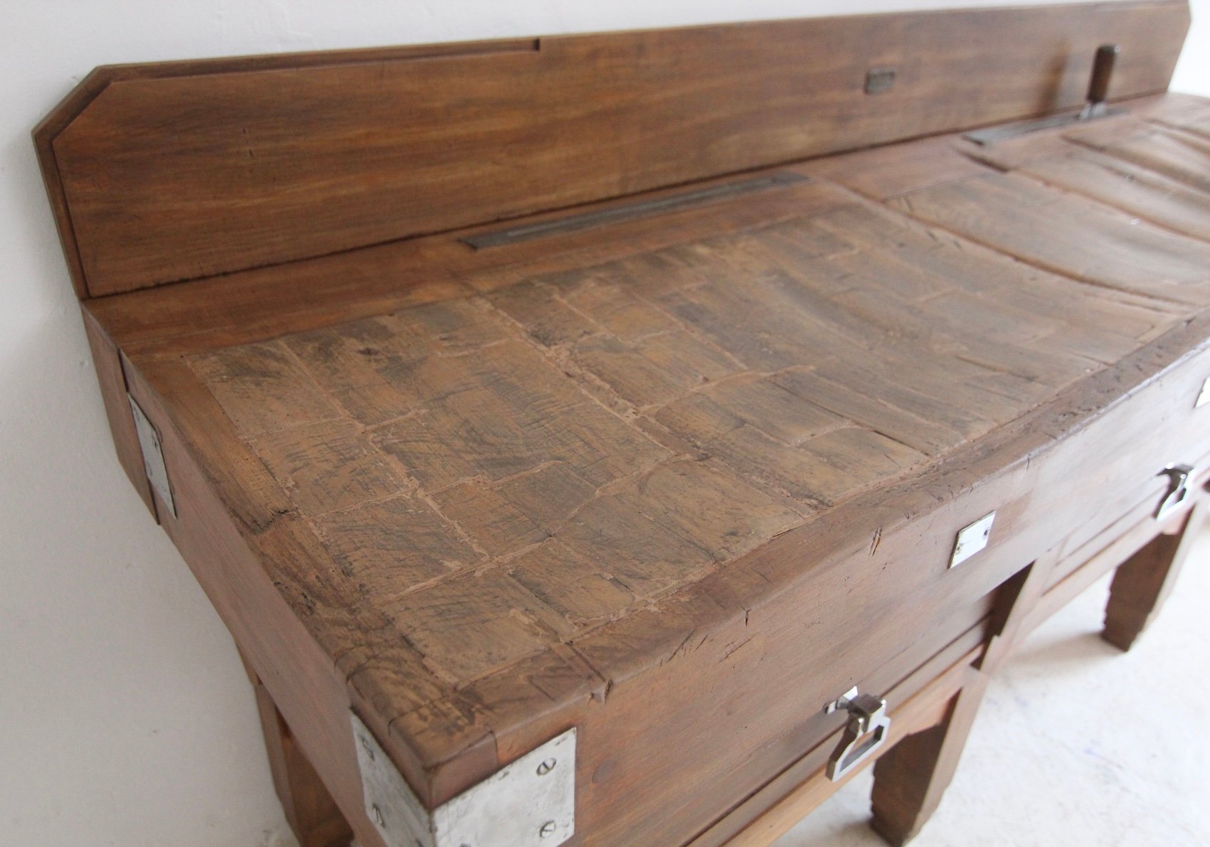 Base with 7 stepped square legs and high frame with 3 large dovetailed drawers. On top is the solid worktop, up to 17 cm thick, with 2 brass knife slots and a removable backboard. Original Art Deco handles mounted on the drawers. A brass plaque on the backboard documents the manufacturer "Pierre Gyssels" in Brussels.