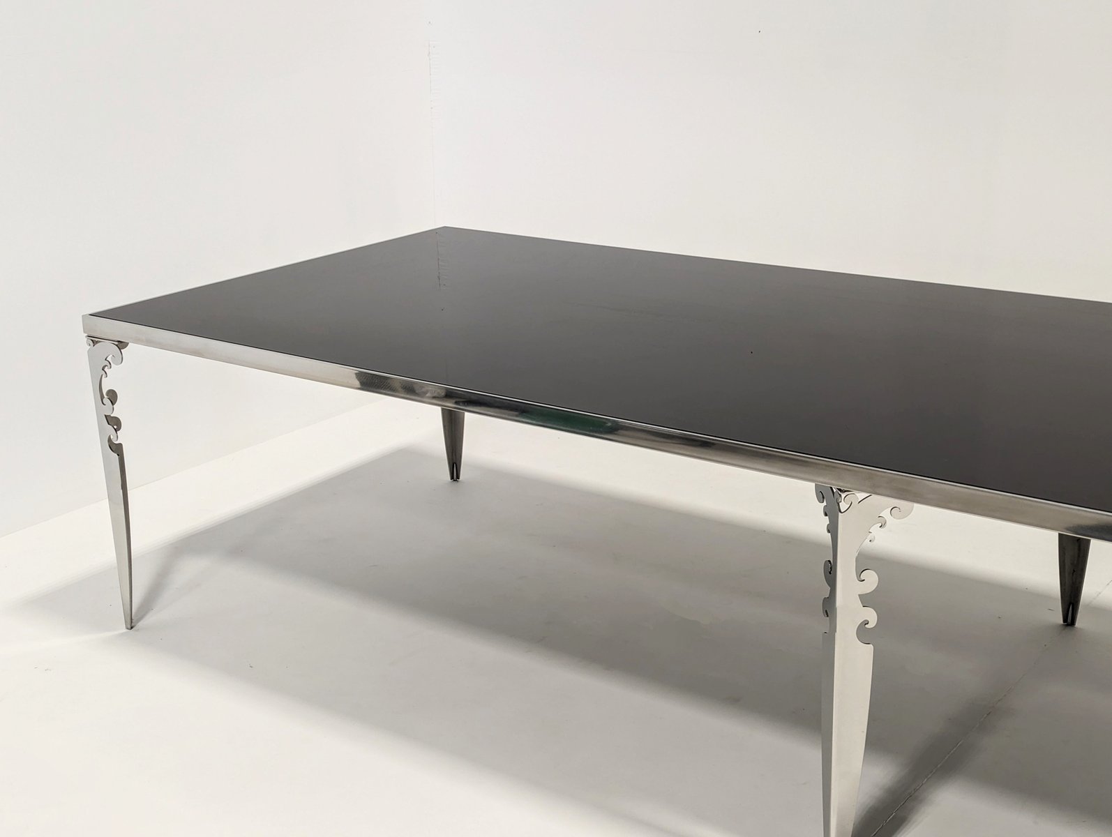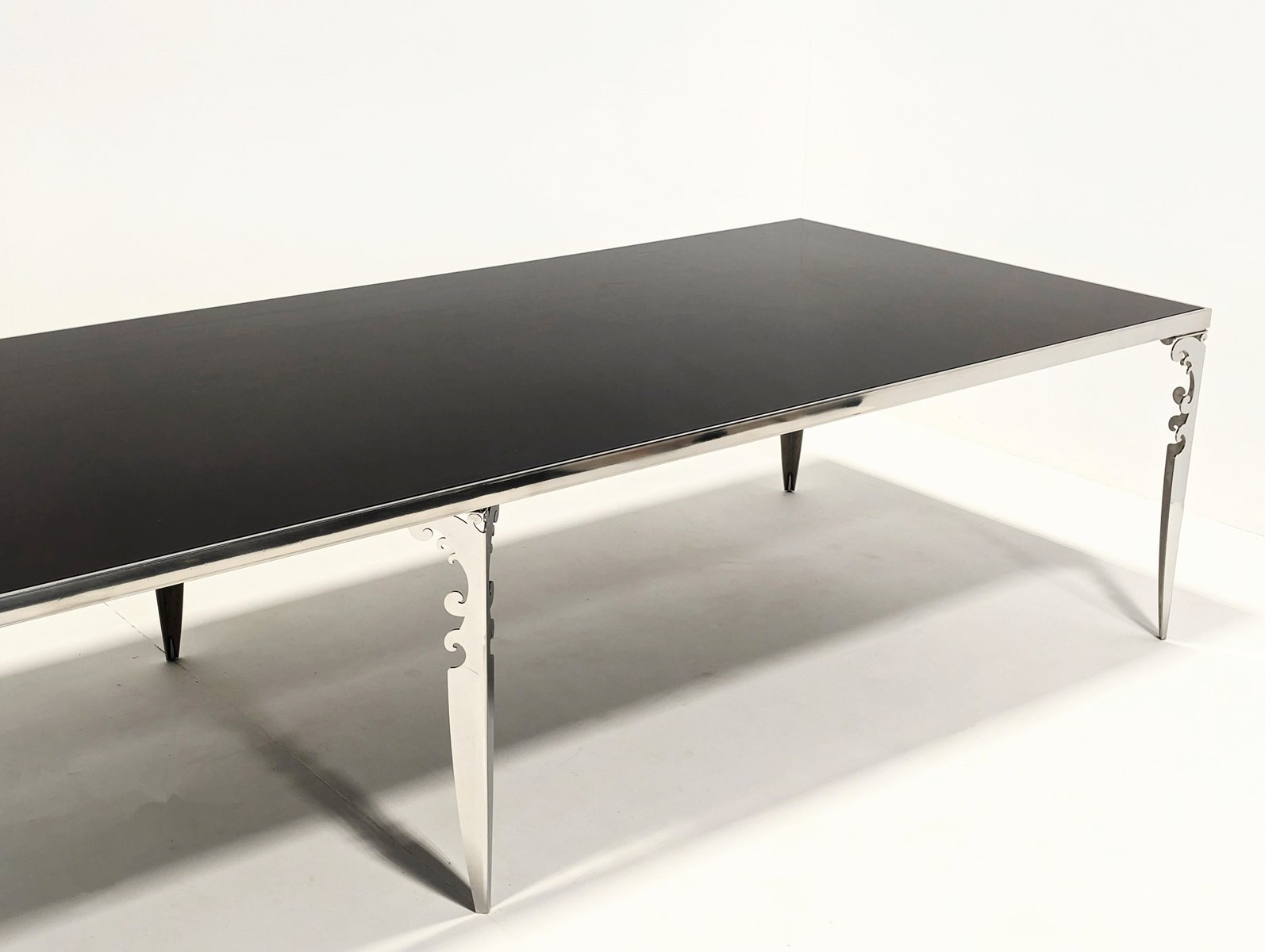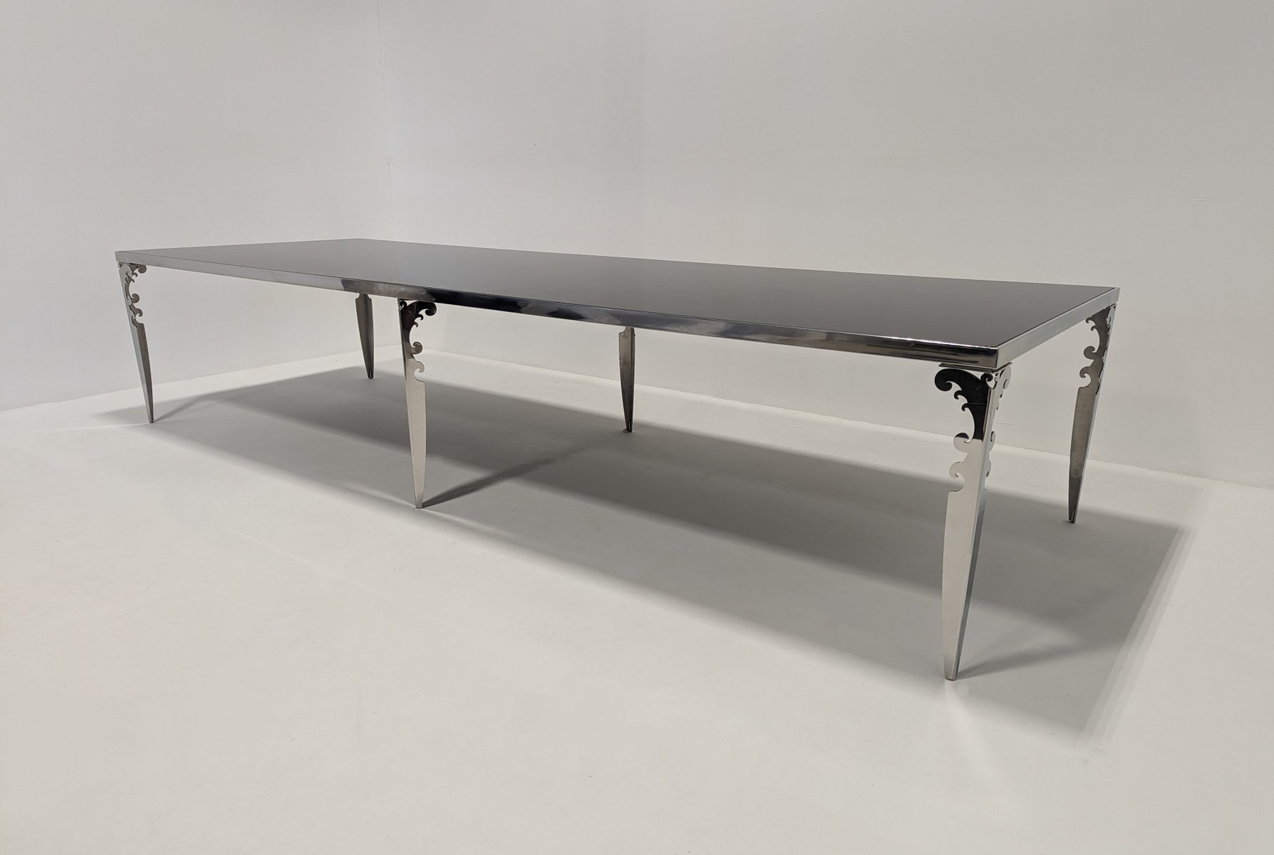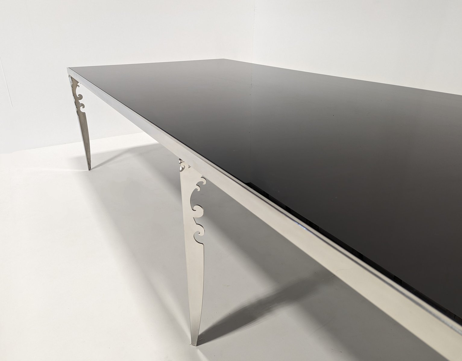 Il marchio di lusso IPE Cavalli Visionnaire crea in esclusiva prodotti che incarnano idee realizzate utilizzando tecniche di produzione derivate da diversi settori dell'artigianato tradizionale italiano. Queste tecnologie combinano la tradizione con processi di produzione all'avanguardia, caratterizzando i loro prodotti come unici e di altissima qualità. Questo splendido tavolo Camelot in vetro, che misura 3,5 m, è un tocco di eleganza per qualsiasi spazio interno di lusso, se si dispone dello spazio necessario. Rifinito con la parte inferiore nera per conferirgli un'intensità suggestiva. Specifiche del prodotto: Costo di acquisto originale: circa 20.000 sterline Condizioni: buone Marca: Visionnaire Designer: IPE Cavalli Modello: Camelot Colore: nero e argento Materiale: vetro/cromo Dimensioni: 350 cm L x 120 cm P x 73 cm A