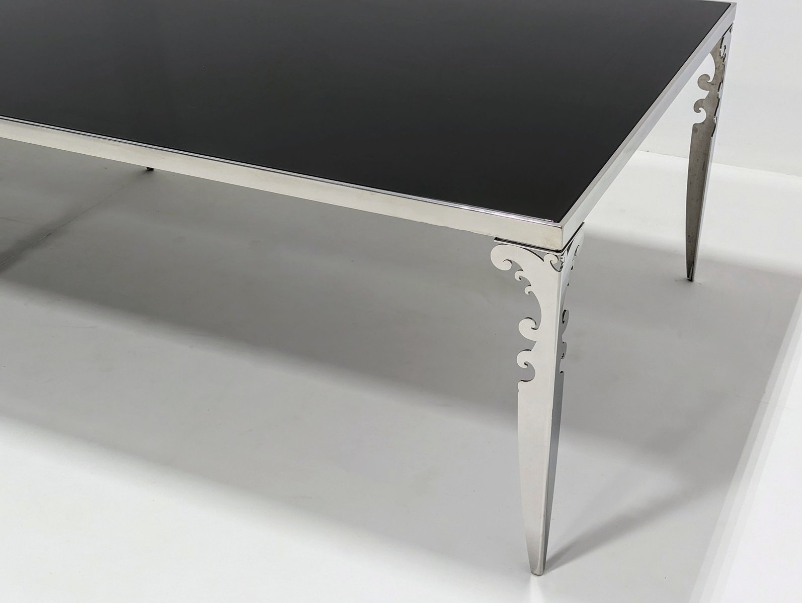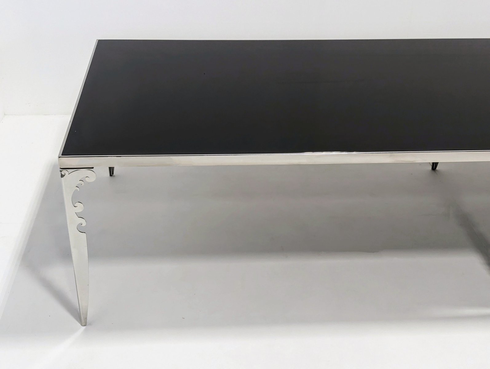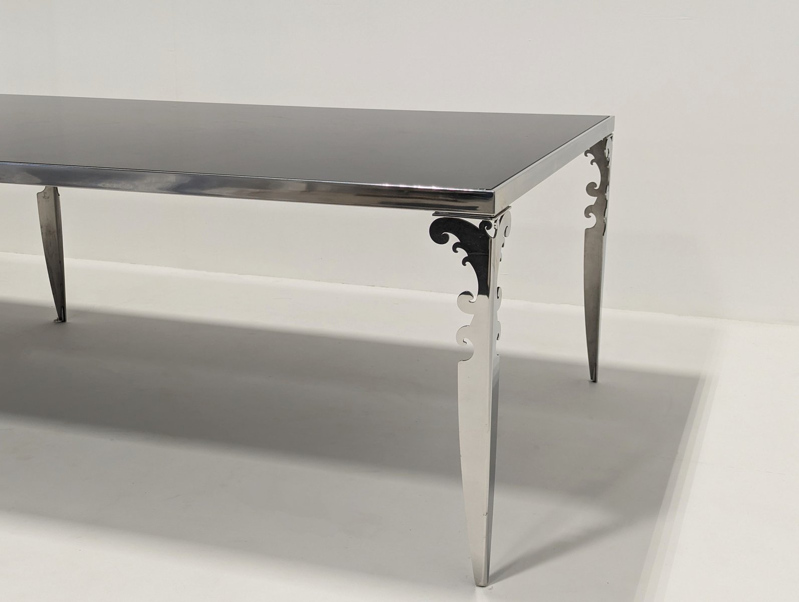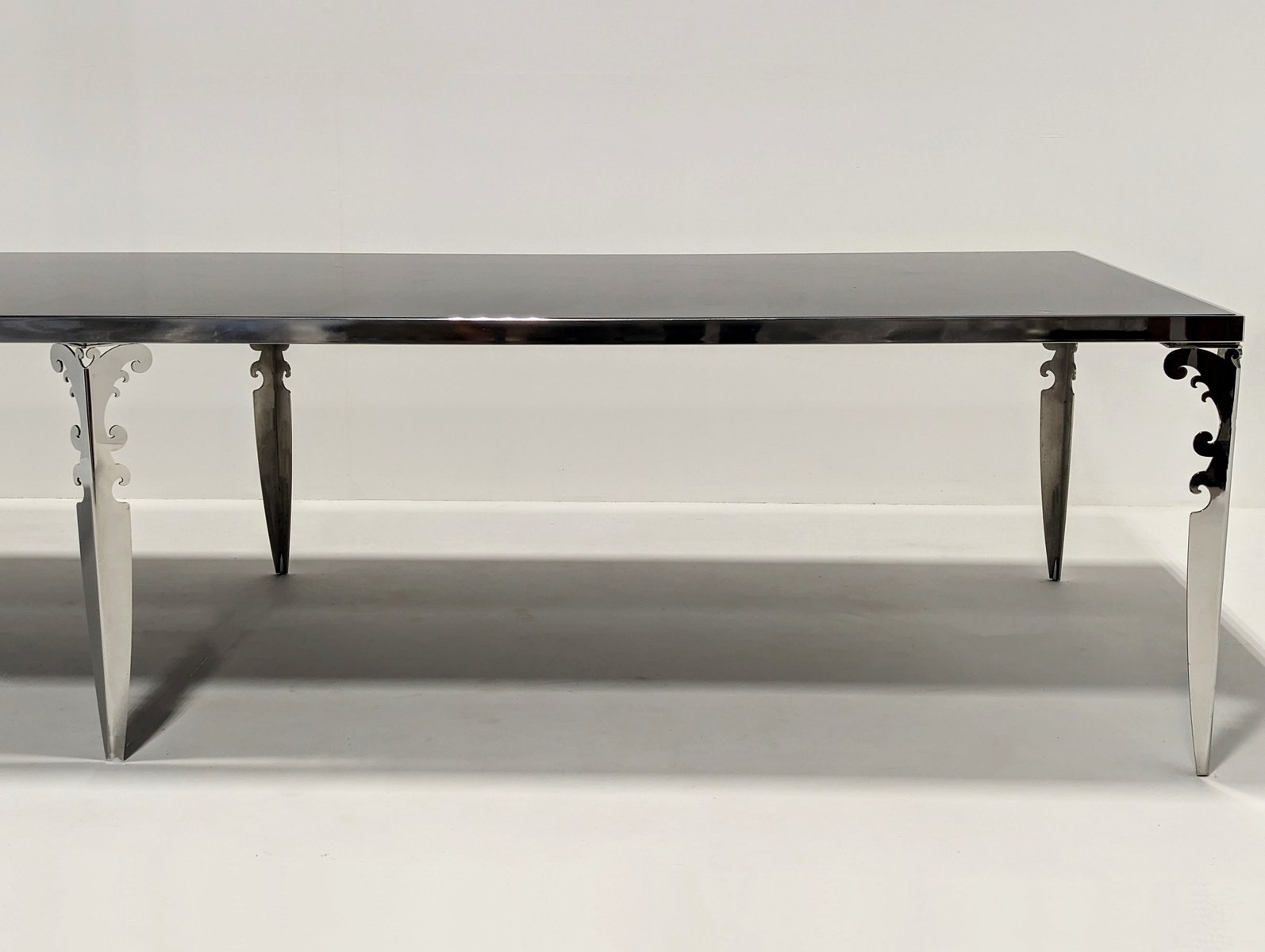 Il marchio di lusso IPE Cavalli Visionnaire crea in esclusiva prodotti che incarnano idee realizzate utilizzando tecniche di produzione derivate da diversi settori dell'artigianato tradizionale italiano. Queste tecnologie combinano la tradizione con processi di produzione all'avanguardia, caratterizzando i loro prodotti come unici e di altissima qualità. Questo splendido tavolo Camelot in vetro, che misura 3,5 m, è un tocco di eleganza per qualsiasi spazio interno di lusso, se si dispone dello spazio necessario. Rifinito con la parte inferiore nera per conferirgli un'intensità suggestiva. Specifiche del prodotto: Costo di acquisto originale: circa 20.000 sterline Condizioni: buone Marca: Visionnaire Designer: IPE Cavalli Modello: Camelot Colore: nero e argento Materiale: vetro/cromo Dimensioni: 350 cm L x 120 cm P x 73 cm A
