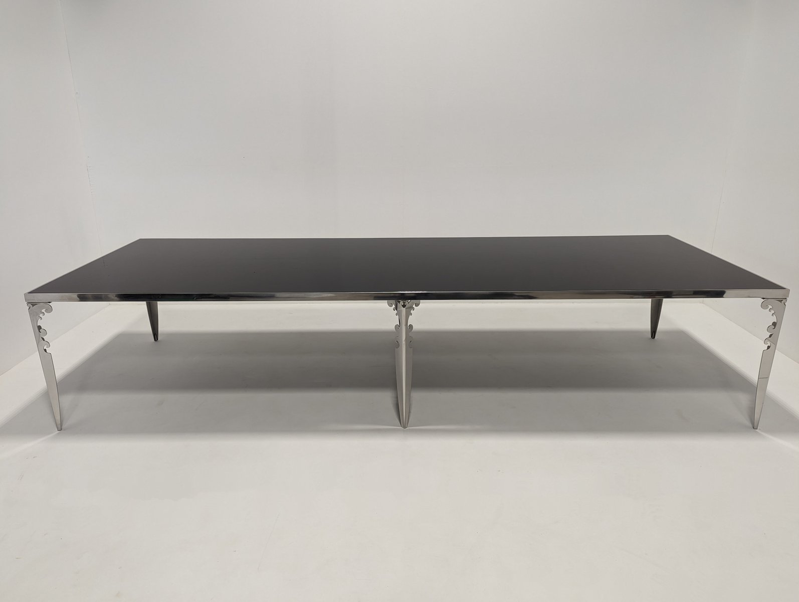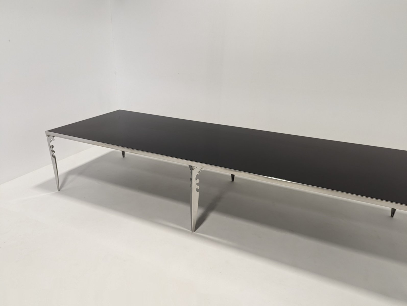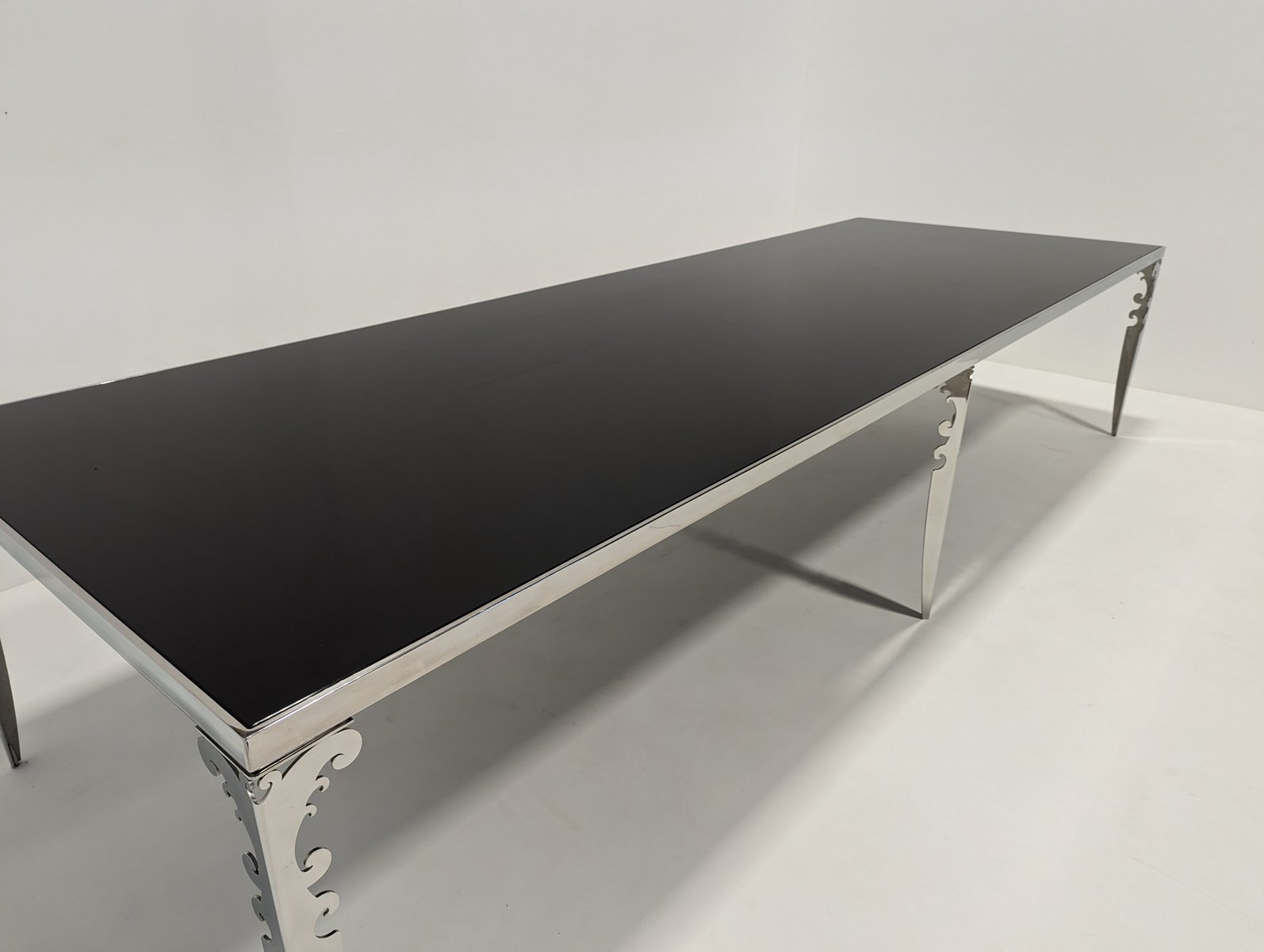 This beautiful Glass Camelot table, measuring in at 3.5m is an elegant touch to any luxury interior space, if you have the room. Finished with black underside to give it its moody intensity.