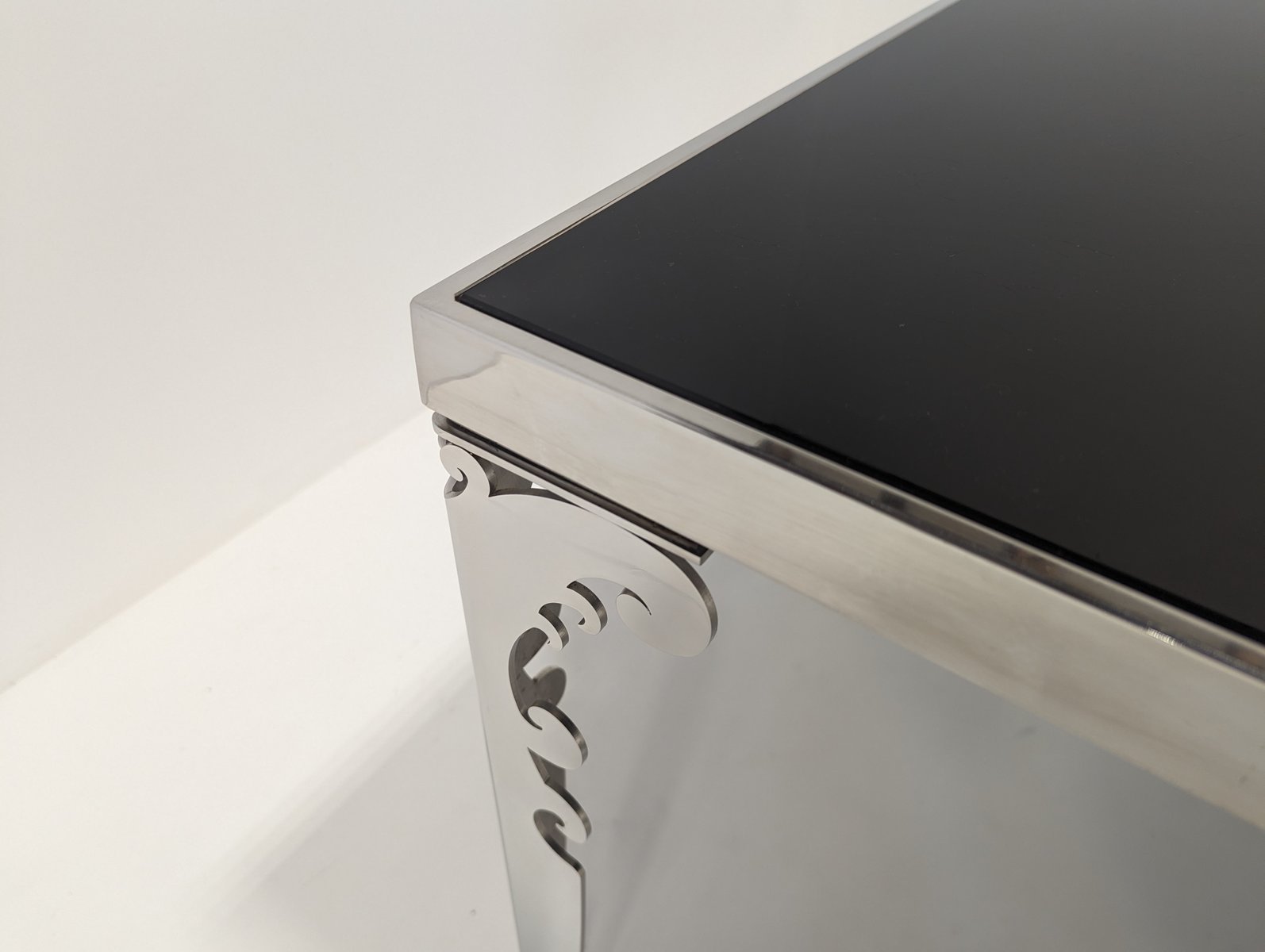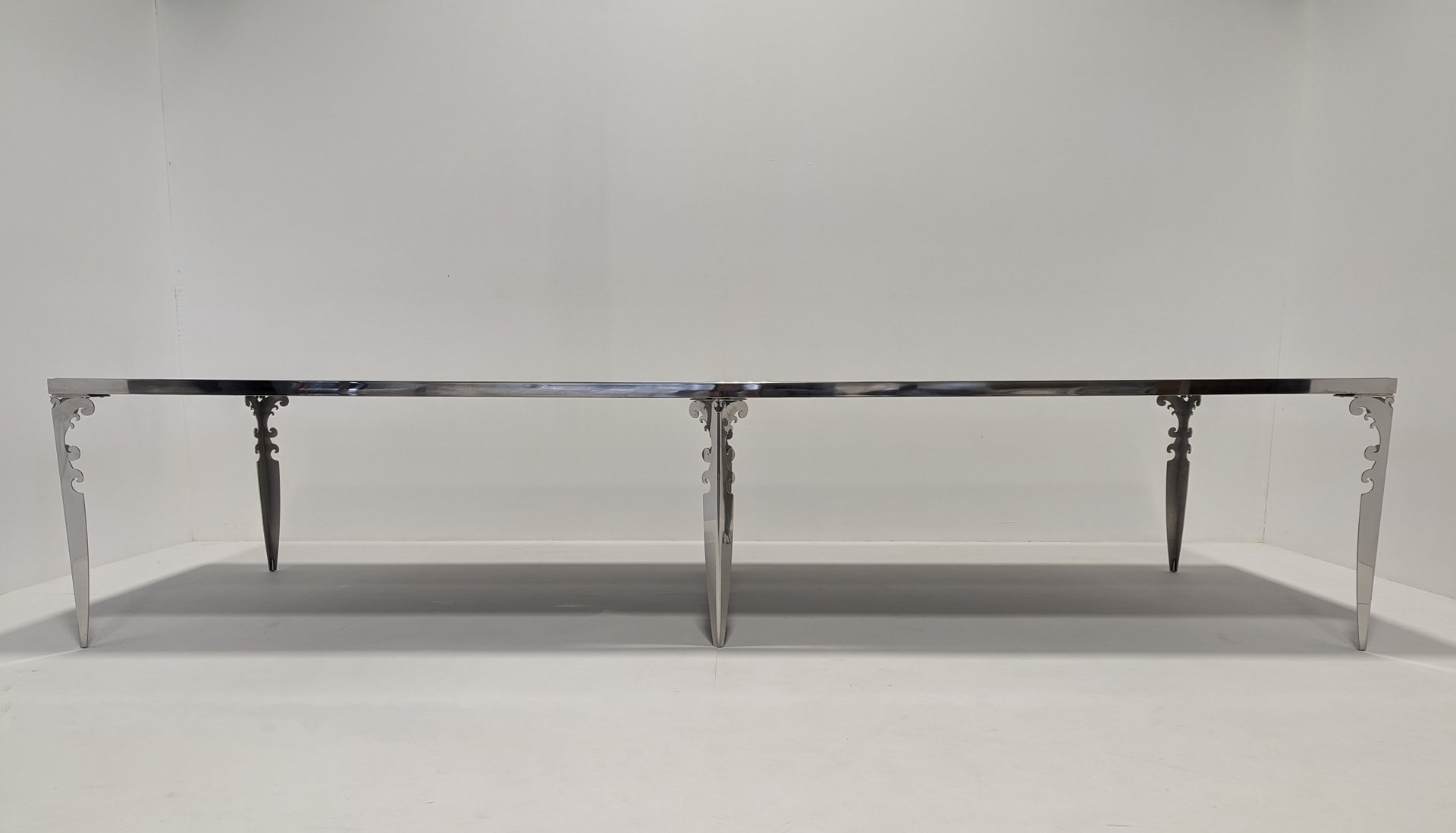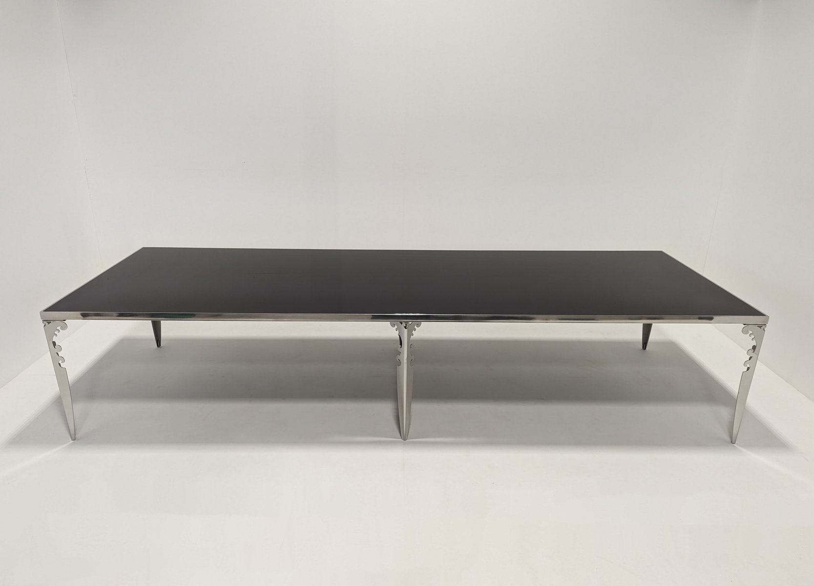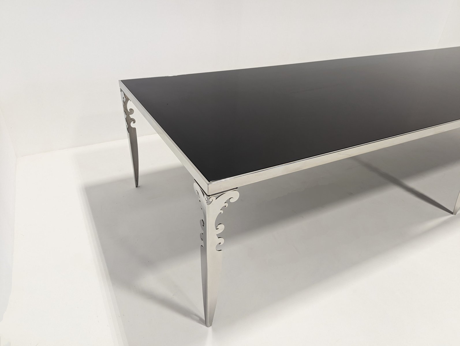 This beautiful Glass Camelot table, measuring in at 3.5m is an elegant touch to any luxury interior space, if you have the room. Finished with black underside to give it its moody intensity.