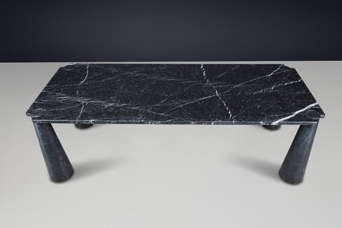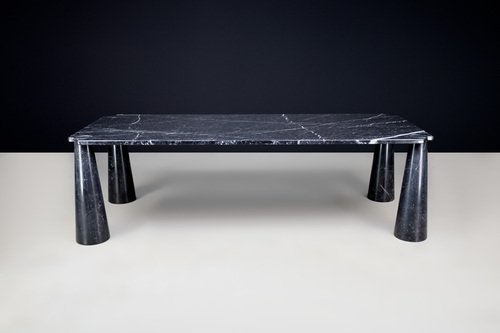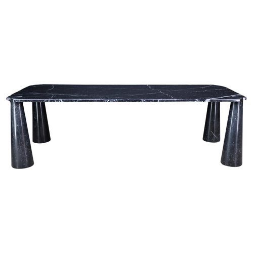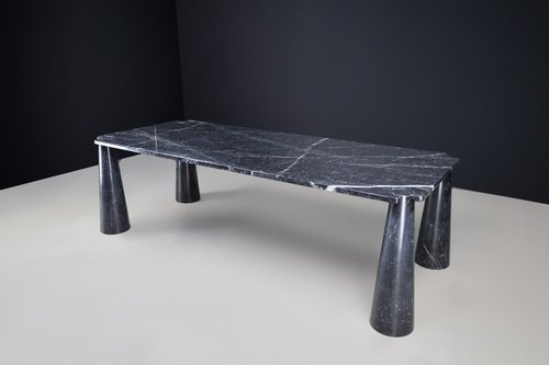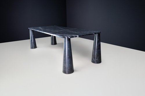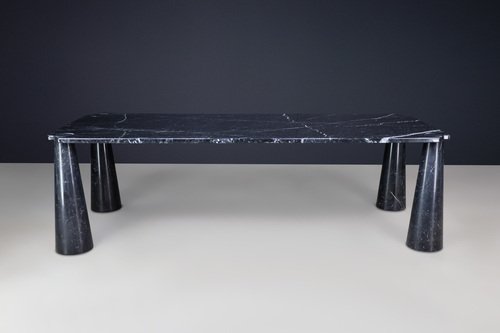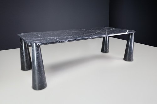 Angelo Mangiarotti for Skipper 'Eros,' large rectangular dining table or executive desk in black Marquina Marble, Italy, the 1970s. This stunning sculptural table, designed by Angelo Mangiarotti, showcases exceptional postmodern design. It is crafted from Nero Marquina Marble and is distinguished by its unique architectural shape. Four cone-shaped legs support the table, and its construction relies on gravity. The top of the table secures itself onto the marble cones placed in the corners, held in position by the weight of the material. The Nero Marquina Marble displays intricate veining with natural, gentle curves, creating an elegant and contemporary dining table. This larger rectangular table was part of the original 1970s production for Skipper, as confirmed by the original Skipper label attached underneath. This remarkable table is in good condition and will undoubtedly make a distinctive and beautiful addition to any space for many years. Dimensions: 240 x 100 x 72 h cm.