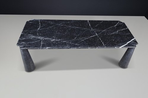 Angelo Mangiarotti per Skipper "Eros", grande tavolo da pranzo rettangolare o scrivania direzionale in marmo nero Marquina, Italia, anni Settanta. Questo splendido tavolo scultoreo, disegnato da Angelo Mangiarotti, è una dimostrazione di eccezionale design postmoderno. È realizzato in Marmo Nero Marquina e si distingue per la sua forma architettonica unica. Quattro gambe a forma di cono sostengono il tavolo e la sua costruzione si basa sulla gravità. Il piano del tavolo si fissa sui coni di marmo posti agli angoli, tenuti in posizione dal peso del materiale. Il marmo Nero Marquina presenta venature intricate con curve naturali e dolci, creando un tavolo da pranzo elegante e contemporaneo. Questo tavolo rettangolare più grande faceva parte della produzione originale degli anni Settanta per Skipper, come conferma l'etichetta originale Skipper attaccata sotto. Questo notevole tavolo è in buone condizioni e sarà senza dubbio un'aggiunta distintiva e bella a qualsiasi spazio per molti anni. Dimensioni: 240 x 100 x 72 h cm.