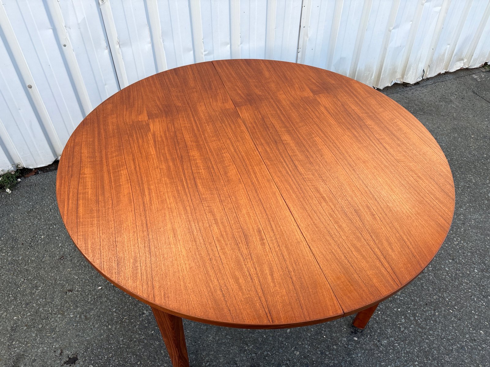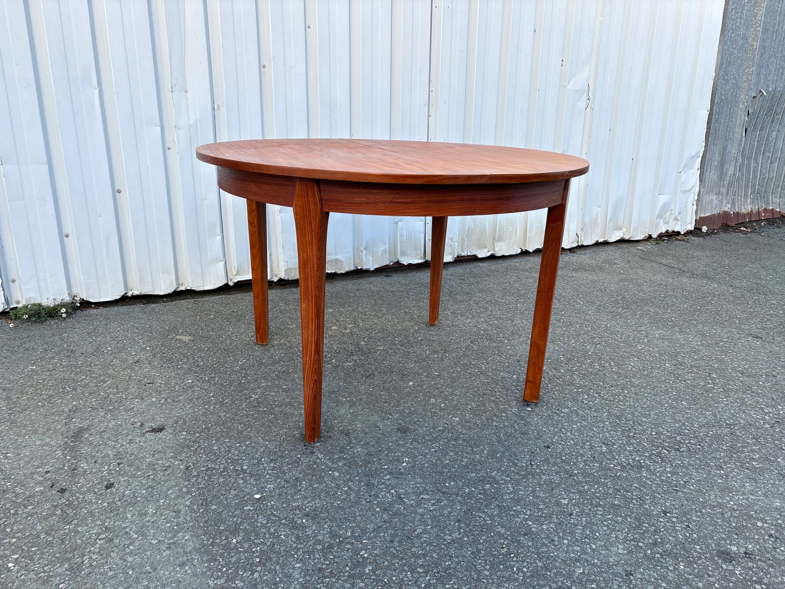 Il tavolo presenta un generoso piano circolare con splendide venature calde, che poggia su quattro gambe leggermente affusolate e sottilmente ricurve. Il grembiule dolcemente arrotondato e le proporzioni riflettono l'alta qualità artigianale tipica dei mobili nordici della metà del secolo.