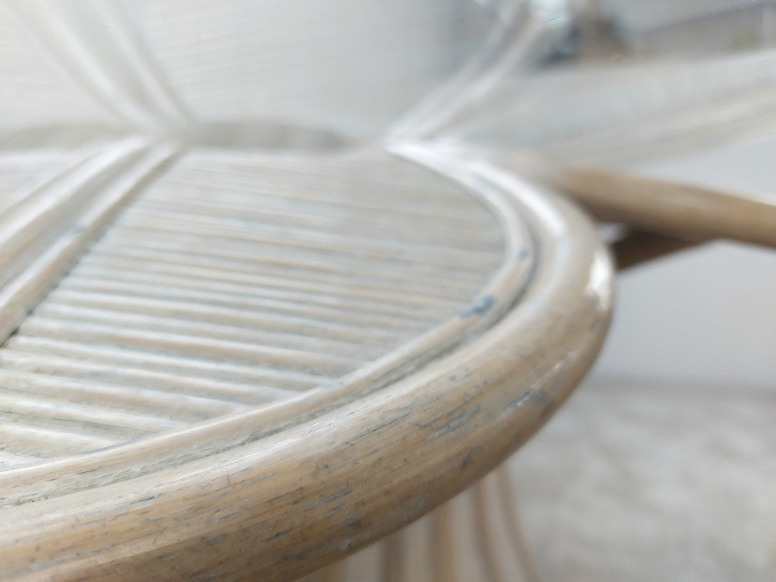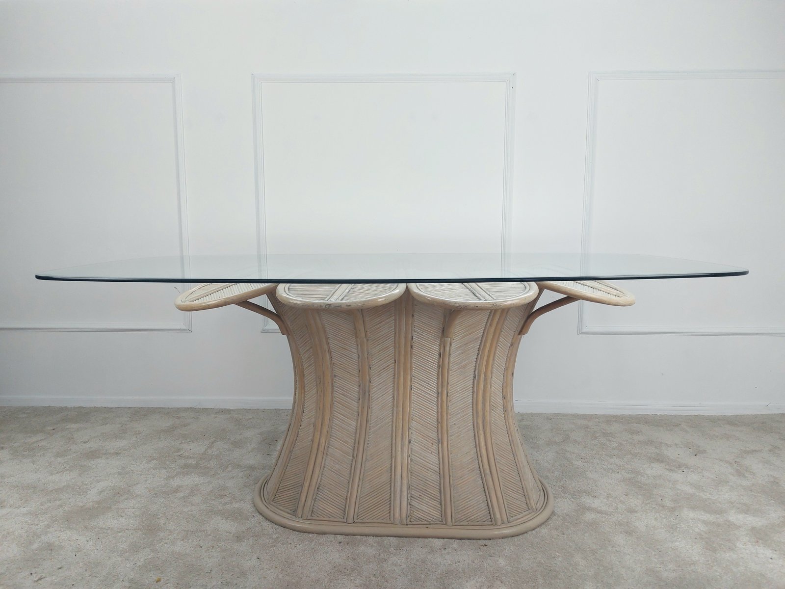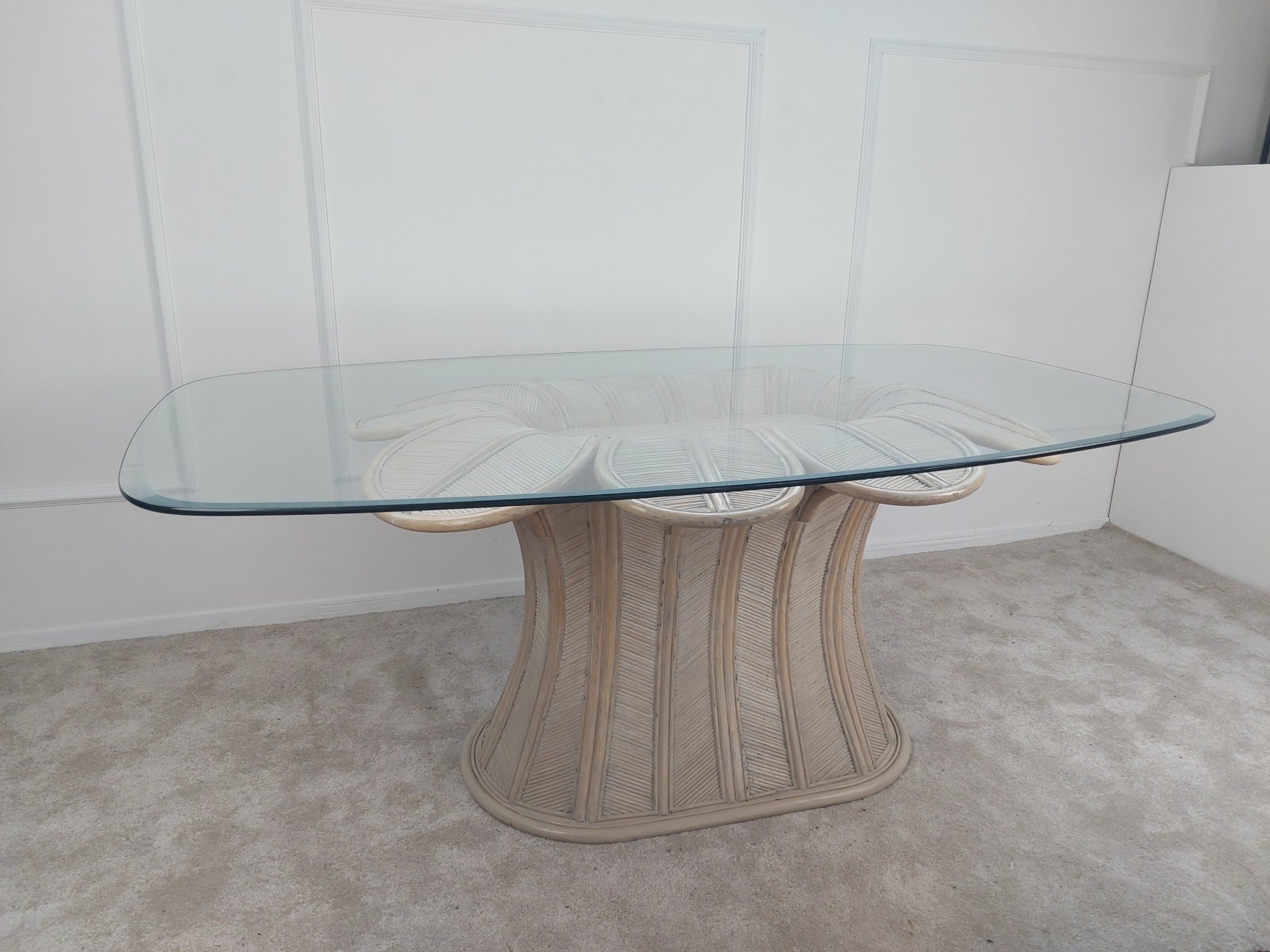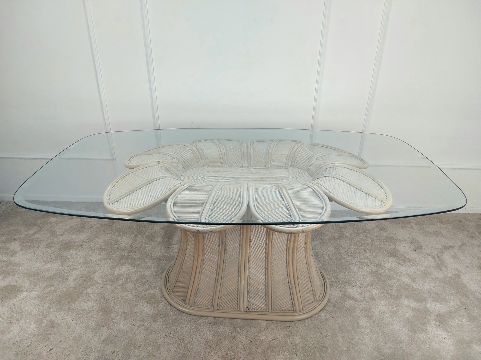 La base in rattan intrecciato (canna da zucchero) forma un fiore stilizzato, un vero e proprio centrotavola decorativo. Lo spesso piano in vetro rettangolare con angoli arrotondati mette in risalto la raffinata lavorazione artigianale e conferisce un senso di leggerezza all'insieme.