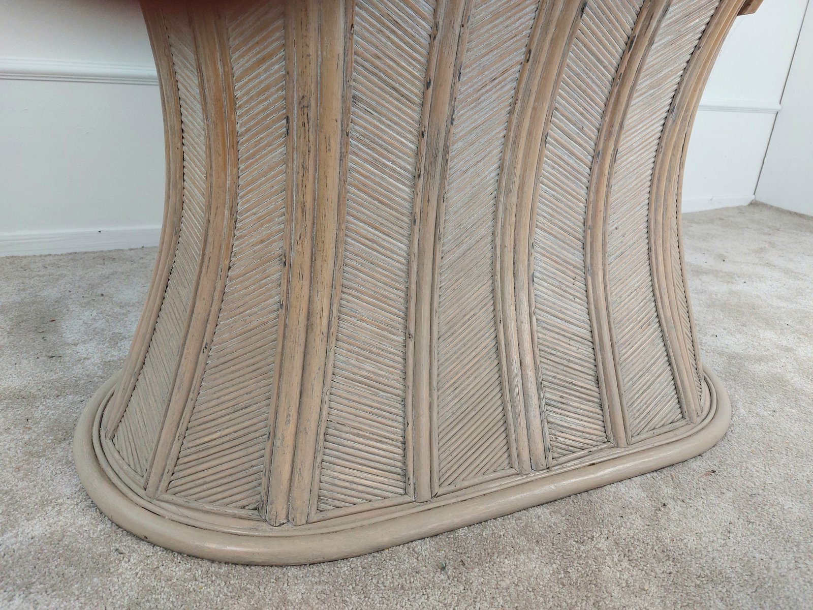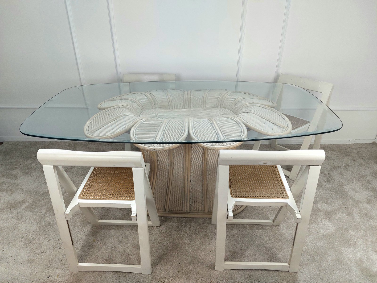 Its woven rattan base (pencil reed) forms a stylized flower, a true decorative centerpiece. The thick, rectangular glass top with rounded corners highlights the fine craftsmanship and brings a sense of lightness to the overall effect.