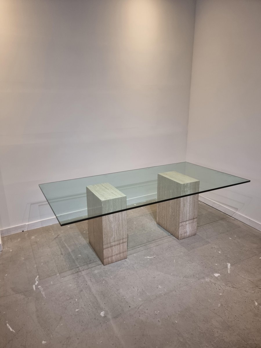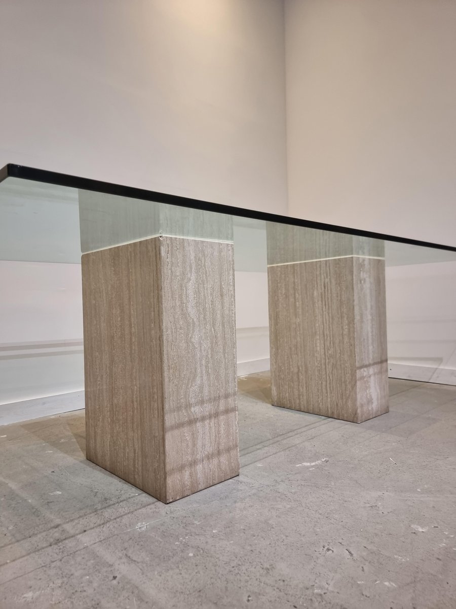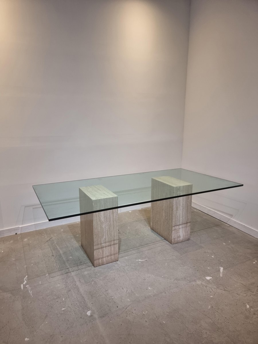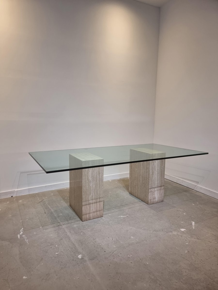 Tavolo da pranzo in travertino con ripiano in vetro, Italia, anni '70
