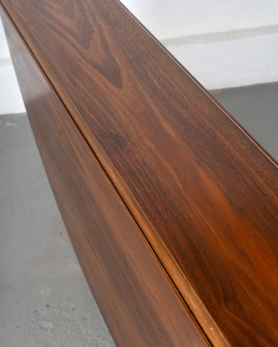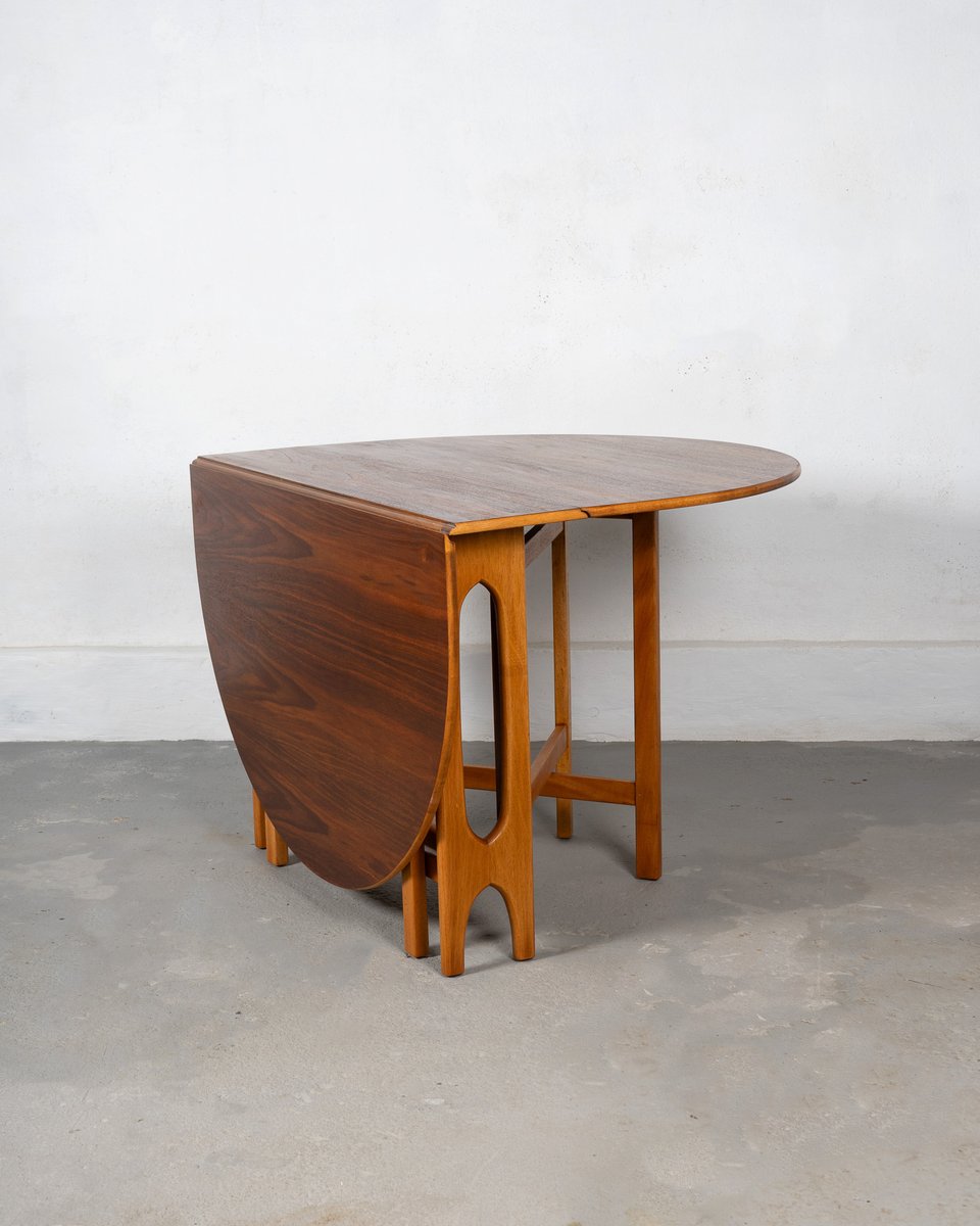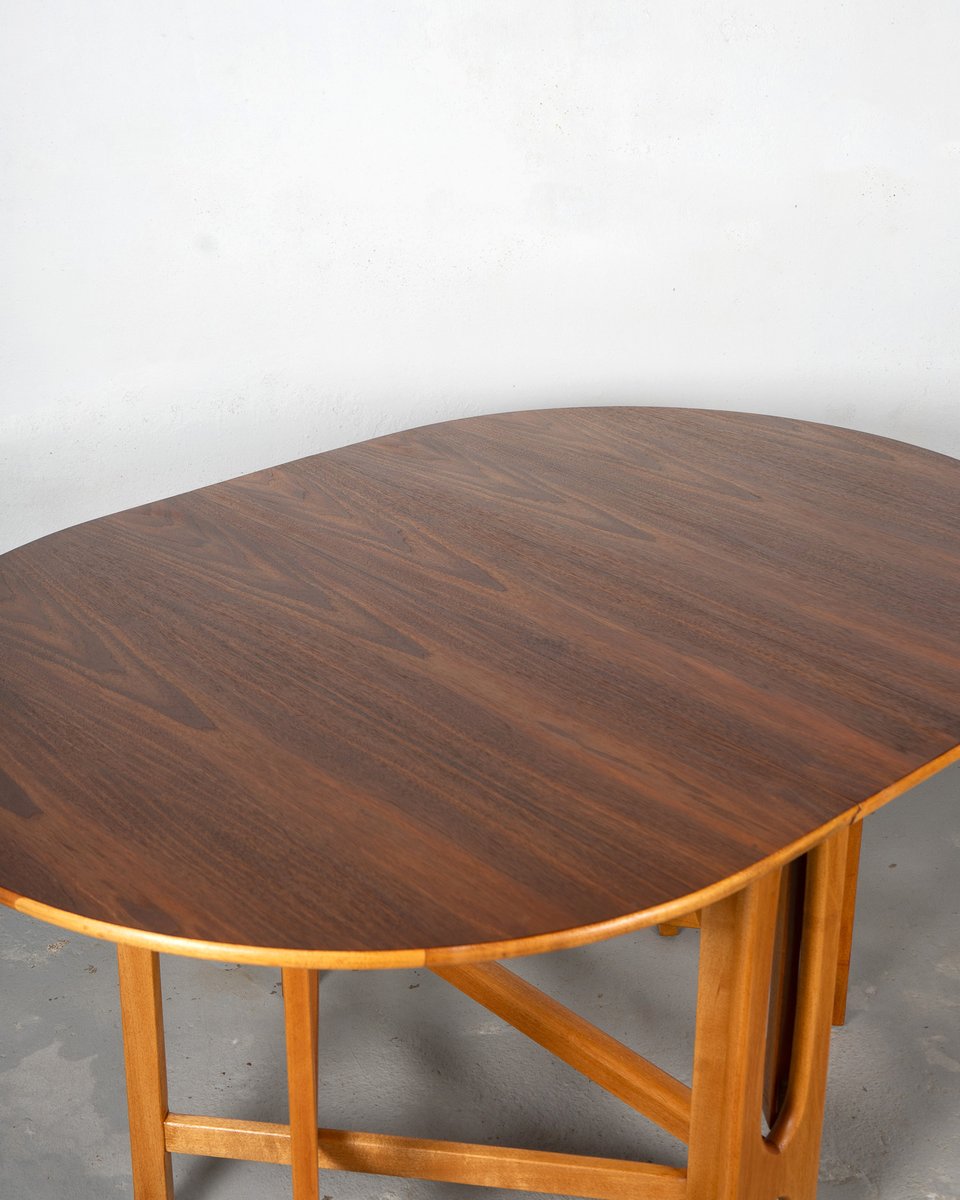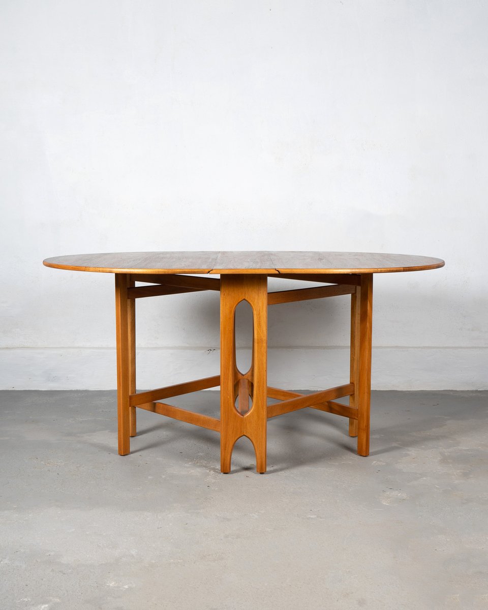 Tavolo da pranzo pieghevole Ellipse modello nr. 2 di Bendt Winge per l'azienda norvegese Kleppes Møbelfabrikk. È stato prodotto tra gli anni '50 e '60, anni in cui il designer ha collaborato con il marchio nella progettazione di numerosi tavoli da pranzo pieghevoli di squisita fattura e funzionalità.