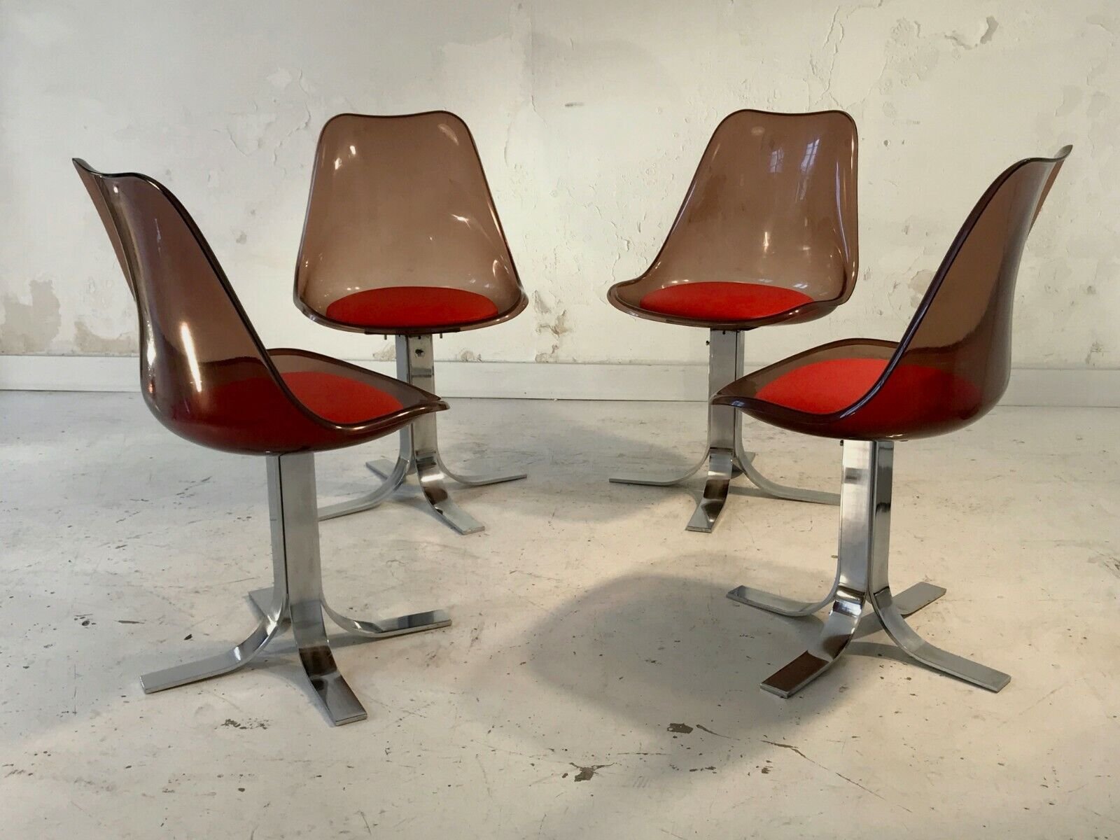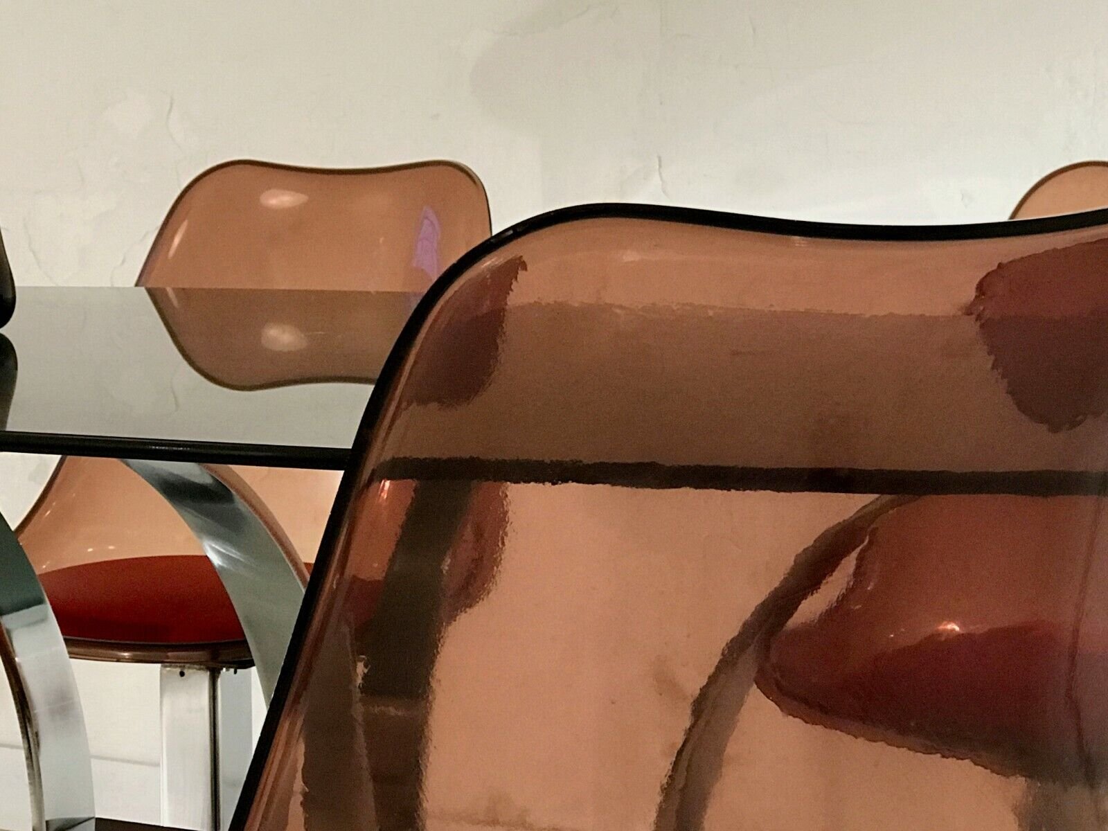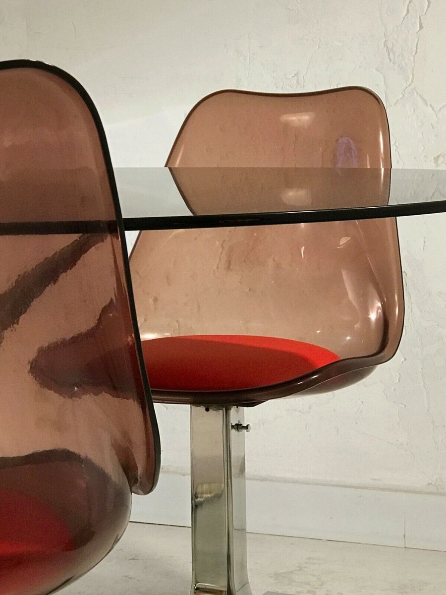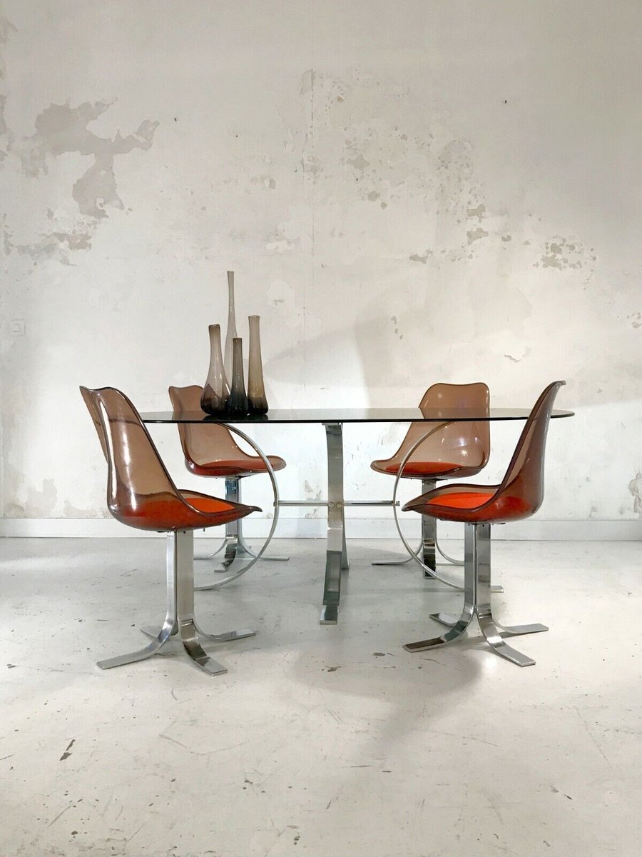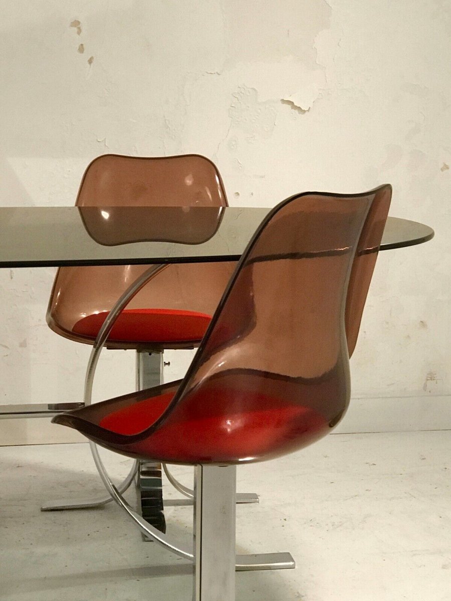 Spettacolare set composto da un grande tavolo da pranzo e 4 sedie, in stile Post-Modernista, Space-Age, Shabby-Chic, struttura del tavolo in metallo cromato spesso e pesante, piano in vetro ovoidale incamiciato, 4 sedie con basi a doghe in metallo cromato spesso e pesante e sedute in vetro acrilico ambrato con cuscinetti in pelle rossa, da attribuire, Francia 1970.