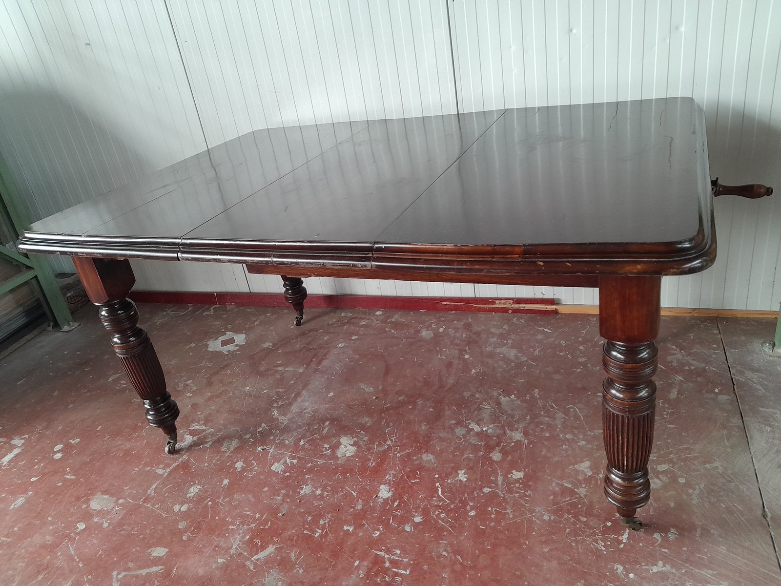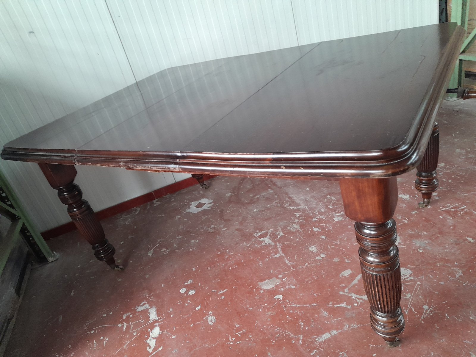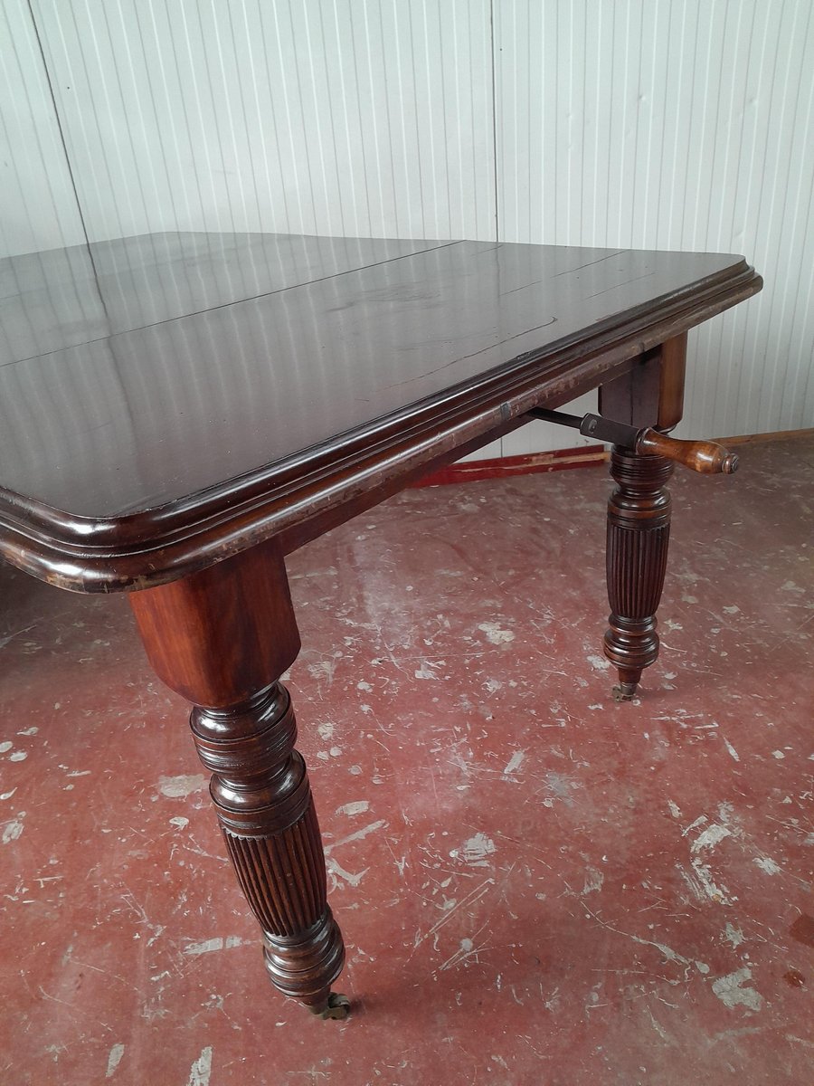 A square-formed Victorian extending dining table, likely crafted from mahogany, (likely because i am not a wood expert) featuring substantial turned and reeded legs. The top exhibits a rich, polished dark finish, and the table is equipped with a mechanism for inserting additional leaves, visible from the underside, to expand its length. The legs terminate in brass castors, supporting the table's mobility. The construction is sturdy, characteristic of the period's craftsmanship.