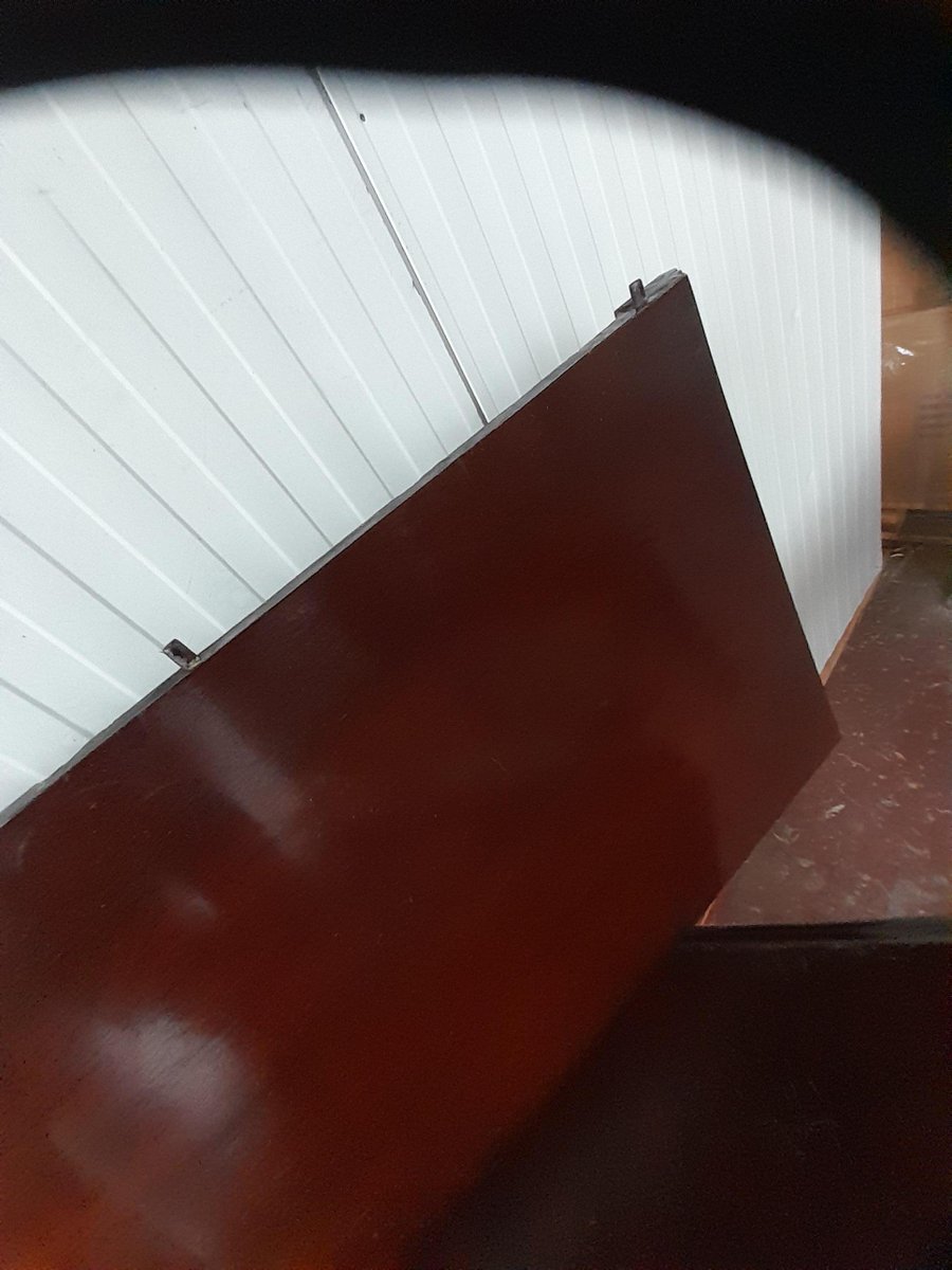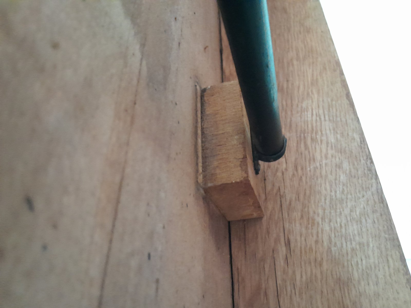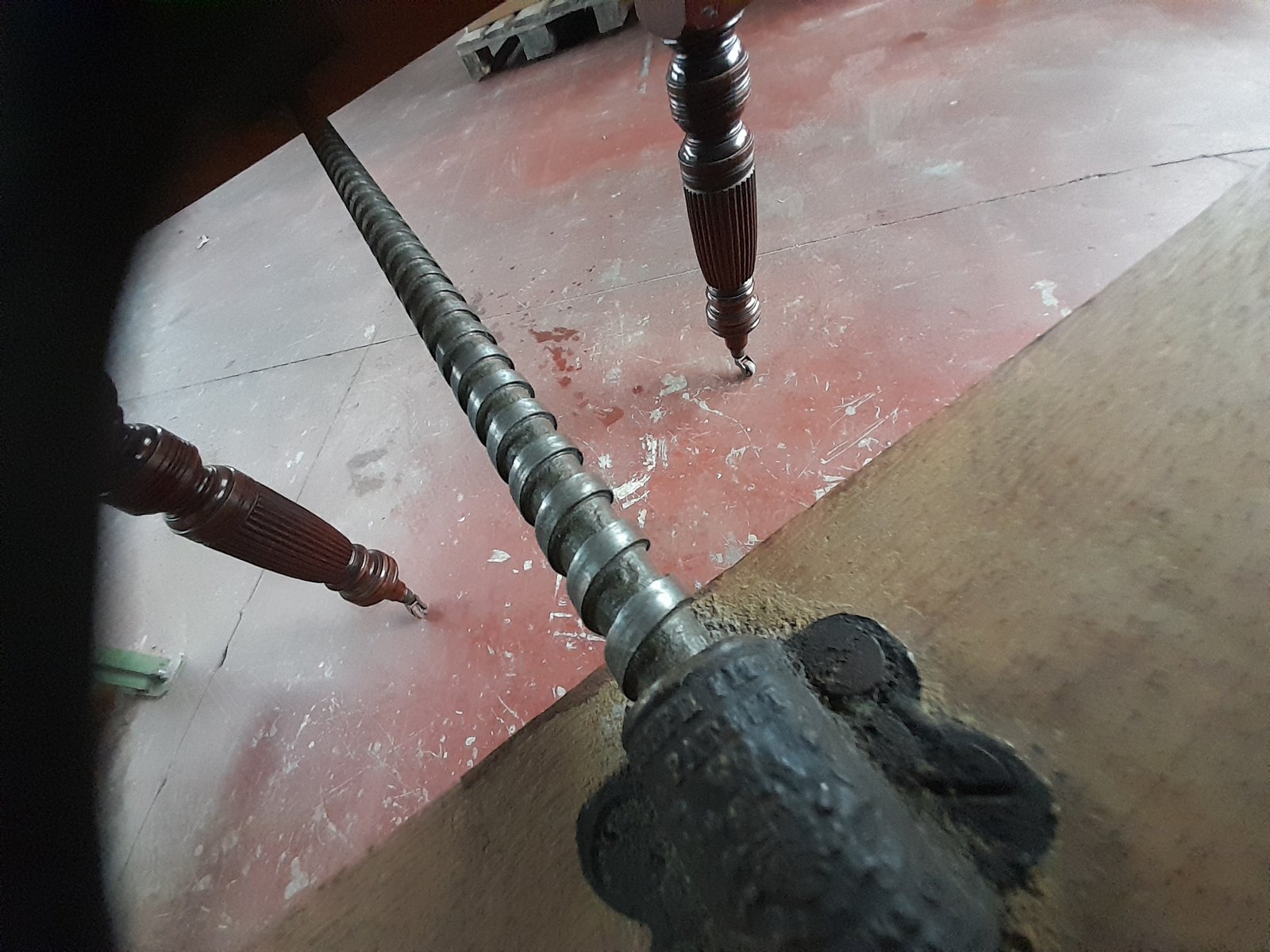 The table has minor wear on the polished surface of the top, including light scratches and scuffs. The structural components underneath appear solid, incl. some expected dust and grime from age. The castors are present and are functional.