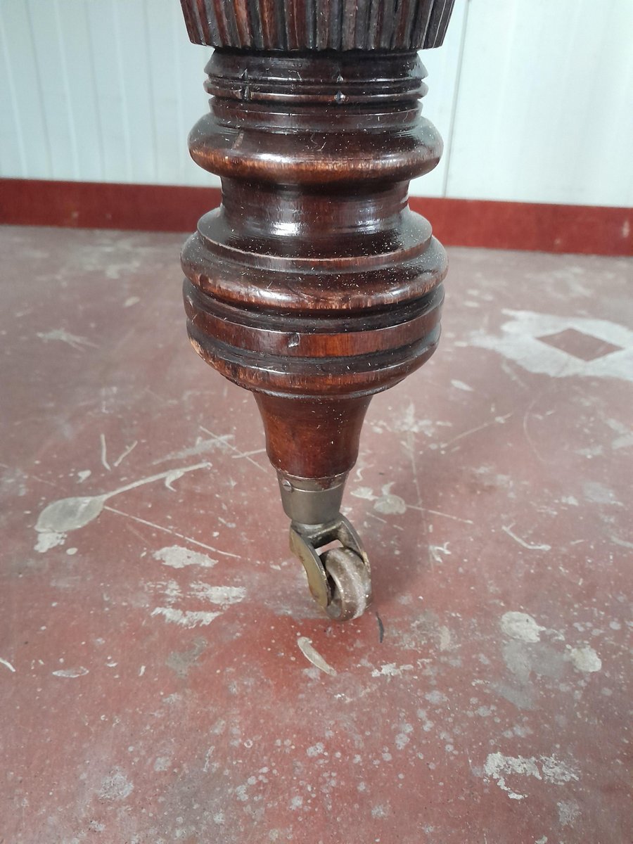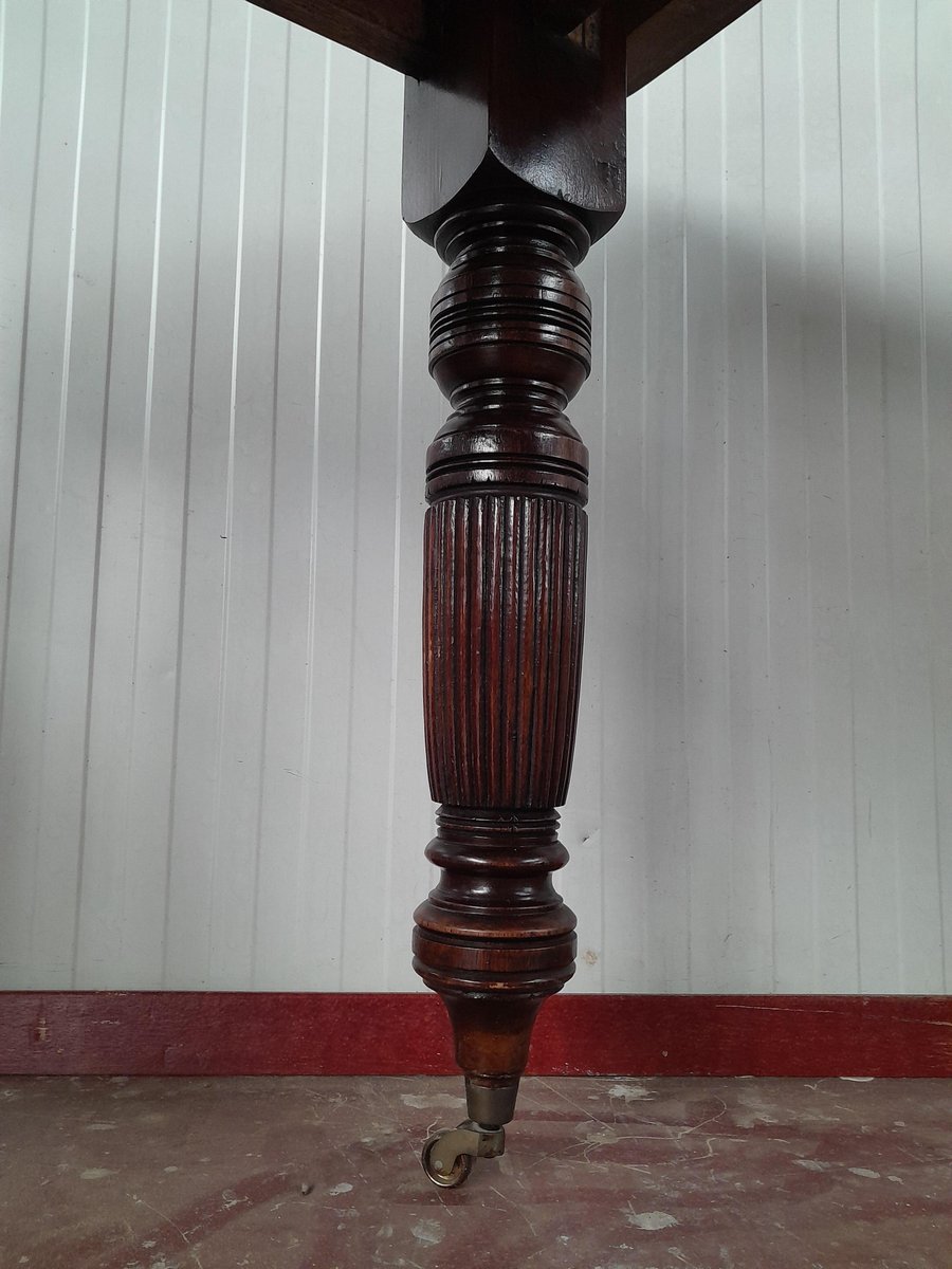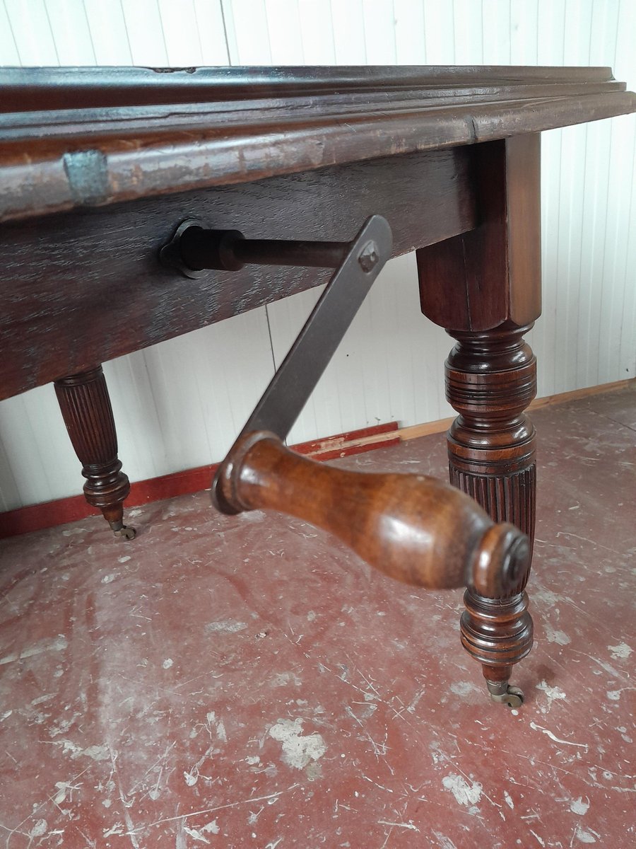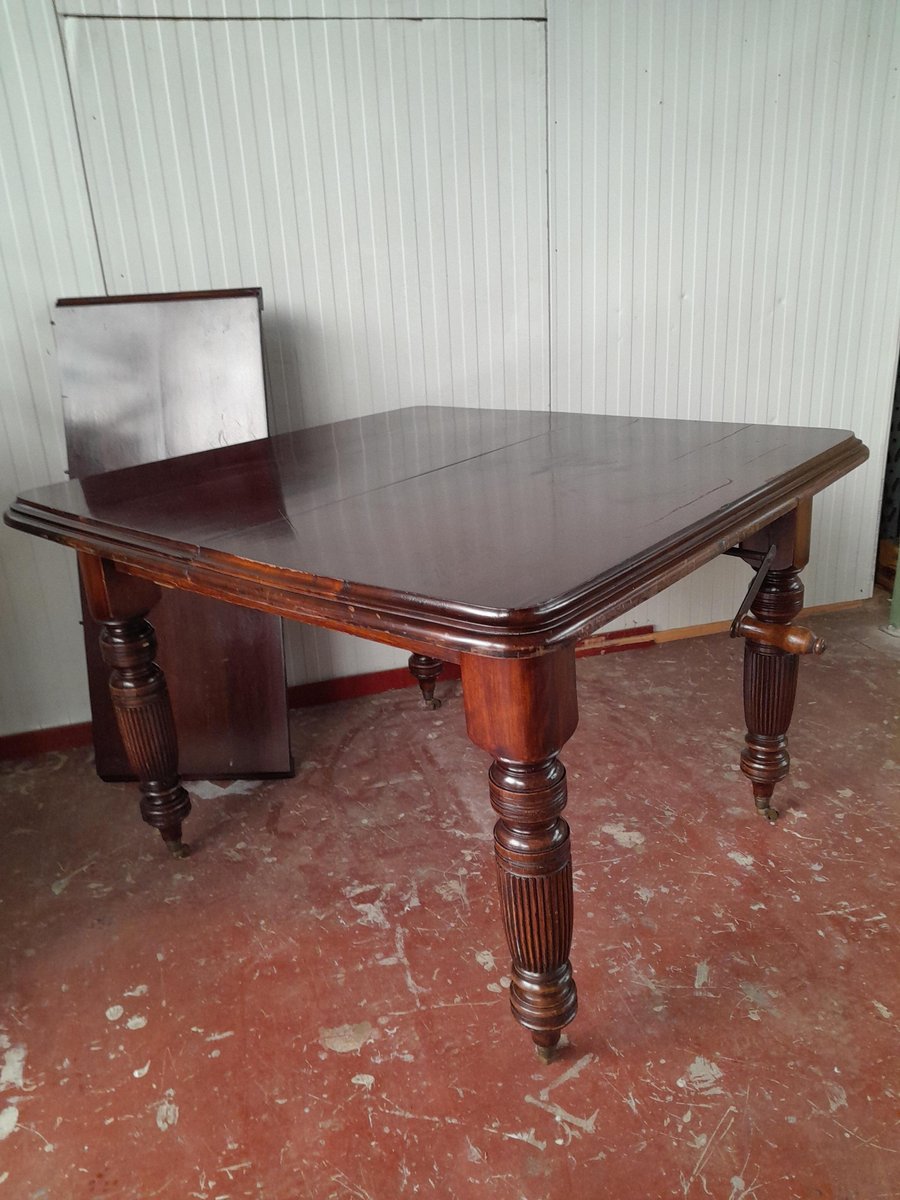 Tavolo da pranzo vittoriano allungabile di forma quadrata, probabilmente realizzato in mogano (probabilmente perché non sono un esperto di legno), caratterizzato da gambe tornite e scanalate. Il piano presenta una ricca finitura scura lucida e il tavolo è dotato di un meccanismo per l'inserimento di prolunghe aggiuntive, visibili dalla parte inferiore, per aumentarne la lunghezza. Le gambe terminano con rotelle in ottone, che ne facilitano la mobilità. La struttura è robusta, caratteristica dell'artigianato dell'epoca.