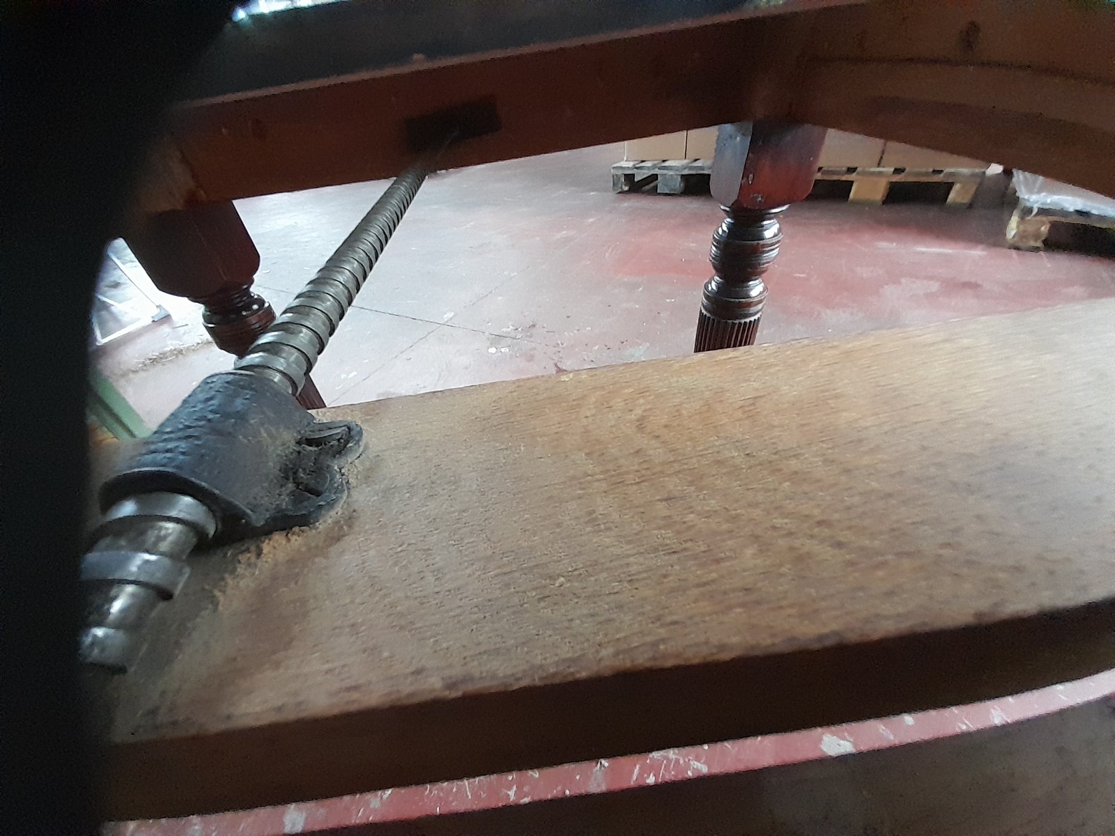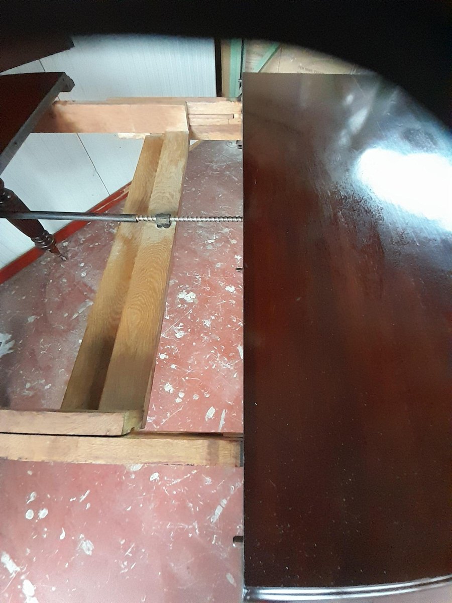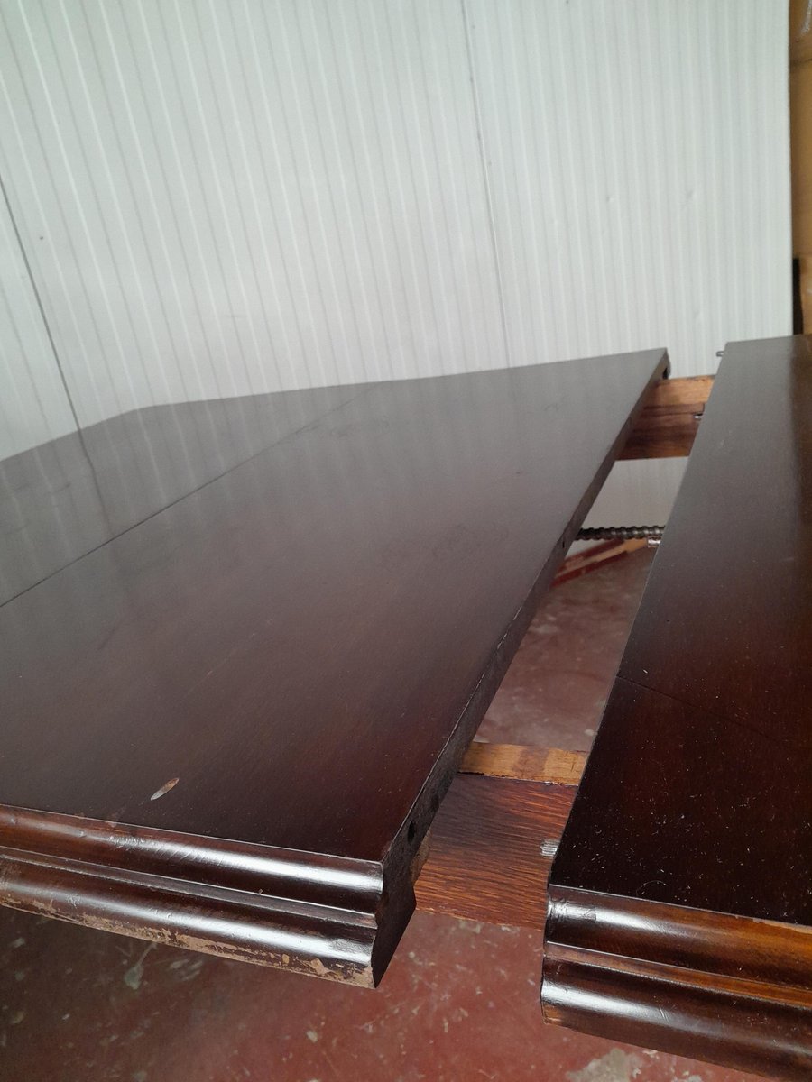Tavolo da pranzo vittoriano allungabile di forma quadrata, probabilmente realizzato in mogano (probabilmente perché non sono un esperto di legno), caratterizzato da gambe tornite e scanalate. Il piano presenta una ricca finitura scura lucida e il tavolo è dotato di un meccanismo per l'inserimento di prolunghe aggiuntive, visibili dalla parte inferiore, per aumentarne la lunghezza. Le gambe terminano con rotelle in ottone, che ne facilitano la mobilità. La struttura è robusta, caratteristica dell'artigianato dell'epoca.