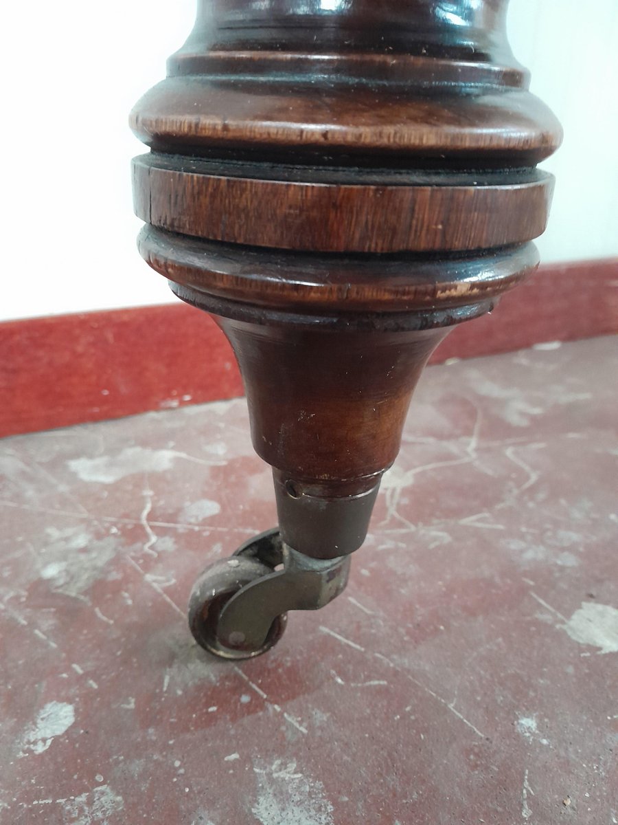 Superficie Il piano del tavolo ha una finitura lucida, scura e levigata, probabilmente laccata o verniciata, che presenta lievi segni di usura superficiale e alcuni graffi leggeri compatibili con l'età e l'uso. Le gambe hanno una lucentezza satinata che rivela le venature del legno e i dettagli intagliati. Peso e sensazione al tatto Date le sue dimensioni e la struttura in legno massiccio, questo tavolo è piuttosto consistente e pesante, e richiede almeno due persone per essere spostato. Le rotelle in ottone indicano un'intenzione di moderata mobilità.