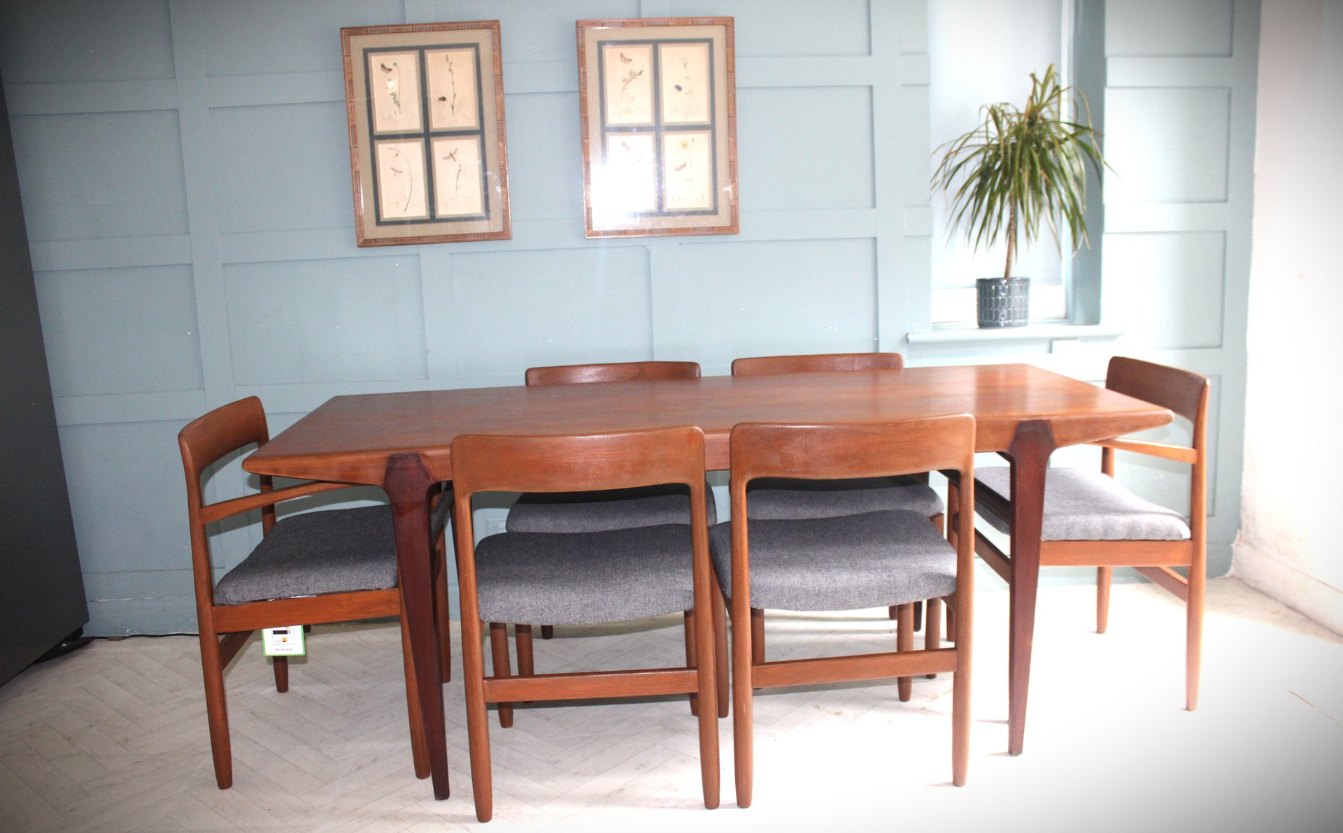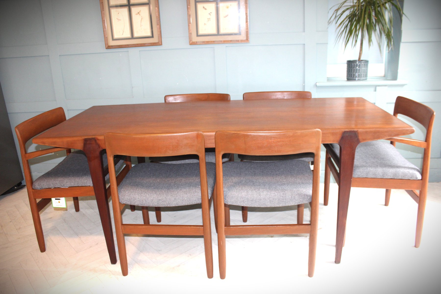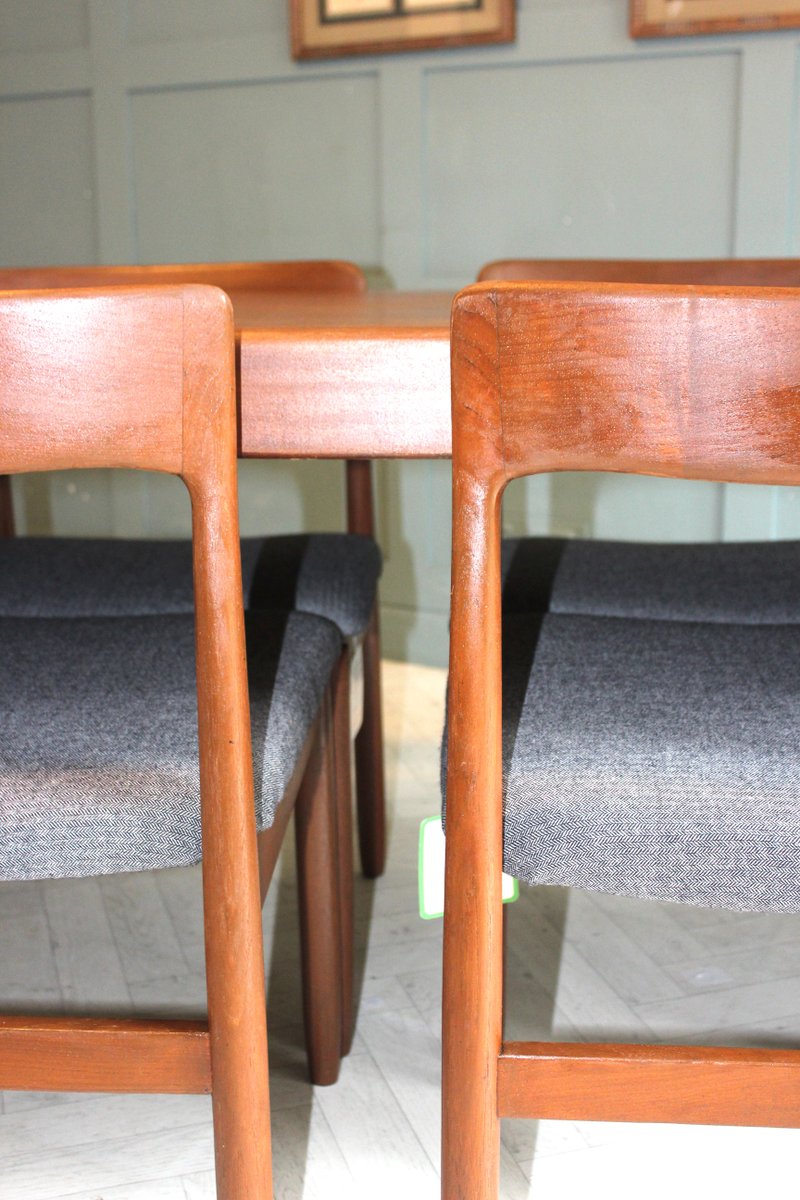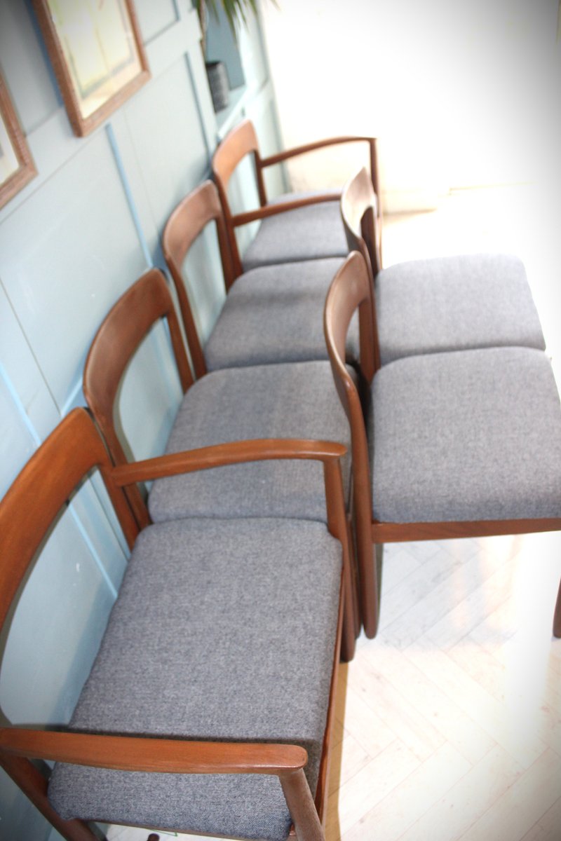 The accompanying set of six Fonseca dining chairs, also designed by John Herbert for A Younger, beautifully complements the table. Crafted in the same solid teak and freshly upholstered in a premium grey fabric, these chairs offer an ergonomic, supportive design ideal for everyday dining or entertaining. Their clean lines and subtle curves create a sense of understated sophistication, blending seamlessly into both mid-century modern and contemporary interiors.