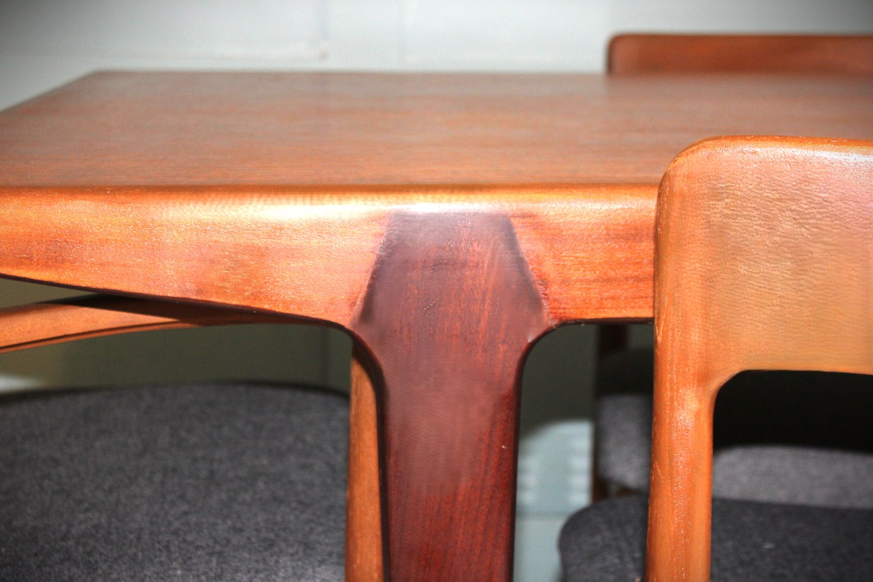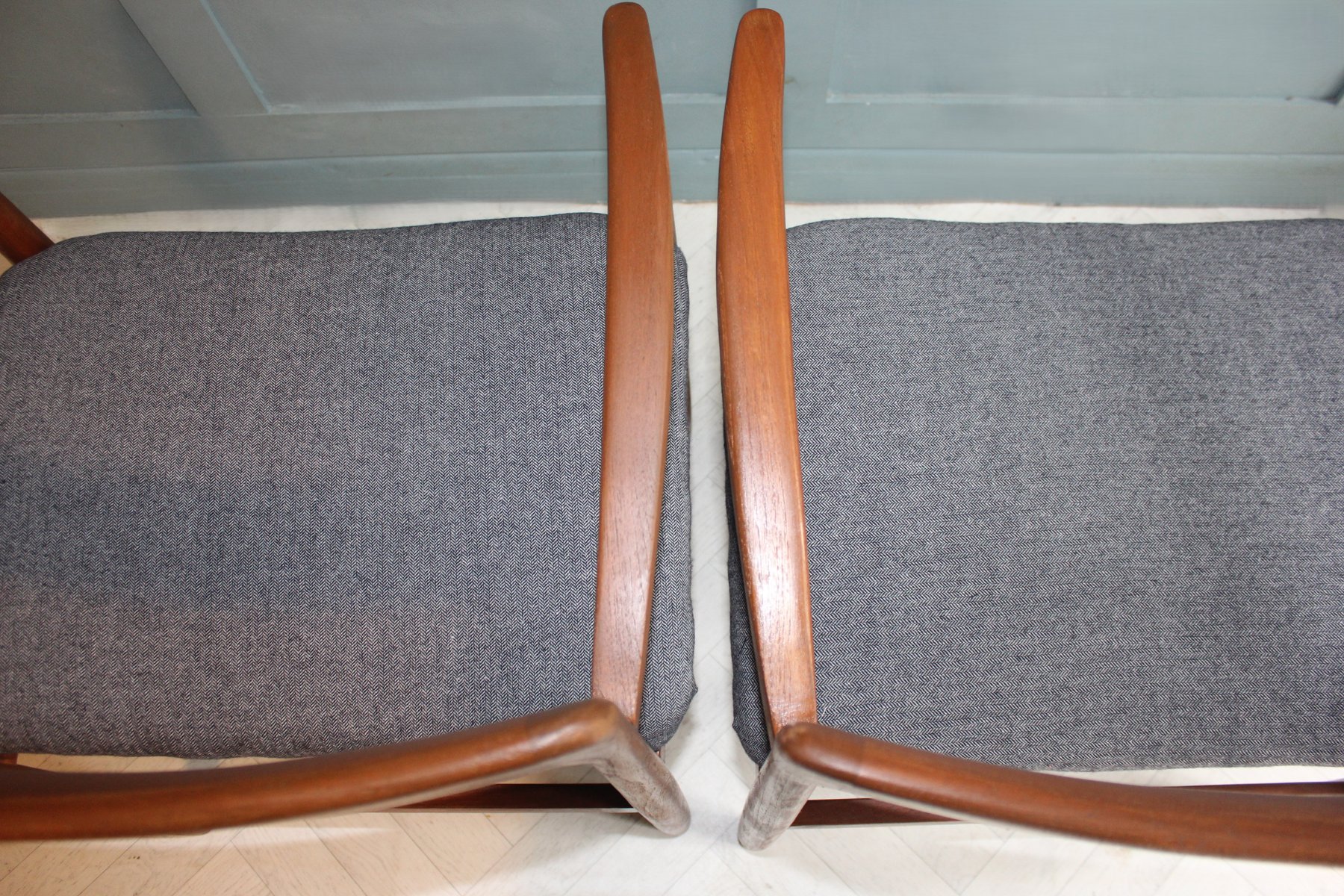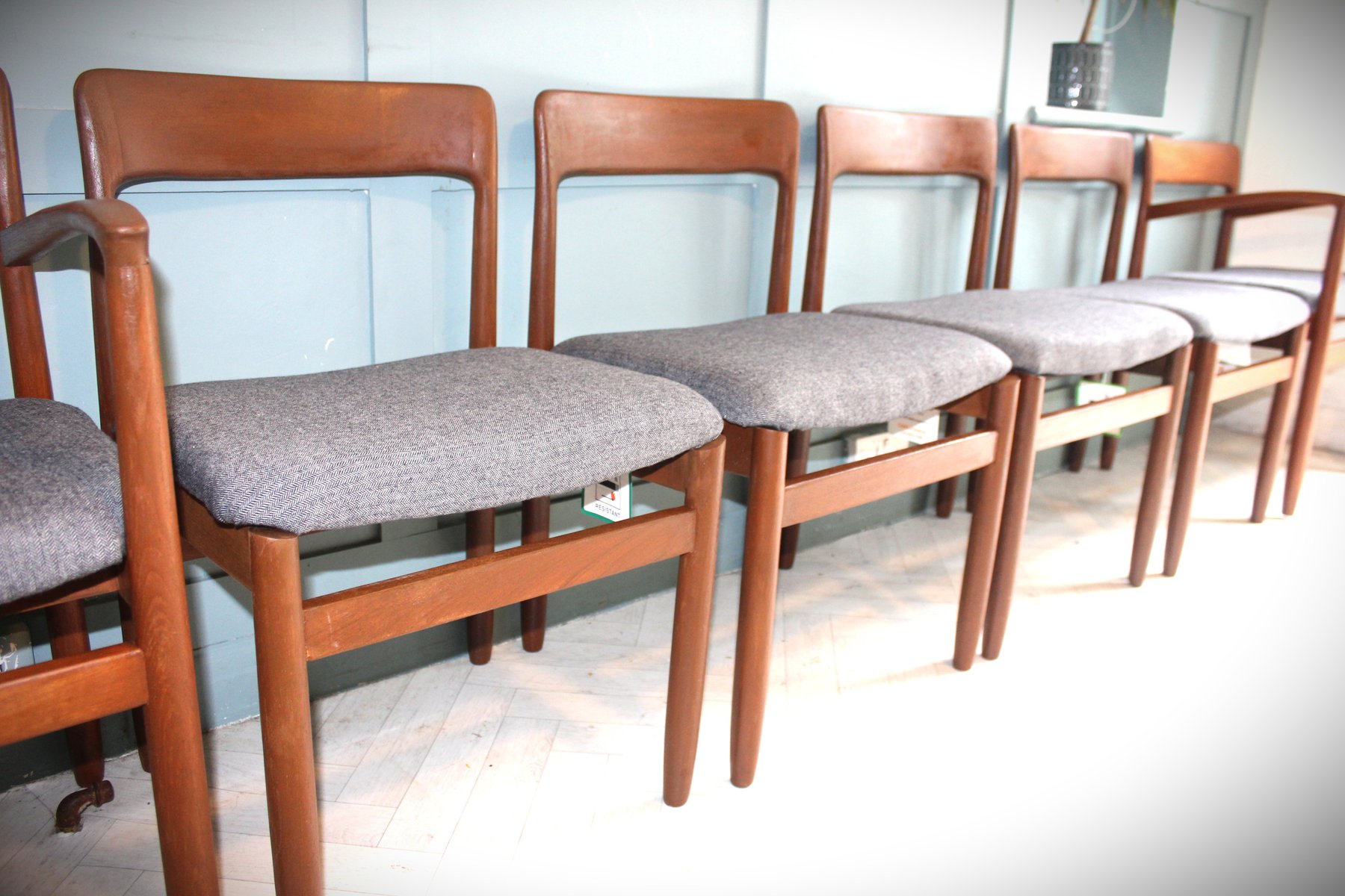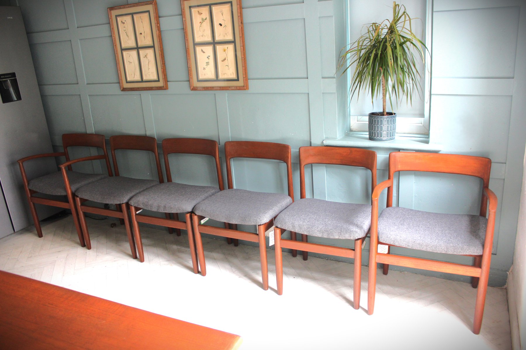 The accompanying set of six Fonseca dining chairs, also designed by John Herbert for A Younger, beautifully complements the table. Crafted in the same solid teak and freshly upholstered in a premium grey fabric, these chairs offer an ergonomic, supportive design ideal for everyday dining or entertaining. Their clean lines and subtle curves create a sense of understated sophistication, blending seamlessly into both mid-century modern and contemporary interiors.