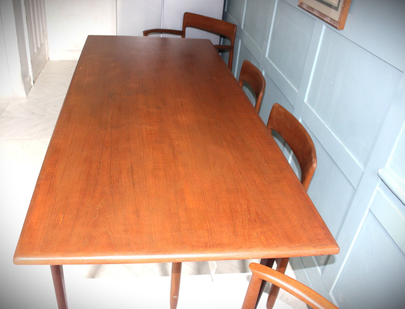 One of the most functional features of this mid-century dining table is its slim, narrowing ends—perfect for space-saving in smaller dining rooms or open-plan areas. The chairs tuck in fully underneath the table, allowing the set to be pushed neatly against a wall when not in use, making it ideal for modern living.