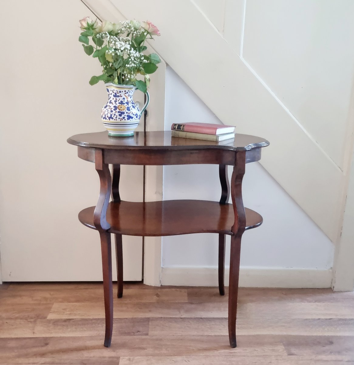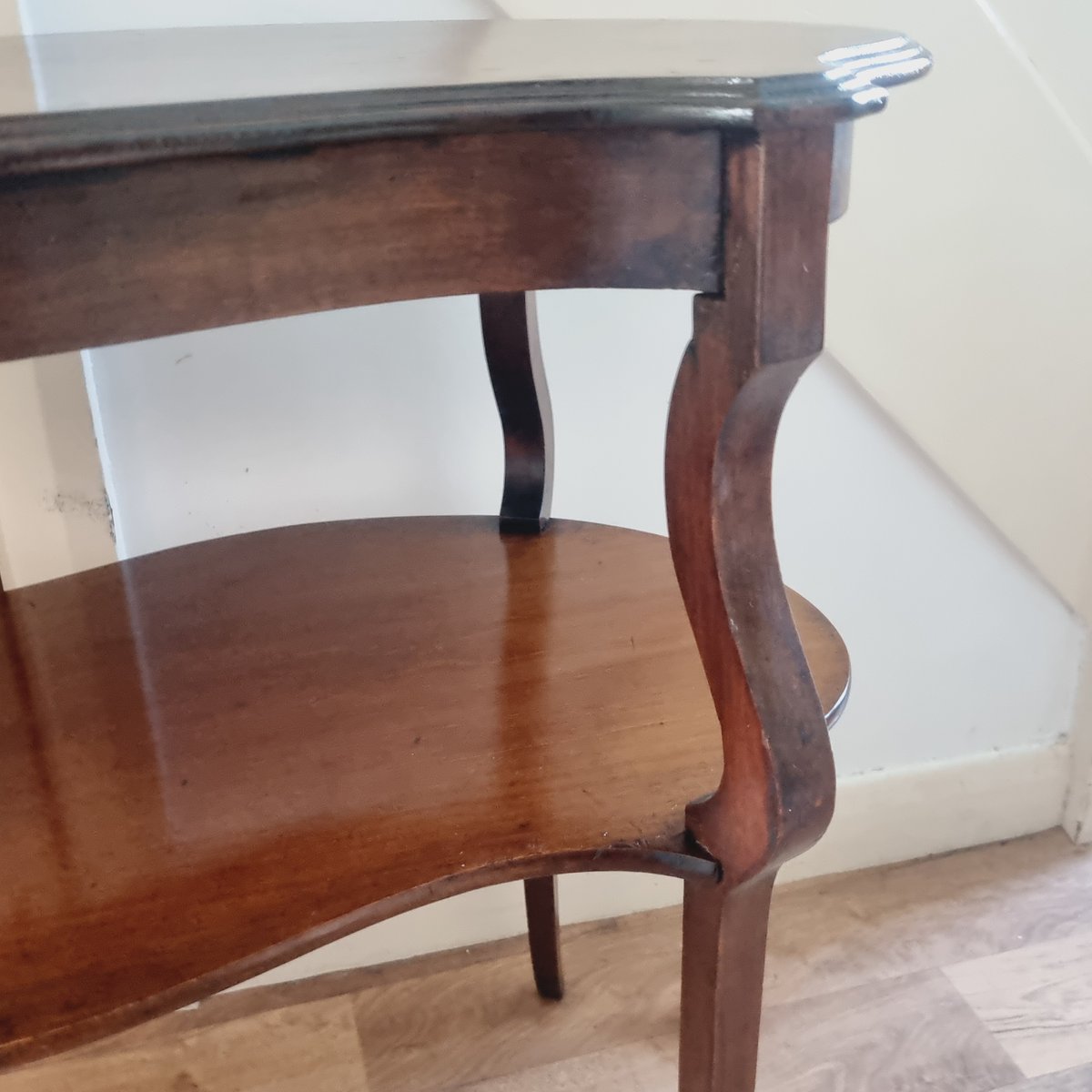 The table is made of a dark wood, possibly mahogany. It has wonderful curved lines.