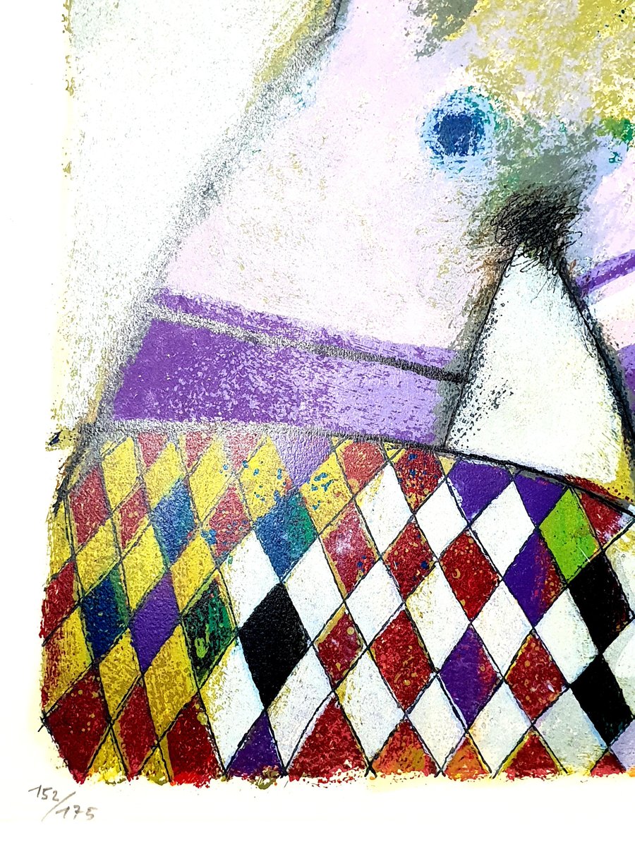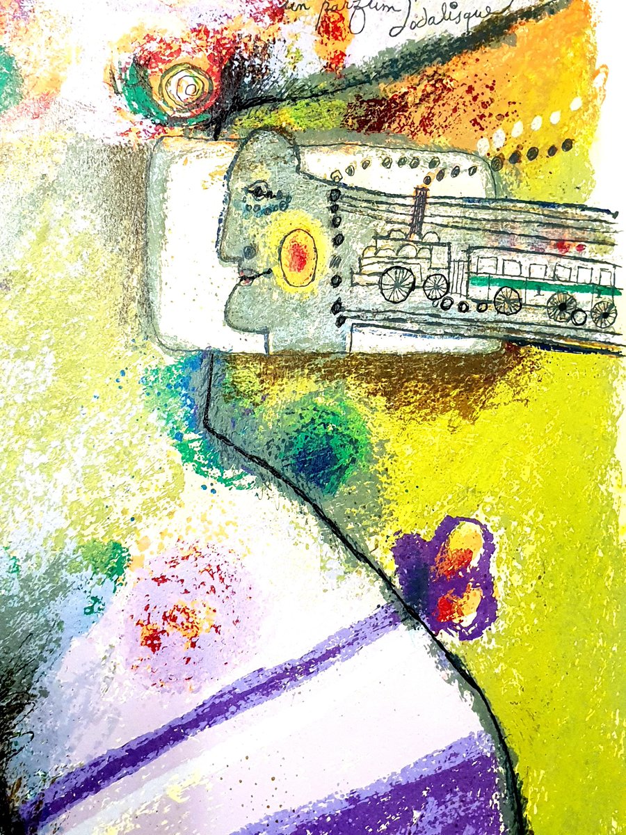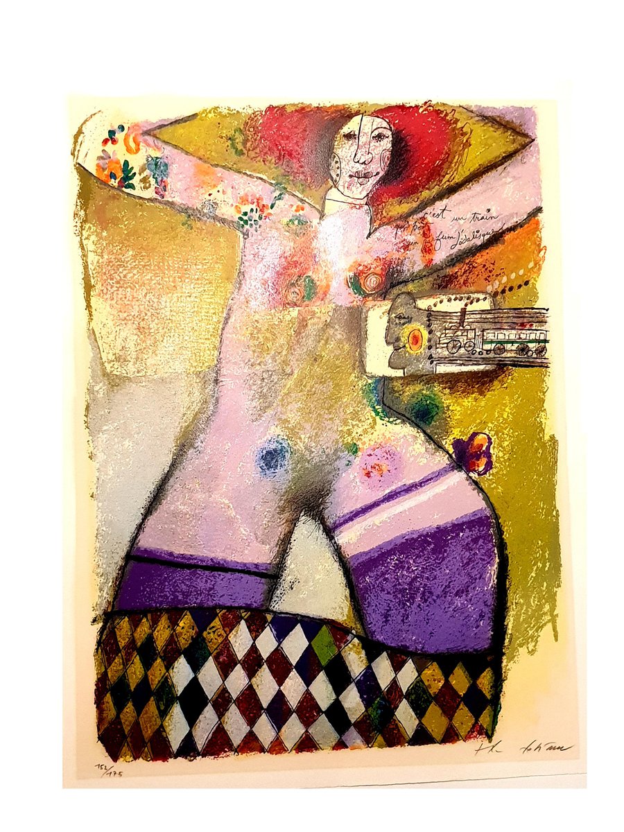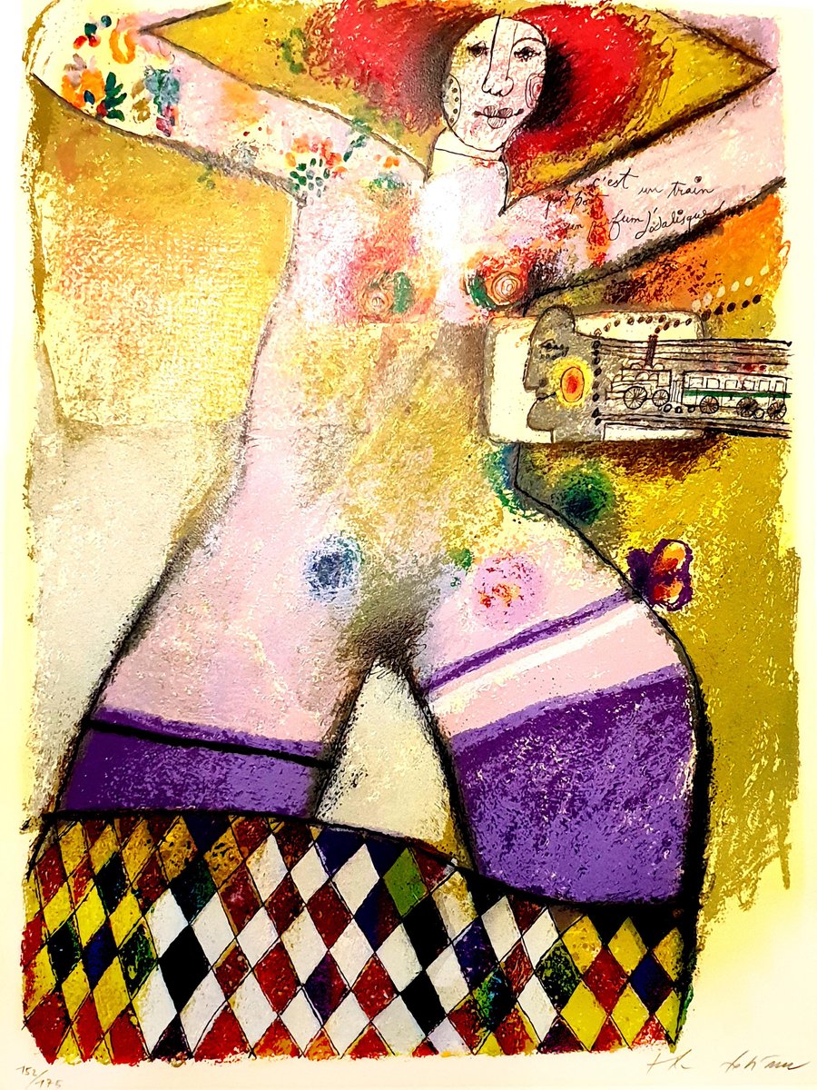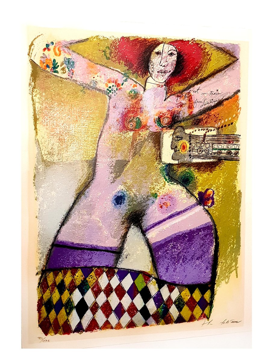 Théo Tobiasse Title: C'est un train portant un parfum d'odalisque Signed and Numbered Dimensions: 57 x 76 cm Information : Edition of 175 Condition : Excellent Theo Tobiasse (born in 1927) Theo Tobiasse, master of the Paris School, was born in Jaffa, Israel in 1927 of Lithuanian parents. His father, a Zionist who was a printer by profession, had brought the family to Jaffa from Lithuania in 1925. Because of financial difficulties, the family returned to Lithuania when Tobiasse was still very young. However, by 1931 the family had settled in Paris. Tobiasse has never forgotten his first sight of Paris, the City of Light. During the Nazi occupation of Paris, the Tobiasse family lived hidden for two years in a minuscule apartment in Paris. From July, 1942 through August, 1944, the family never ventured outside, nor would they turn on the lights or burn candles. By the feeble light that filtered through the closed shutters, Theo spent his time reading, drawing, and playing chess with his father. The chessboard pattern seen in many of Theo’s paintings is symbolic of this time in his life. The only indication of time passing was the sound of Nazi boots in the streets and on the staircase of their house - more than once they were very close to being discovered. On August 25, 1944 Paris was liberated, and Theo walked out of the apartment with a large portfolio of drawings into the light of a cloudy day. It’s interesting to note that LeRoy Neiman was with the U.S. Army that liberated Paris that day! After the war Tobiasse worked for 15 years as a very successful advertising artist, first in Paris and then in Nice. He painted as often as he could during this time, often at night. In 1960 he entered his first art show and won the Grand Prize. Since 1961, Tobiasse has enjoyed incredible success as far afield as New York, Paris, Tel Aviv, Caracas and Tokyo, in all of which he has had one-man shows. Art Expo New York, the world’s largest art trade show, listed Tobiasse as one of the only Museum Quality artists represented when American Fine Art exhibited his works there in 1998. A sentimental and private individual, Tobiasse puts his innermost feelings into all of his works and his little “secret” into his original paintings: a personal message which he writes in Yiddish and then glues onto the canvas before painting or collageing over it. No one will ever know the message without destroying the painting itself! Tobiasse’s art is a product of intellect, submerged memories and laborious experimentation with various media. As Chagall and Picasso did before him, Tobiasse looks deeper into his work, seeking to express the inner world of man. Surrealism taught him to be experimental, to juxtapose pictorial elements in order to redefine them. He welcomes the new freedom of the 20th Century where there are no rules. Space can be twisted, altered, folded and rendered by its own reality. His influences are as diverse as the etchings on a teapot carried from Lithuania to the Winged Victory as it is set in the Louvre. He imitates no one, but has sensitively collected imagery which evolves into an art that is truly his. It is the brilliant vision of Theo Tobiasse, expressed in his work, that echoes the vocabulary of modern art.
