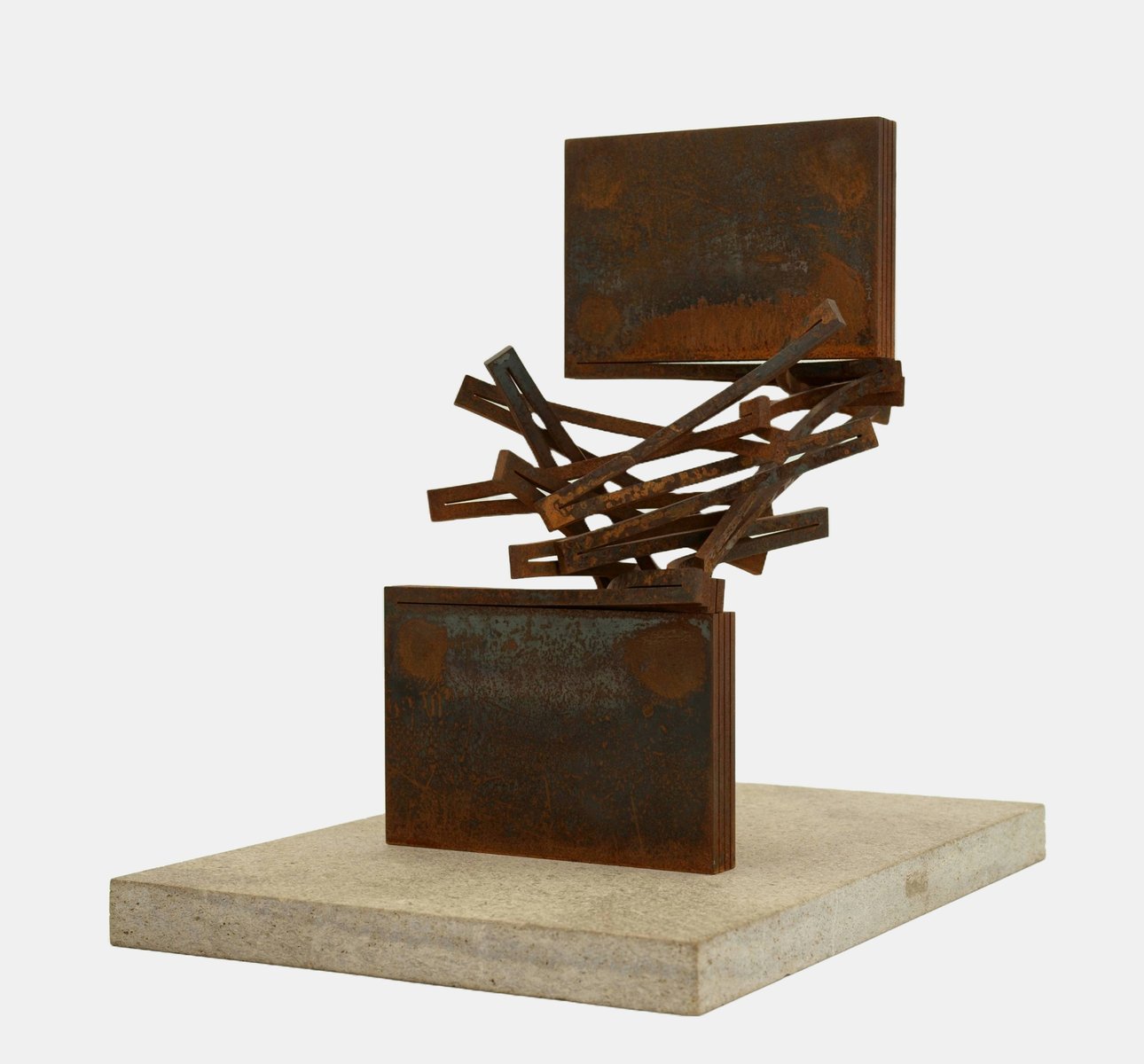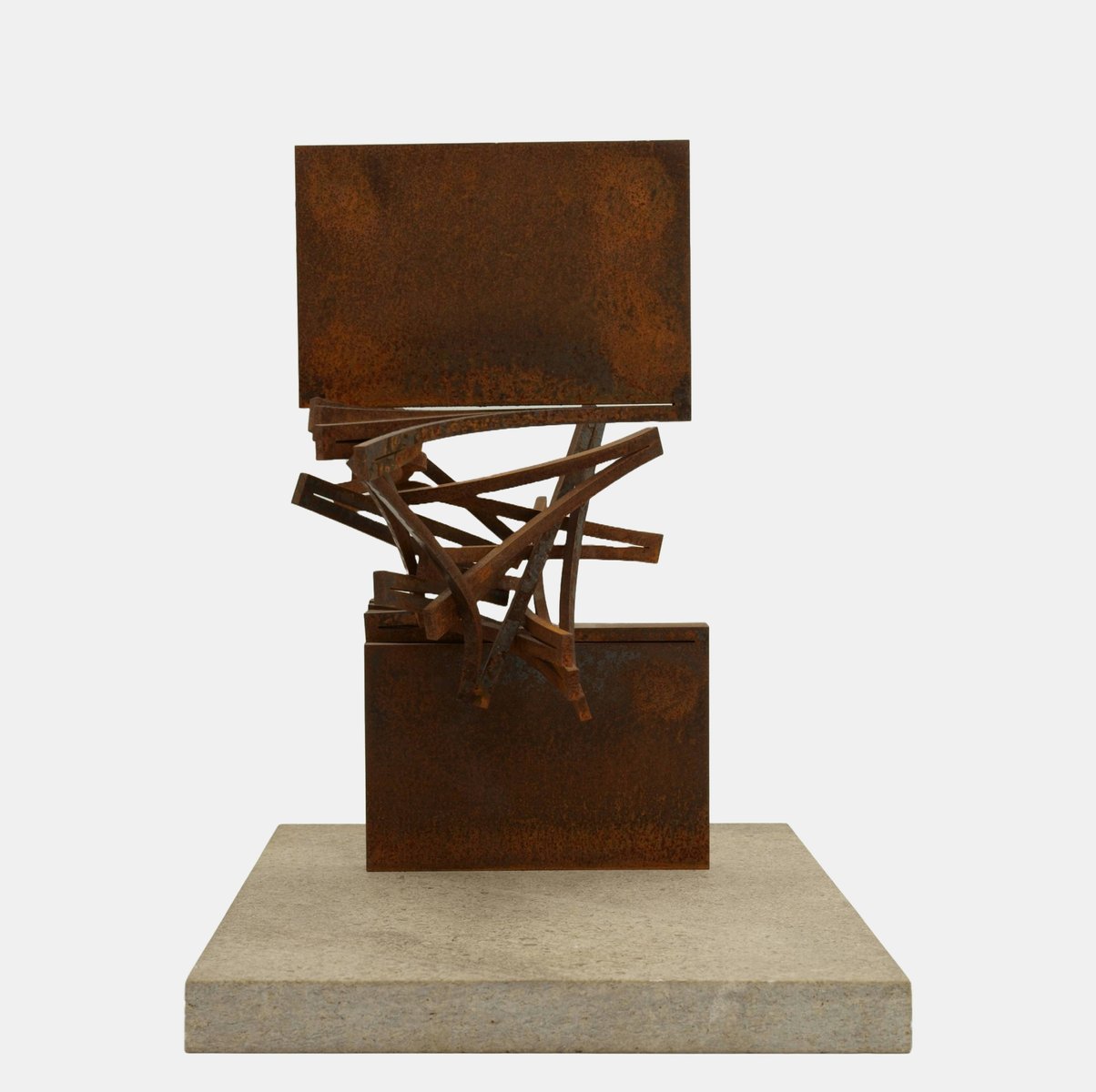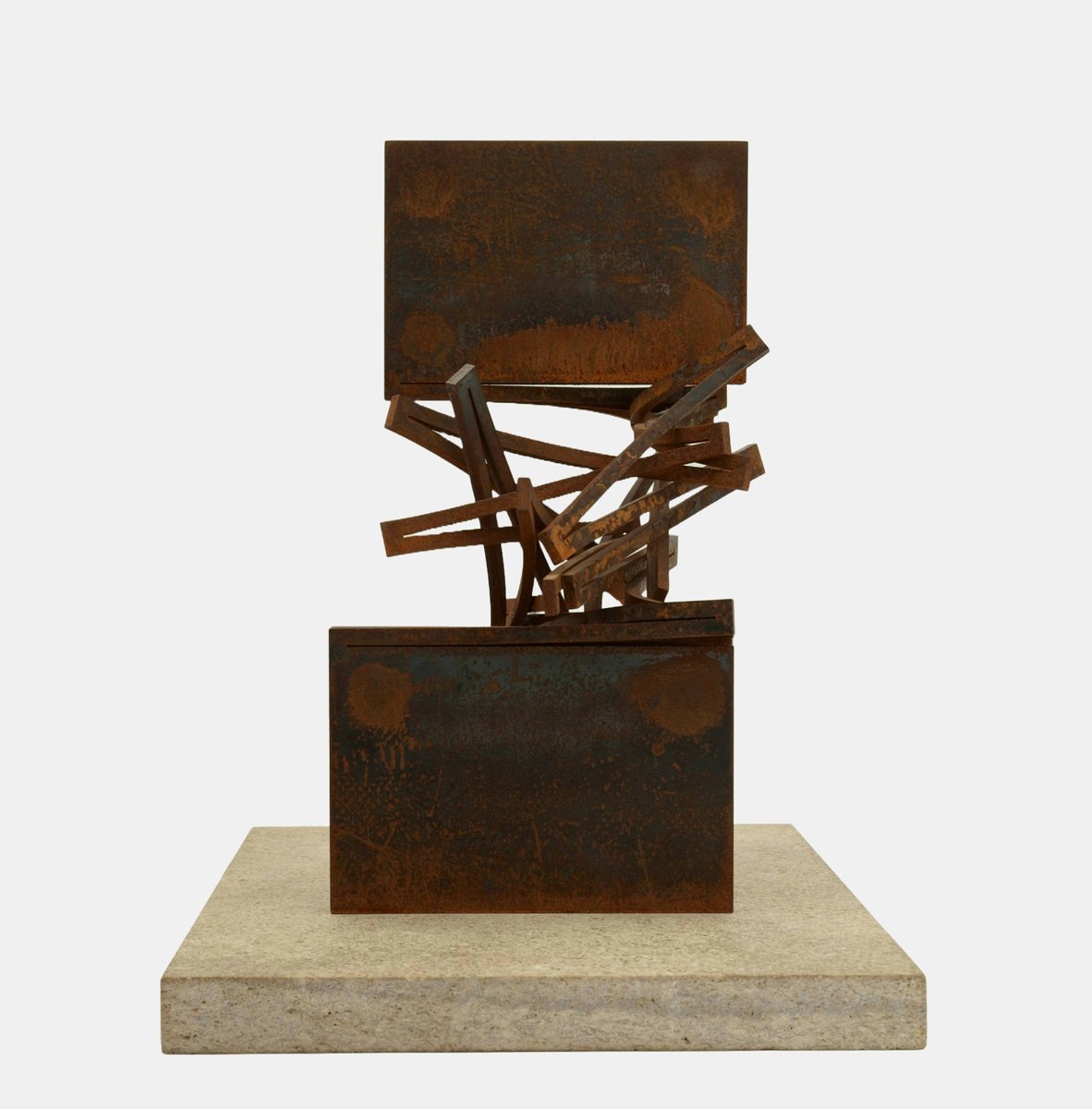 Thomas Röthel (*1969 Ansbach), Gradual Rotation, around 2005. Steel with rust patina mounted on stone plate. Overall dimensions: 38 cm (height) x 34 cm (width) x 27 cm (depth), weight 12.3 kg.