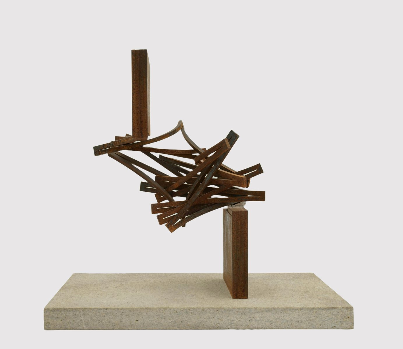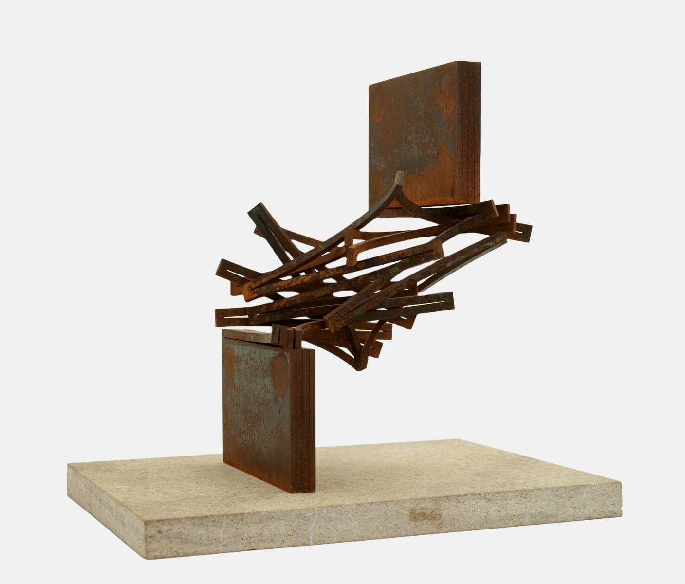 Thomas Röthel (*1969 Ansbach), Graduelle Drehung, um 2005. Stahl mit Flugrostpatina auf Steinplatte montiert. Gesamtmaß: 38 cm (Höhe) x 34 cm (Breite) x 27 cm (Tiefe), Gewicht 12,3 kg.