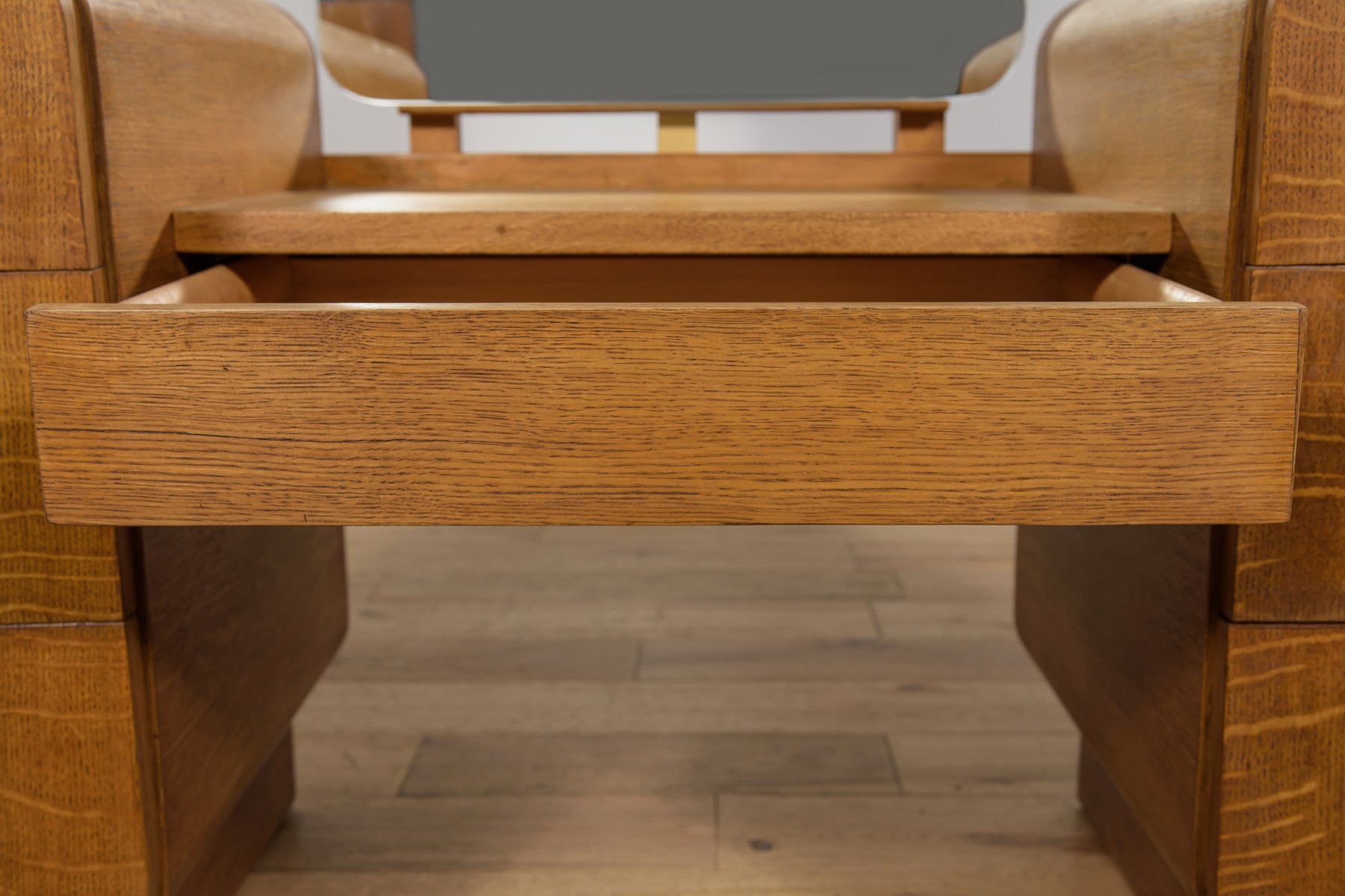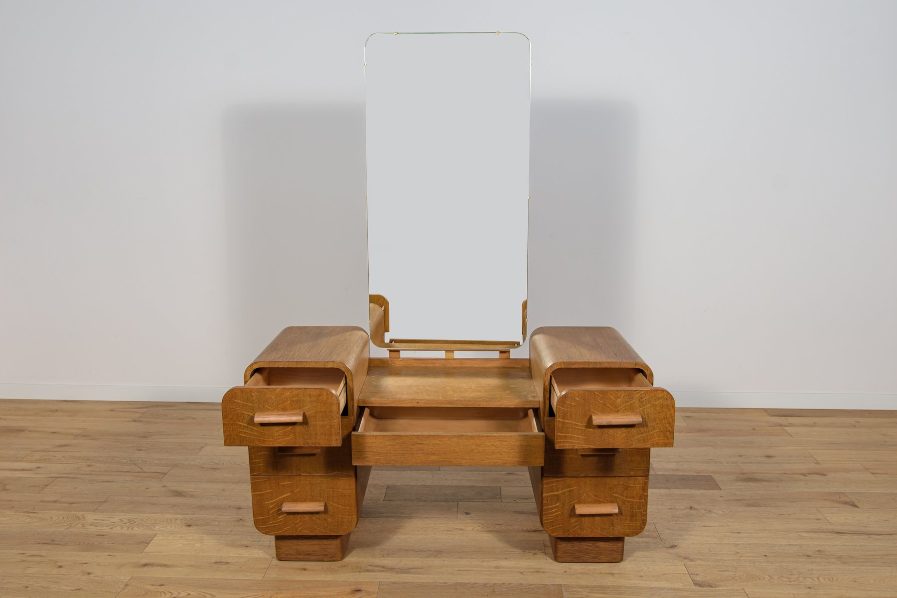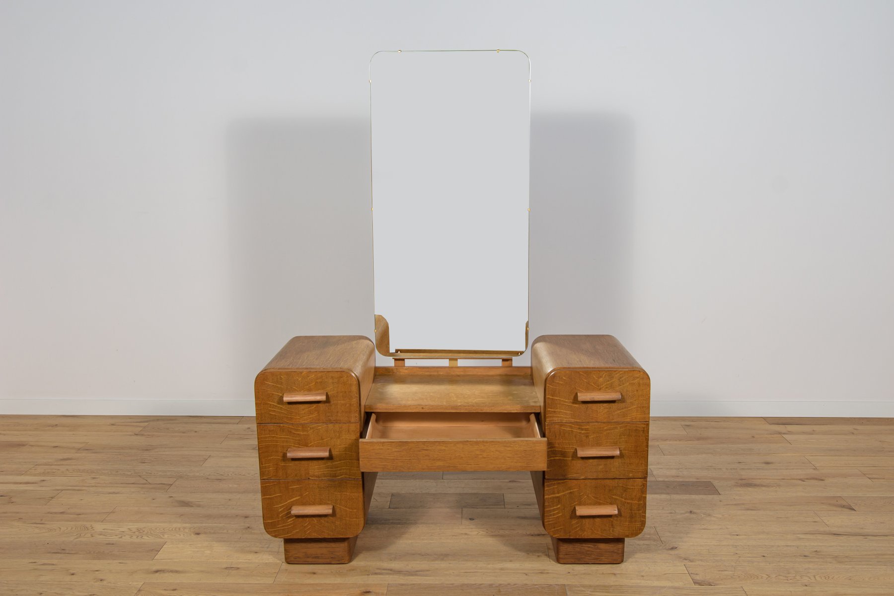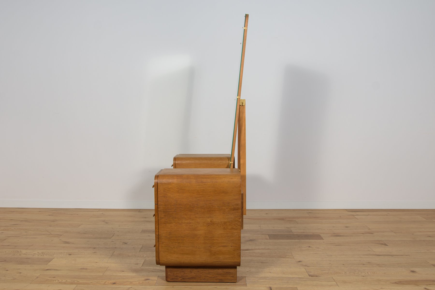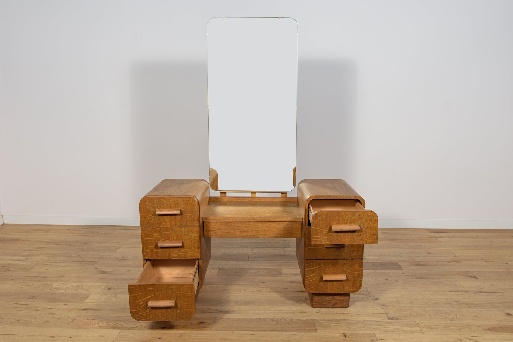 Art Deco dressing table manufactured in Czechoslovakia in the 1950s. The furniture has rounded shapes, giving it a unique character. The furniture consists of two side modules, each with three drawers and a middle drawer. The drawers have profiled, rounded drawers. The furniture made of oak and beech wood after a comprehensive renovation, was cleaned of the old coating, finished with oak-colored wax. The mirror was replaced with a new one.