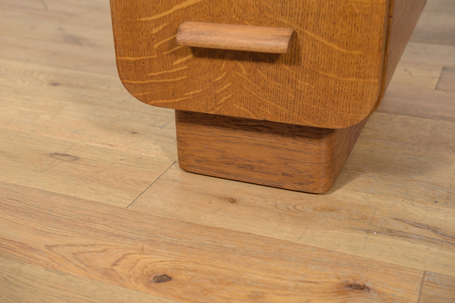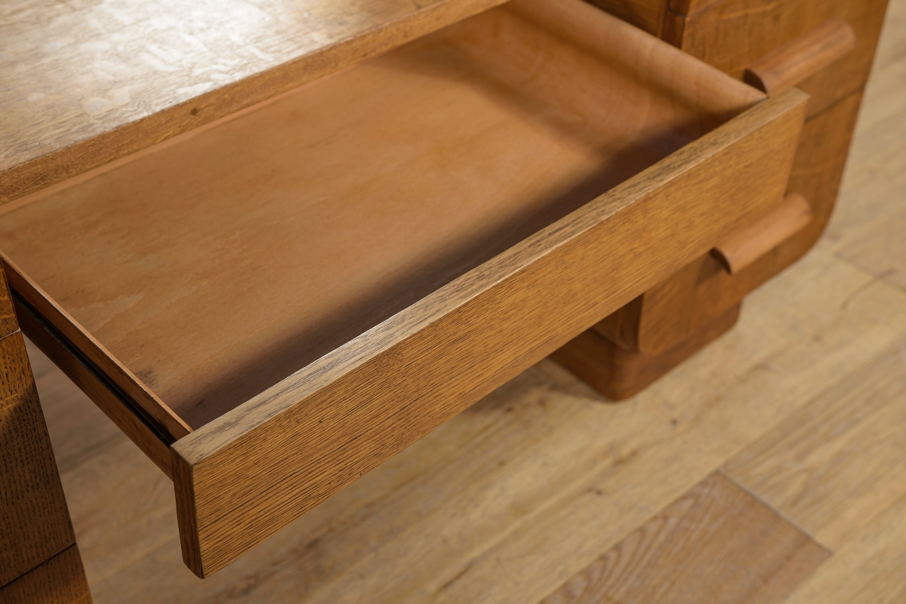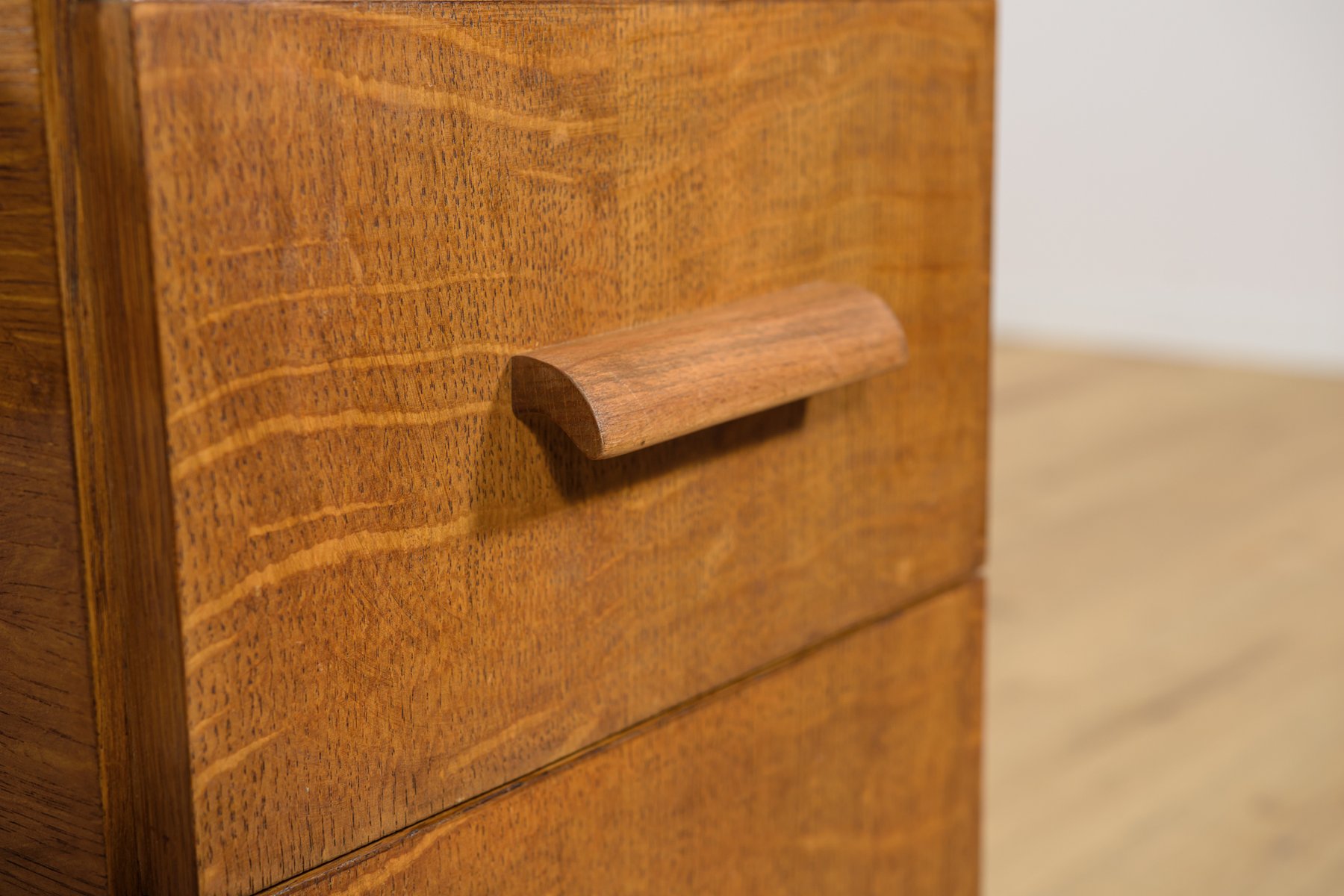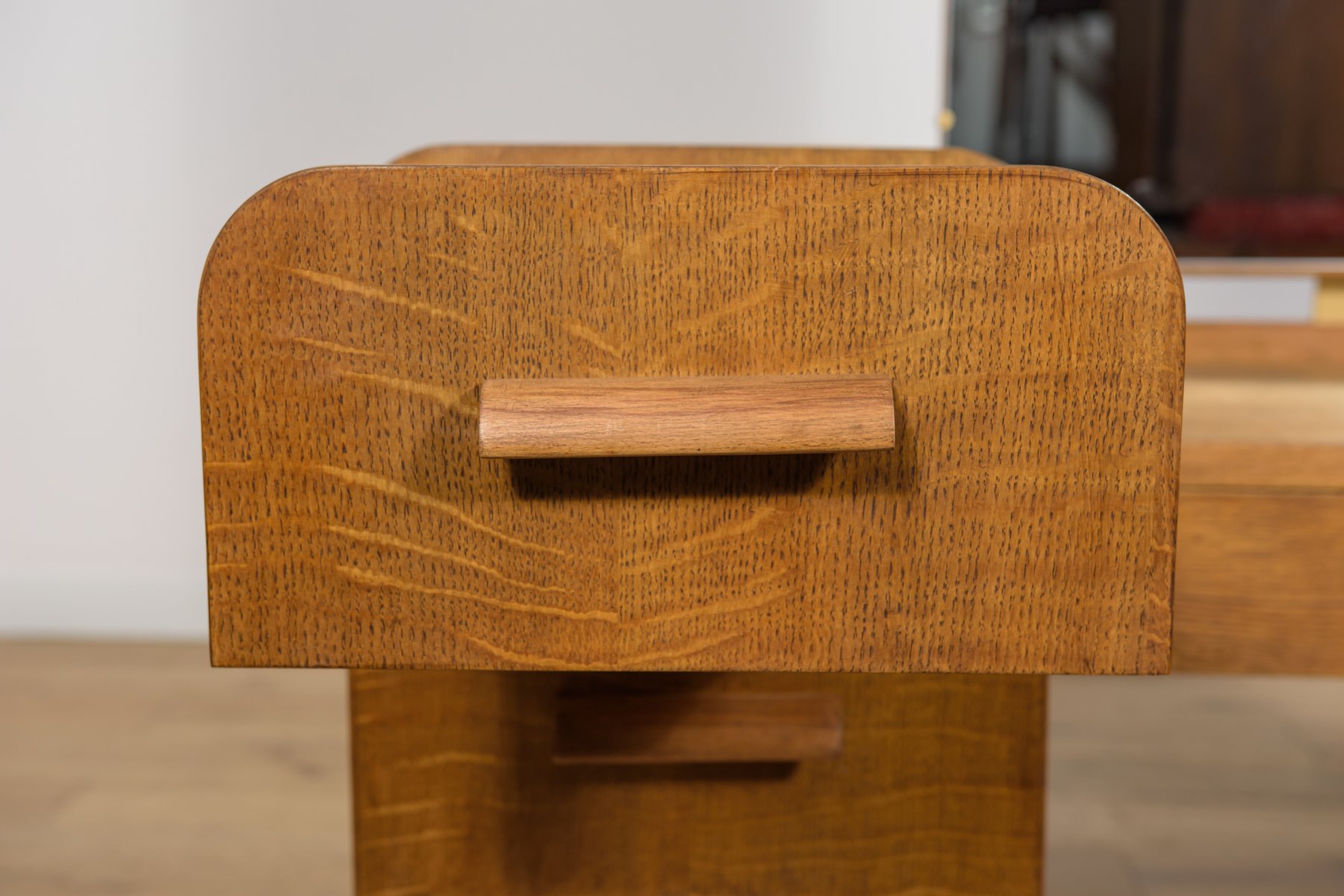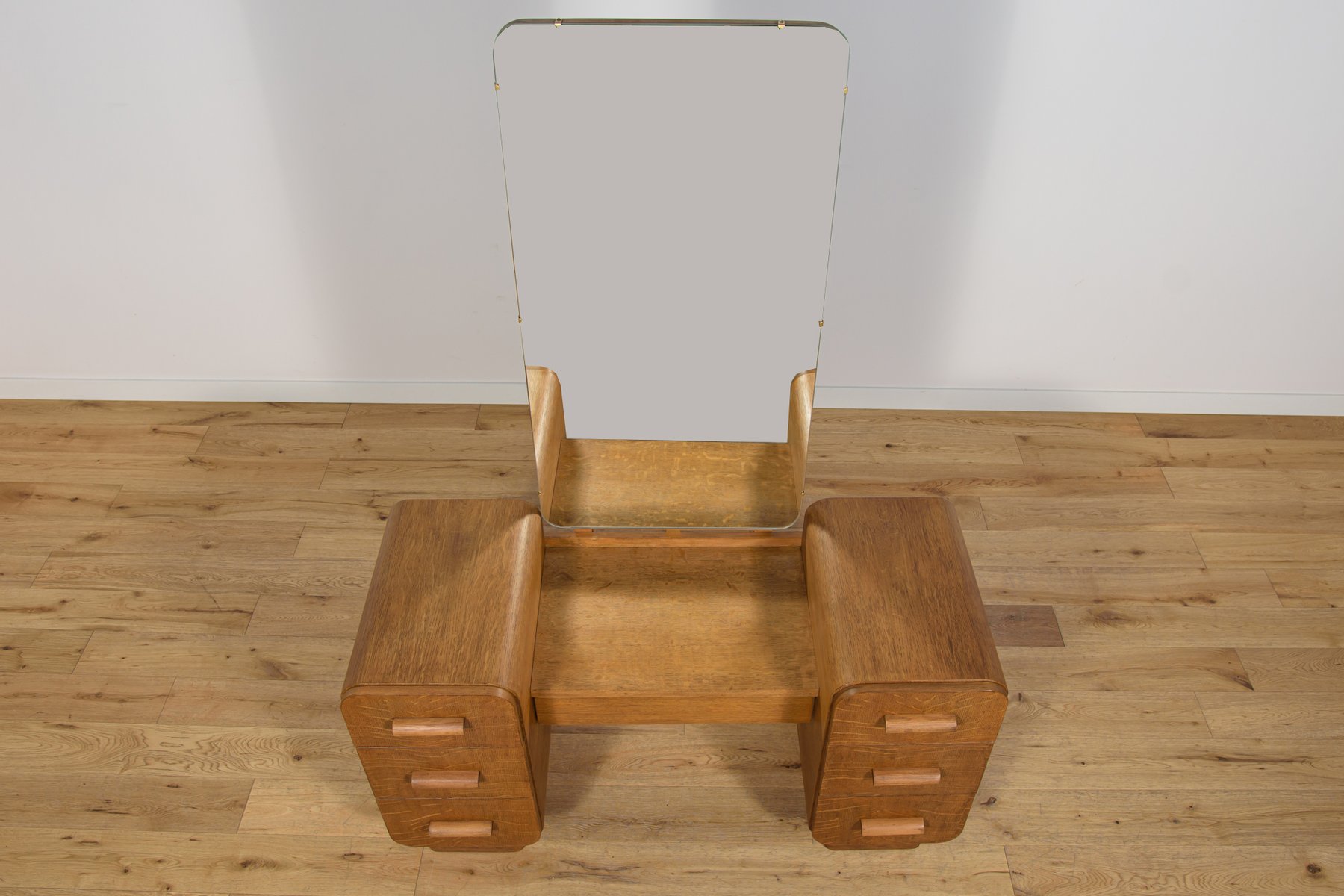 Art Deco dressing table manufactured in Czechoslovakia in the 1950s. The furniture has rounded shapes, giving it a unique character. The furniture consists of two side modules, each with three drawers and a middle drawer. The drawers have profiled, rounded drawers. The furniture made of oak and beech wood after a comprehensive renovation, was cleaned of the old coating, finished with oak-colored wax. The mirror was replaced with a new one.