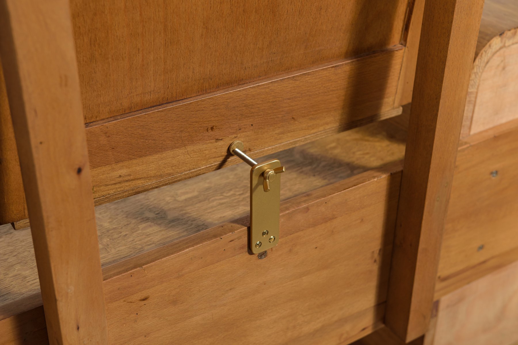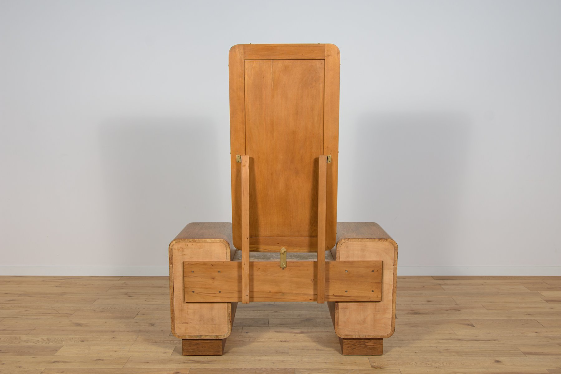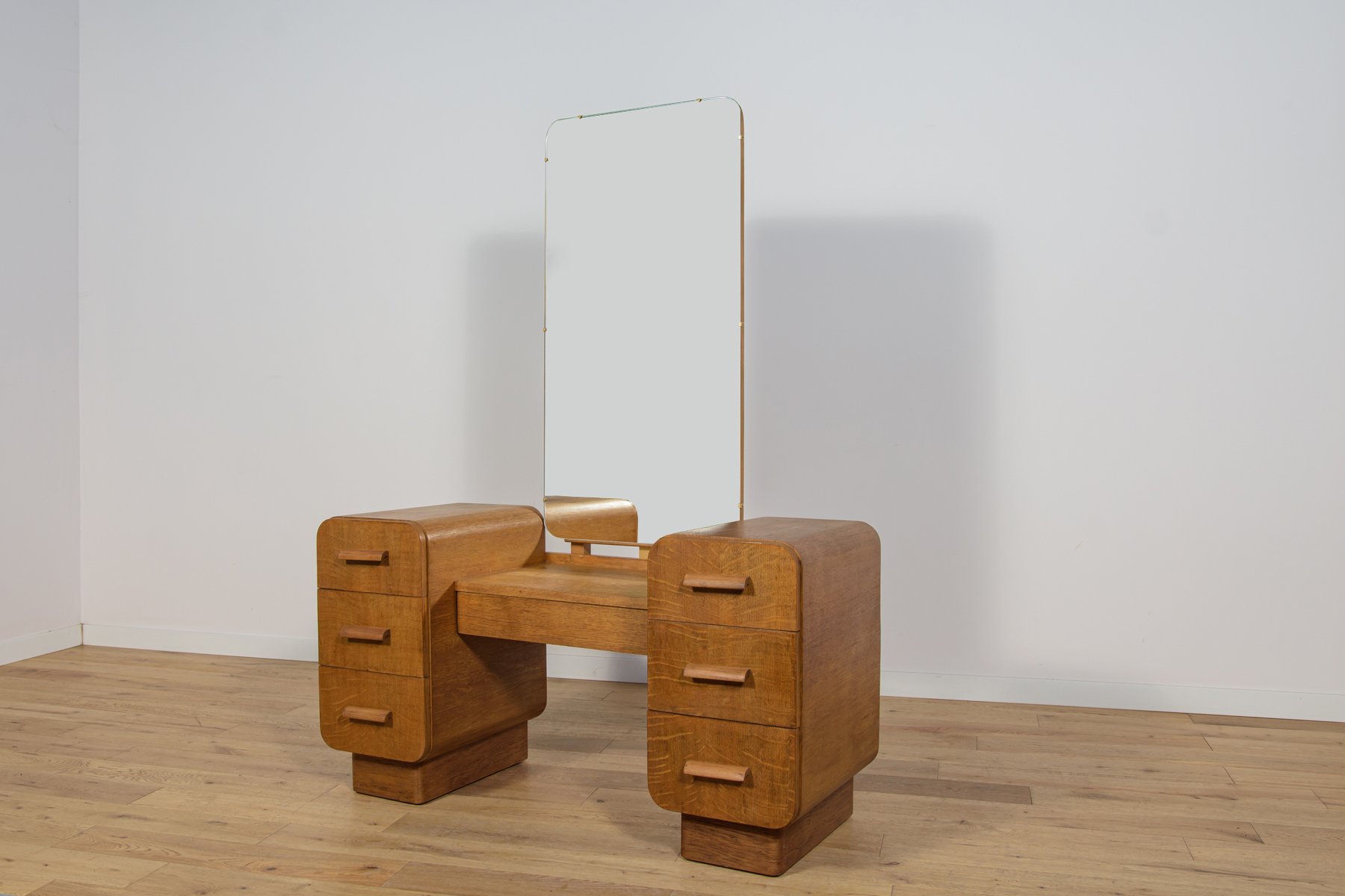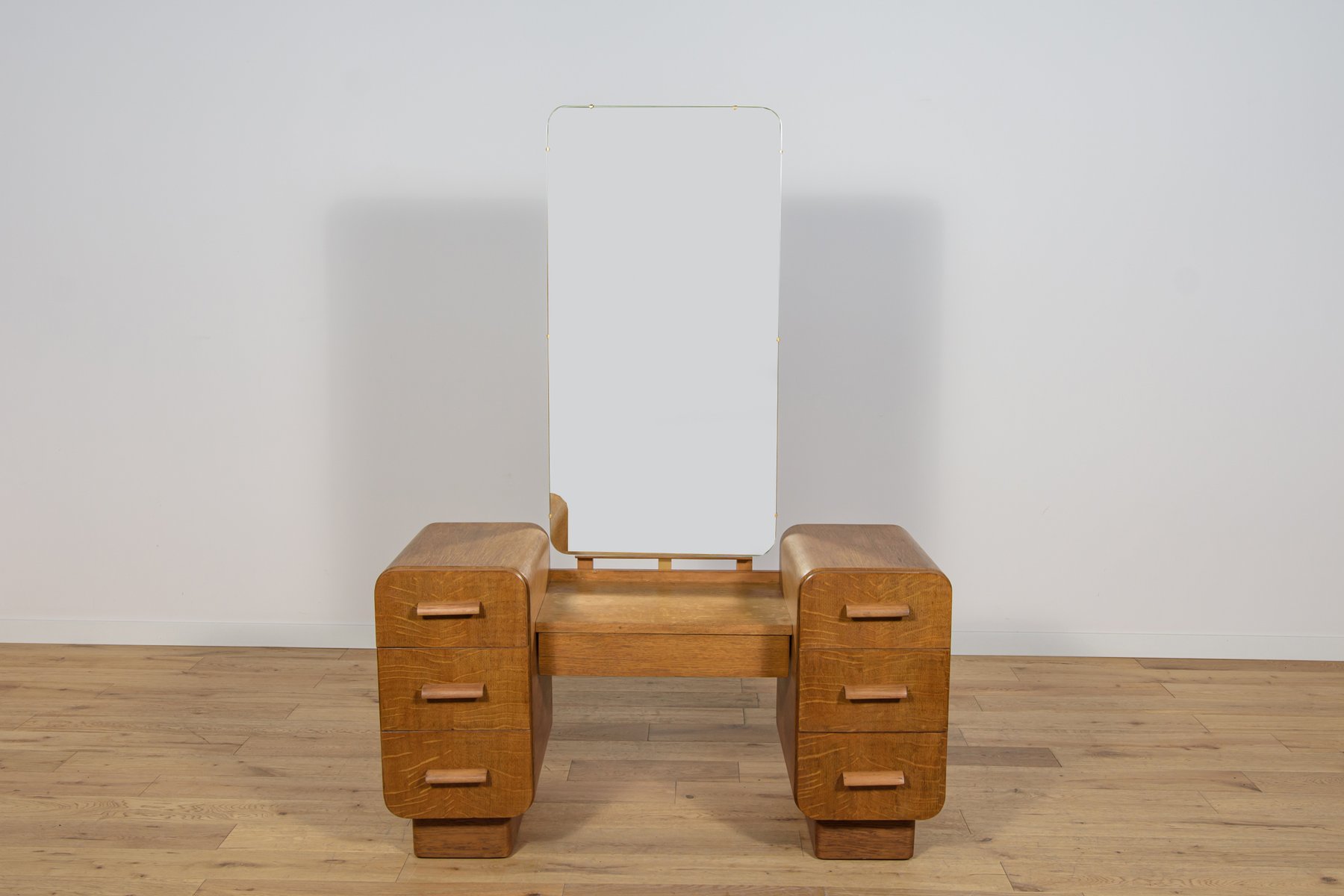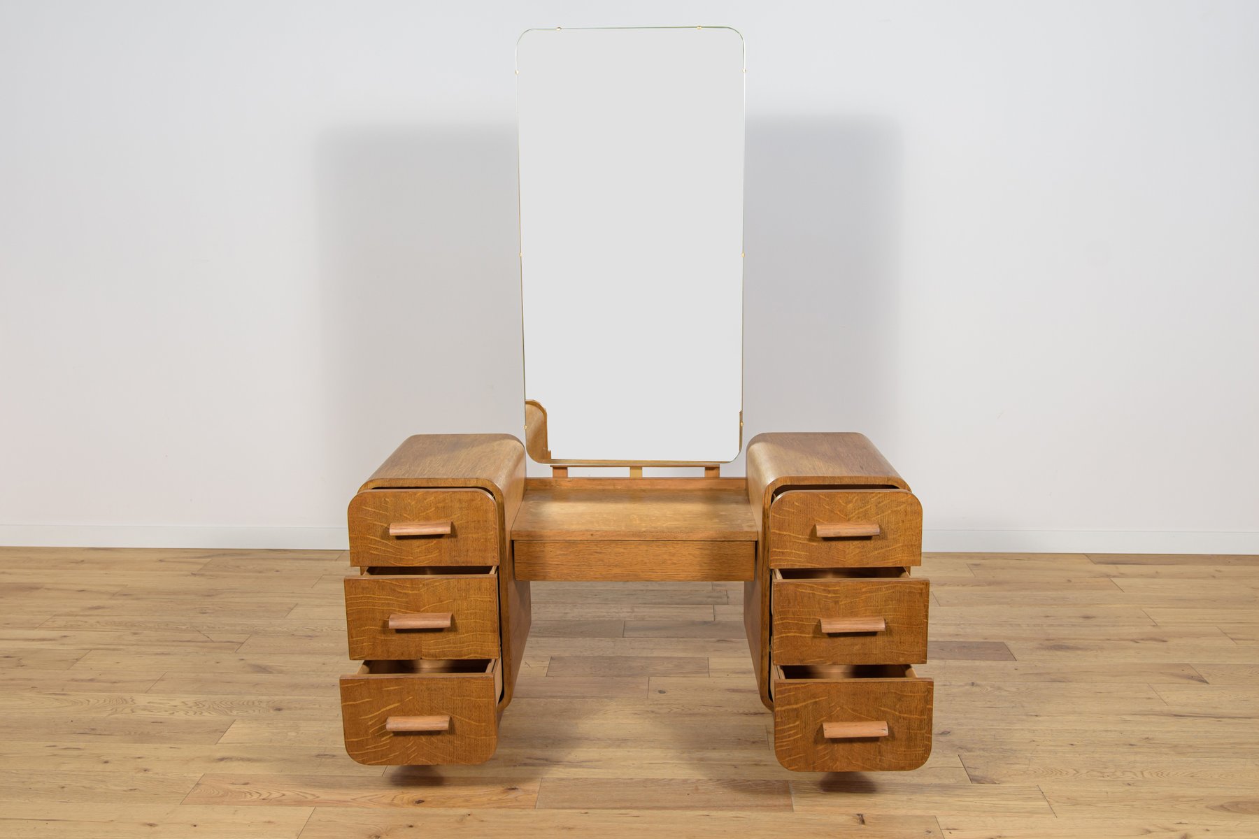 Tavolino da toilette Art Déco prodotto in Cecoslovacchia negli anni Cinquanta. Il mobile ha forme arrotondate che gli conferiscono un carattere unico. Il mobile è composto da due moduli laterali, ciascuno con tre cassetti e un cassetto centrale. I cassetti sono profilati e arrotondati. I mobili in legno di quercia e faggio, dopo una ristrutturazione completa, sono stati ripuliti dal vecchio rivestimento e rifiniti con cera color quercia. Lo specchio è stato sostituito con uno nuovo.