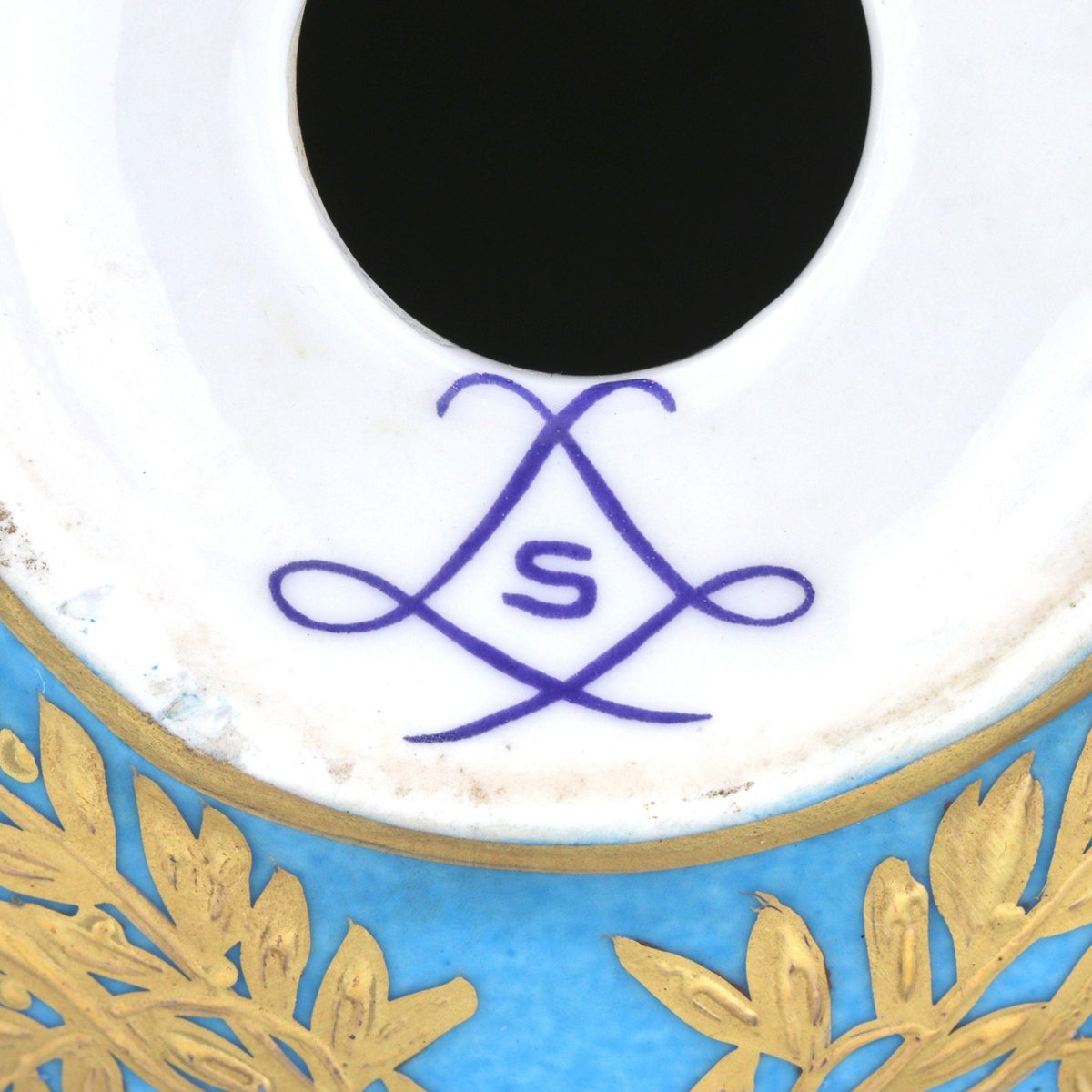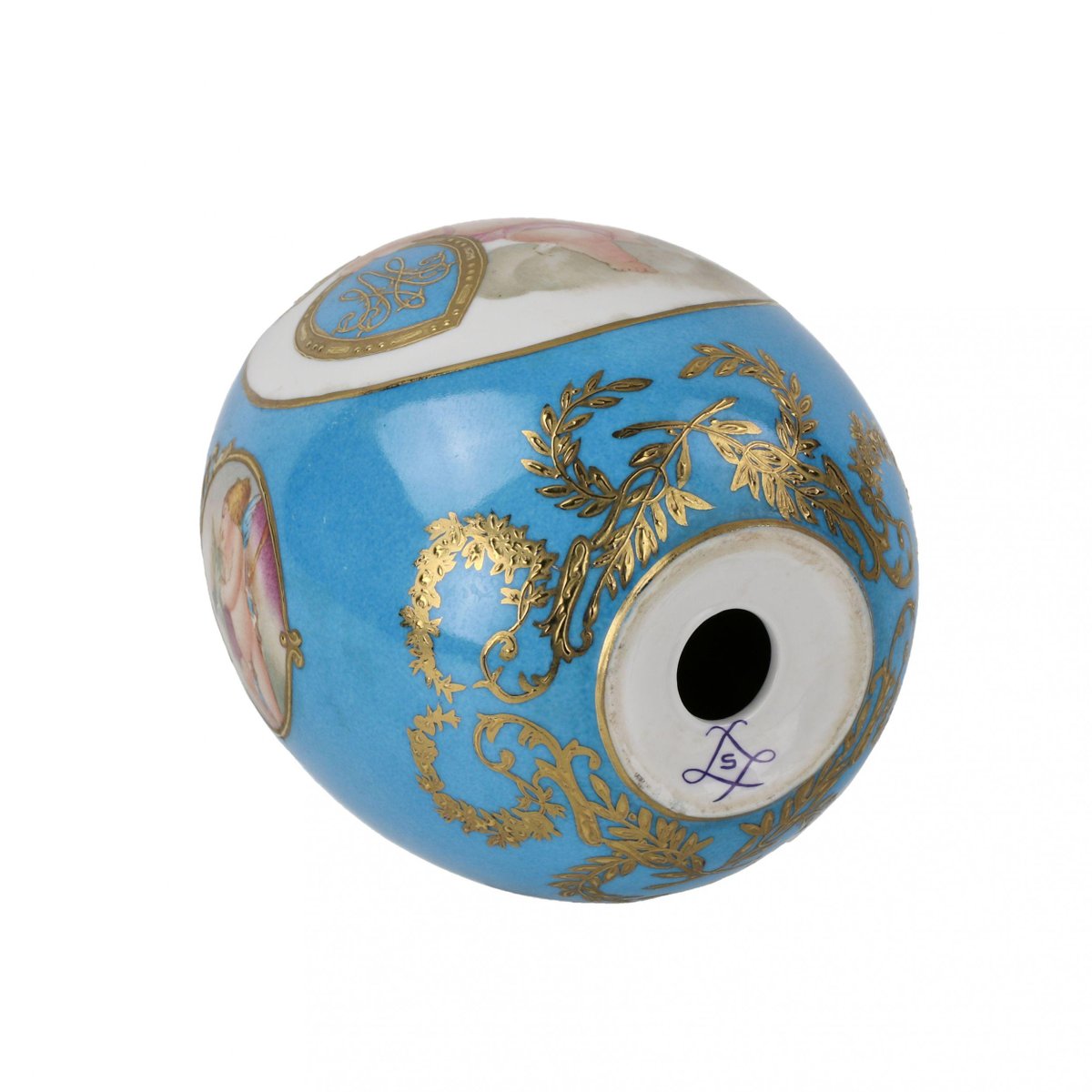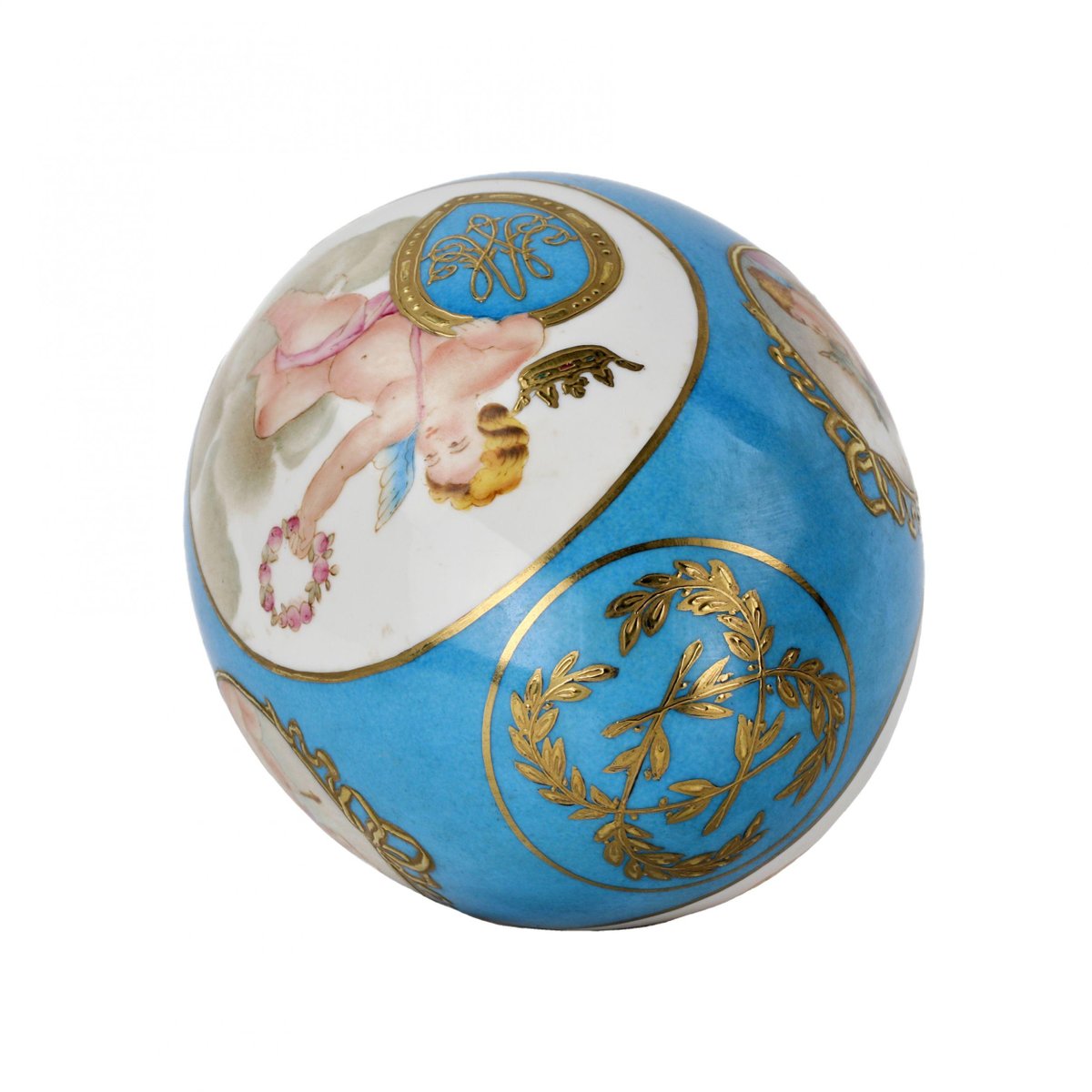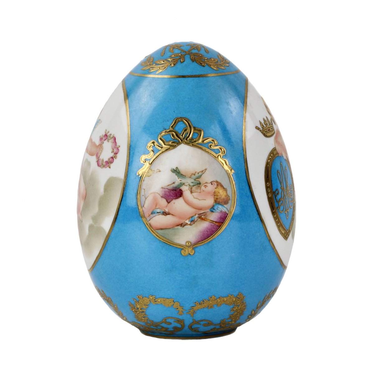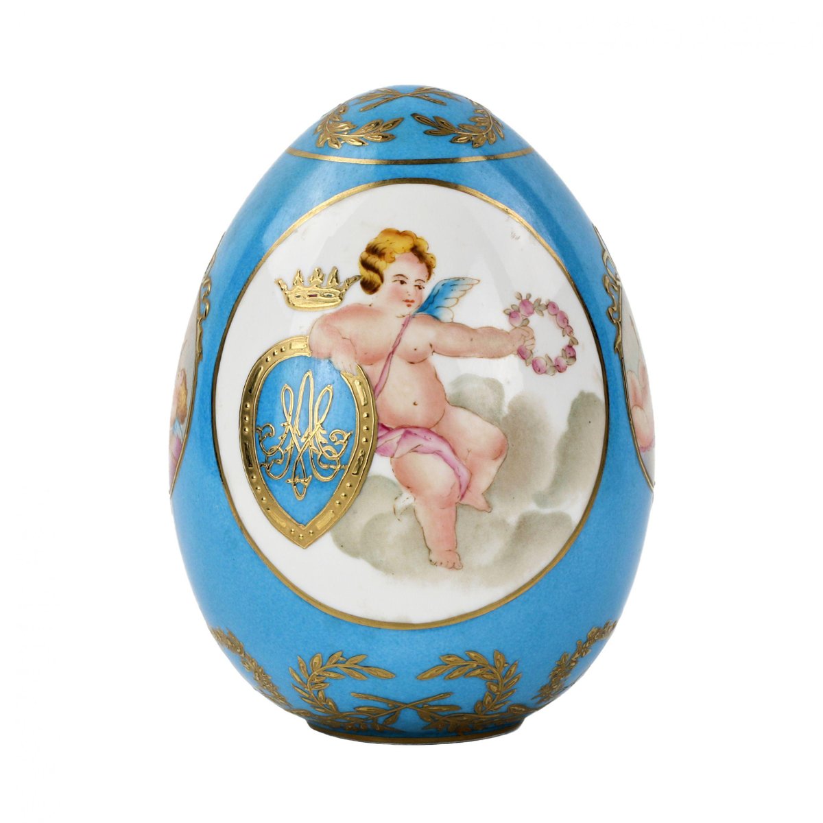 Large porcelain Easter egg in the colors of the Sevres manufactory. Decorated with vignettes with cupids on a blue background. Large vignettes symmetrically show cupids leaning on a shield with a crown and monograms AM, crowning with wreaths of roses. In small vignettes - the love joys of a cupid kissing a dove and a putti, in a pink scarf, playing with a wand. At the top, the motif of two intertwined wreaths - denoting the merging of ecstasies. Painting, decal with painting, gilding. Height: 18 cm. Seversk brand with the letter S. 20th century.