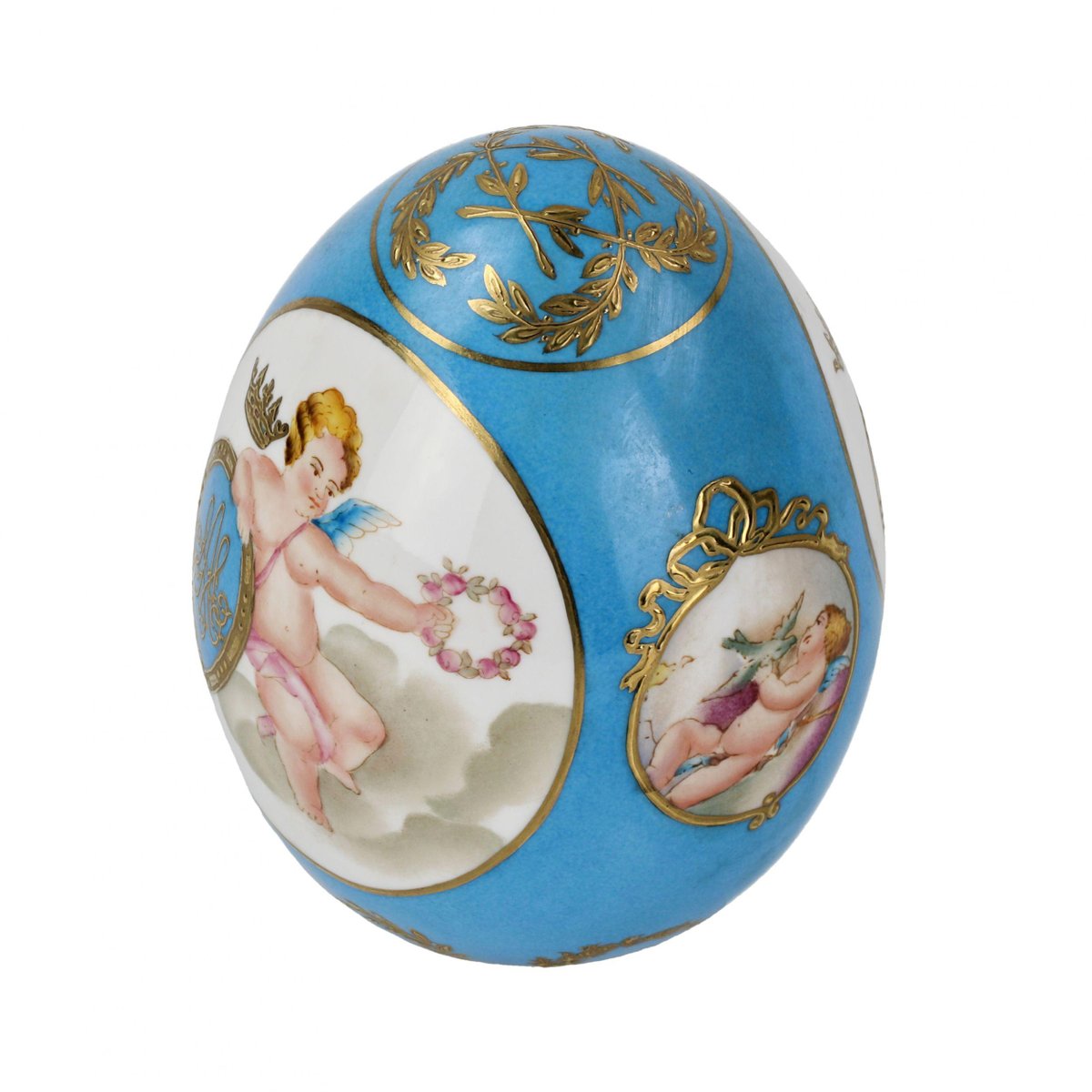 Grande uovo di Pasqua in porcellana nei colori della manifattura di Sevres. Decorato con vignette con amorini su sfondo blu. Le grandi vignette mostrano simmetricamente amorini appoggiati su uno scudo con corona e monogrammi AM, coronati da corone di rose. Nelle piccole vignette, le gioie amorose di un amorino che bacia una colomba e un putti, con una sciarpa rosa, che gioca con una bacchetta. In alto, il motivo di due corone di rose intrecciate - che denota la fusione delle estasi. Pittura, decalcomania con pittura, doratura. Altezza: 18 cm. Marchio Seversk con la lettera S. XX secolo.