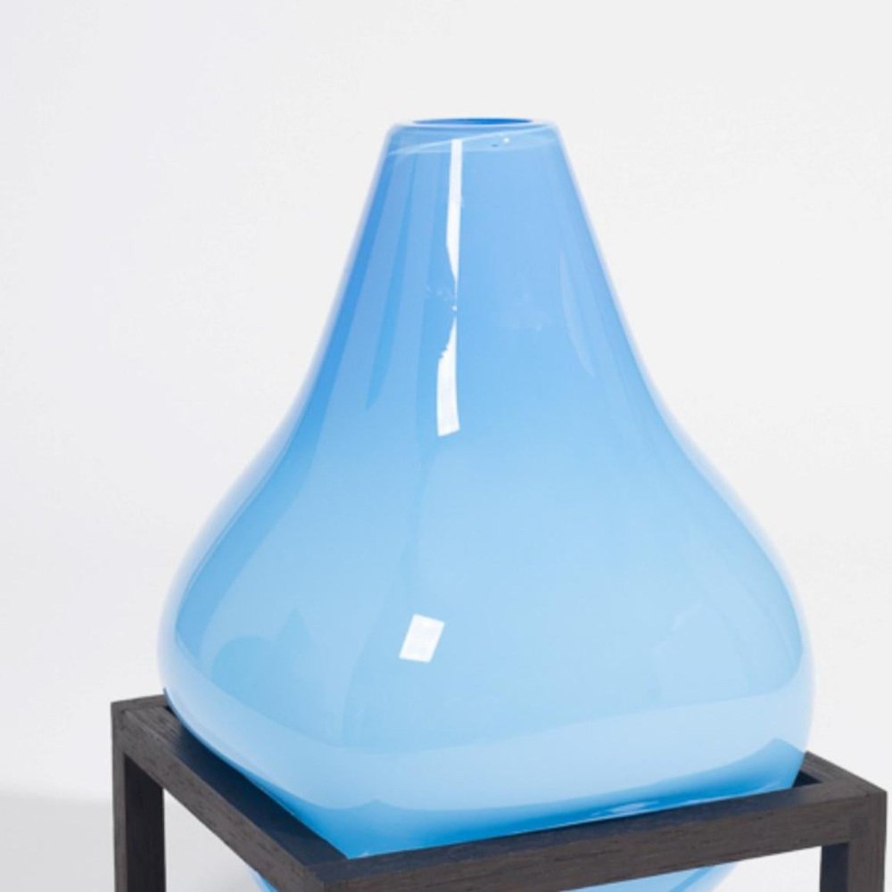 Set Of 2 Round Square Blue Bubble Vase by Studio Thier & van Daalen Dimensions: W 30 x D 30 x H 35cm Materials: Wood, Glass When blowing soap bubbles in the air Iris & Ruben had the dream to capture these temporary beauties in a tendril frame. The fascinating effect of a floating bubble which adapt to its surrounding until it snaps, was the inspiration for a new series of objects in glass combined with wood by Studio Thier&vanDaalen. They came up with the idea to blow a round bubble of glass in a square frame made from wood. To challenge two ancient handcrafts; free glassblowing and fine woodworking. Fascinated by the two different materials with their own unique properties and treatments; when combined, they have to deal with each other. Wet wood is commonly used as a mould in free hand glassblowing. But never as a definitive part of the end object. Iris and Ruben saw this as a beautiful element to use in the end result. The glass will mark the wood forever during blowing, therefor the wooden mould and its object in glass match perfectly together. with this new method Studio Thier&VanDaalen created different objects, to show your precious objects.