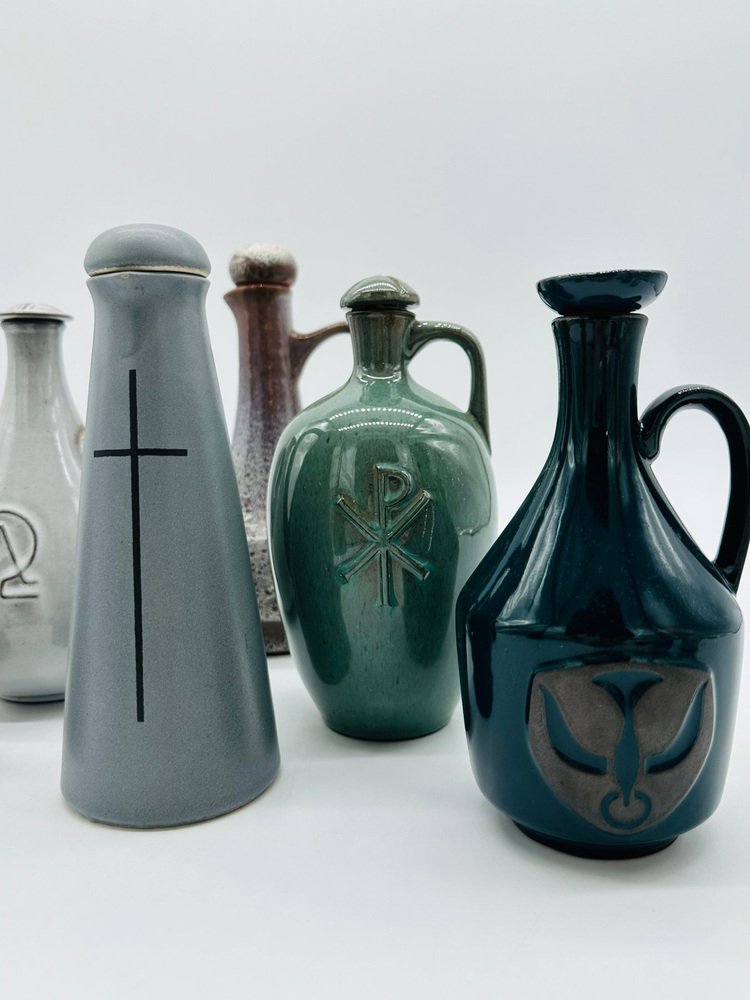Questo set di vasi per l'acqua santa della Germania occidentale della metà del secolo scorso (9 pezzi) offre una straordinaria miscela di design, artigianato e simbolismo, che lo rende molto interessante per i collezionisti e gli appassionati. Realizzati tra la fine degli anni Quaranta e gli anni Sessanta, questi vasi sono stati progettati per essere utilizzati nelle chiese, per contenere acqua santa o vino. Tuttavia, le loro forme slanciate e le loro tonalità eleganti e tenui hanno suscitato un'ammirazione che va ben oltre la loro funzione ecclesiastica originaria, rendendoli oggetti pregiati sia per i collezionisti religiosi che per quelli di design.