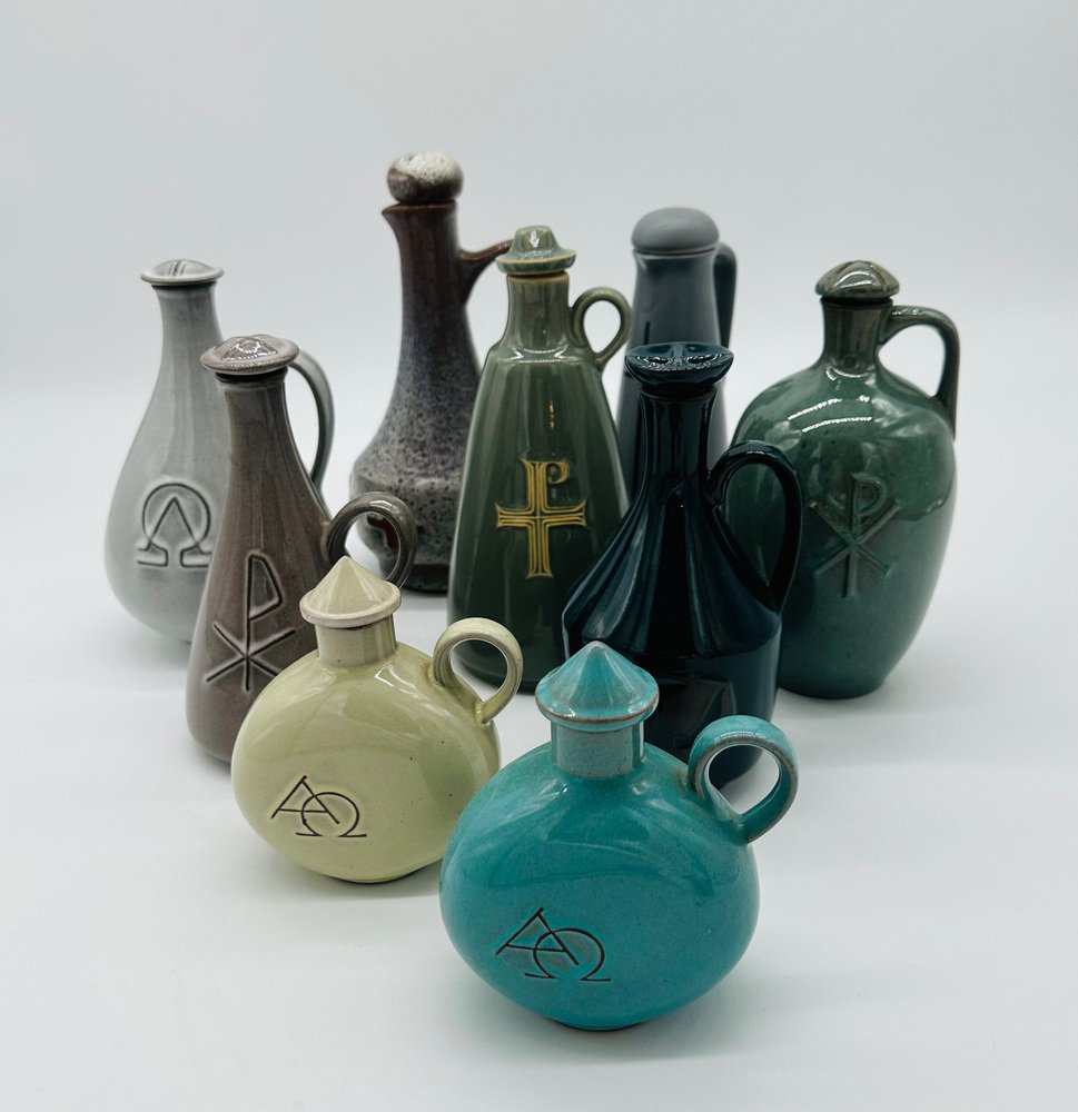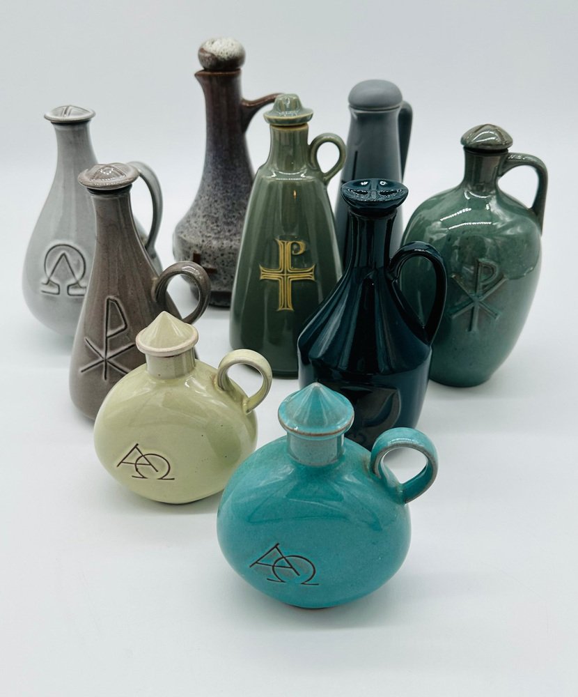 This Mid-Century Modern West German Holy Water Vessels Set (9 pieces) offers a striking blend of design, craftsmanship, and symbolism, making it highly appealing to collectors and enthusiasts. Crafted between the late 1940's and 1960s, these vessels were designed for use in churches, holding holy water or wine. However, their sleek forms and elegant, muted tones have earned them admiration far beyond their original ecclesiastical function, making them prized items for both religious and design collectors.