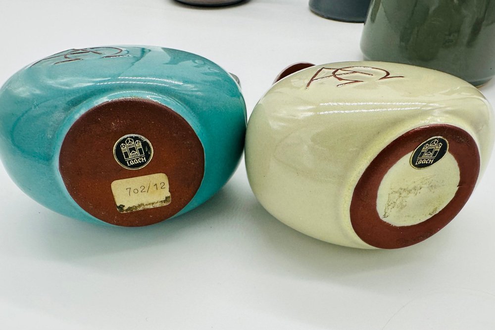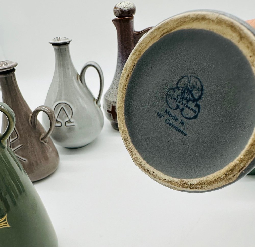 Among the nine pieces, two vessels are marked by Laach Abbey, where Theodor Bogler, a noted Bauhaus artist, established the ceramics workshop. Another piece is marked by Ulmer Keramik, a renowned West German pottery studio. Some of the vessels bear only numerical marks or “West Germany,” a designation used by post-WWII West German potteries, further connecting this set to the broader history of mid-century ceramics. This mix of markings speaks to the variety of producers during this era, highlighting the diversity within West German pottery.