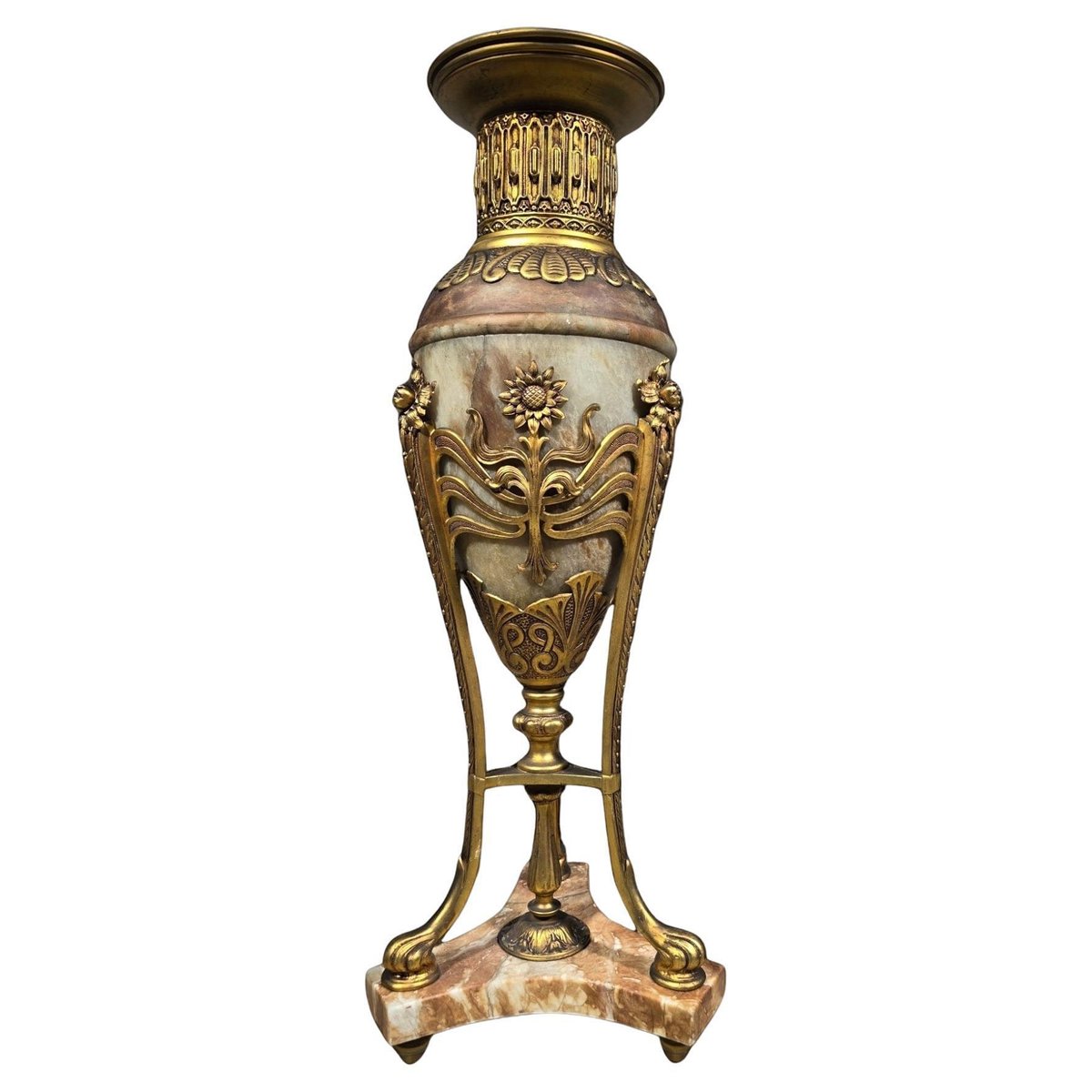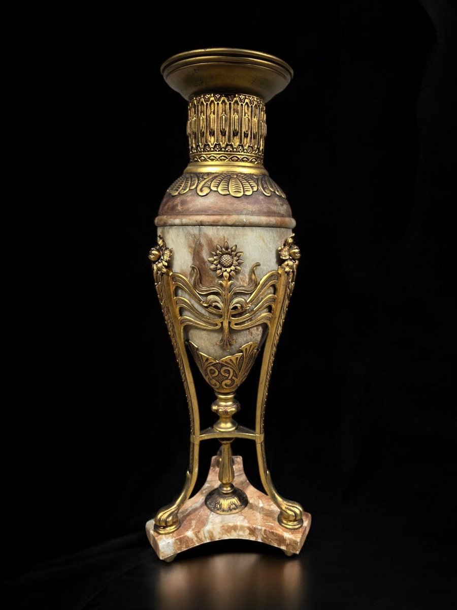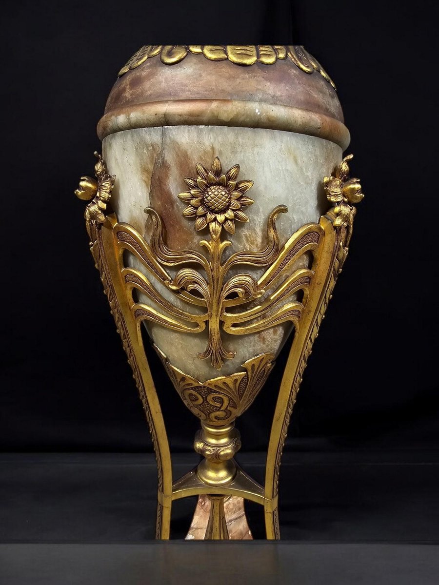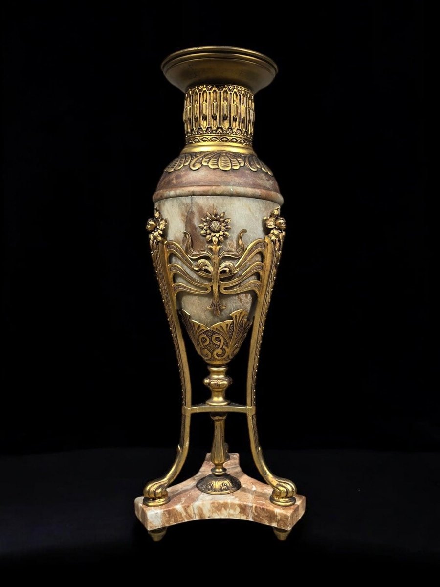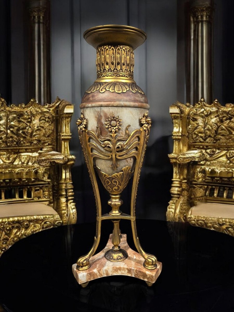 We present a magnificent large vase crafted from onyx and bronze, dating from the late 19th century, exemplifying the elegance and distinctive style of the Art Nouveau period. This exceptional vase, possibly of French origin, embodies the refinement and organic aesthetics of this artistic movement. Key Features: High-Quality Materials: This vase is made from onyx, a precious stone known for its beautiful veining and smooth texture, adding a touch of luxury and sophistication. The bronze, used for ornamental details, provides a rich and elegant contrast to the overall design. Art Nouveau Design: True to the Art Nouveau style, this vase features fluid lines and natural forms, evoking the harmony between art and nature. The bronze details reflect the influence of flora and fauna, characteristic of the movement. Possible French Origin: While the exact origin is not confirmed, this vase bears the distinctive marks of late 19th-century French craftsmanship, renowned for producing high-quality art objects. Specifications: Materials: Onyx and bronze Period: Late 19th century Dimensions: 75 cm in height x 25 cm in diameter A Remarkable Collectible Piece: This large onyx and bronze vase is a decorative masterpiece that will elevate the elegance of any interior. Its impressive size and sophisticated design make it a focal point in any space, whether in a private residence or an art collection. Its association with the Art Nouveau period also makes it a valuable historical piece. Don’t miss the opportunity to add this exceptional piece to your collection, a timeless testament to the elegance and craftsmanship of the late 19th century.