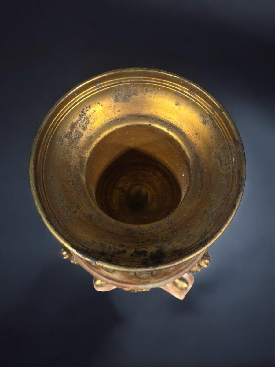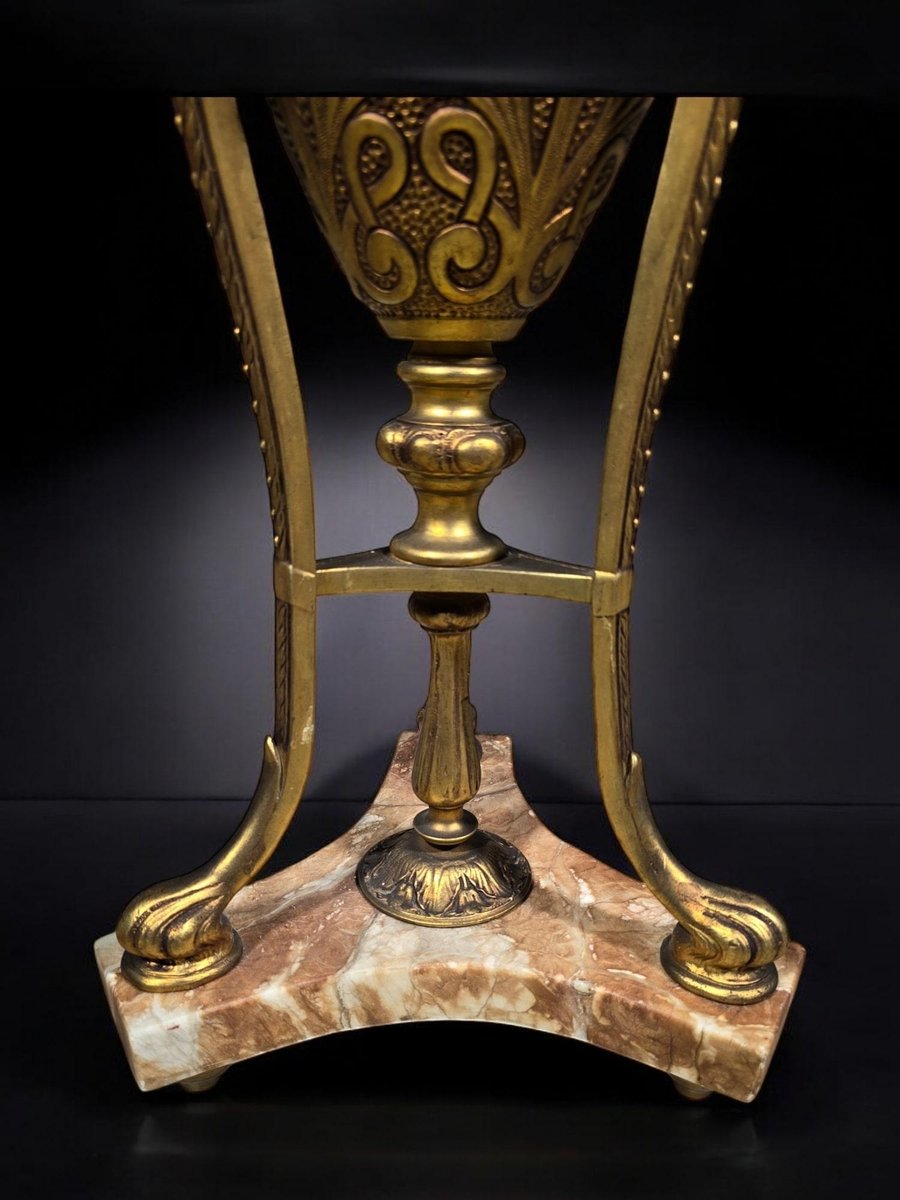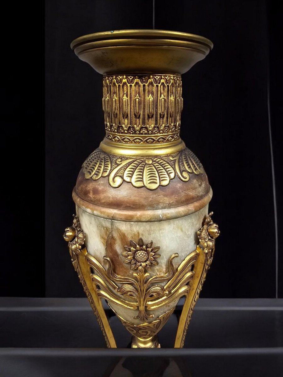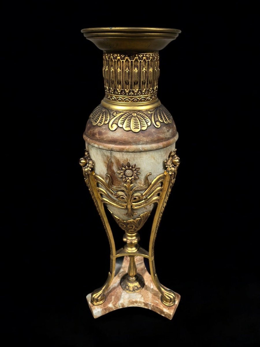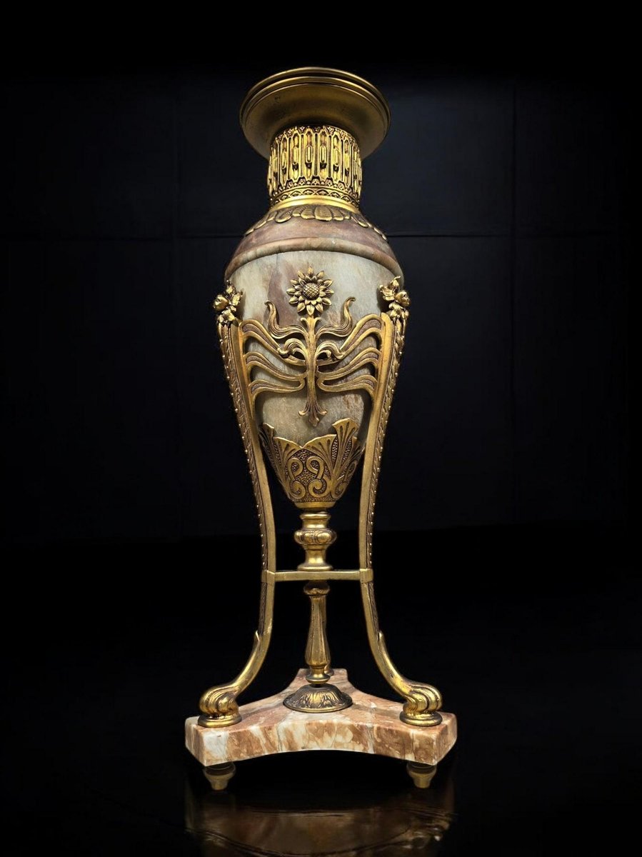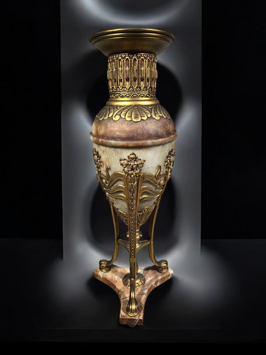 We present a magnificent large vase crafted from onyx and bronze, dating from the late 19th century, exemplifying the elegance and distinctive style of the Art Nouveau period. This exceptional vase, possibly of French origin, embodies the refinement and organic aesthetics of this artistic movement. Key Features: High-Quality Materials: This vase is made from onyx, a precious stone known for its beautiful veining and smooth texture, adding a touch of luxury and sophistication. The bronze, used for ornamental details, provides a rich and elegant contrast to the overall design. Art Nouveau Design: True to the Art Nouveau style, this vase features fluid lines and natural forms, evoking the harmony between art and nature. The bronze details reflect the influence of flora and fauna, characteristic of the movement. Possible French Origin: While the exact origin is not confirmed, this vase bears the distinctive marks of late 19th-century French craftsmanship, renowned for producing high-quality art objects. Specifications: Materials: Onyx and bronze Period: Late 19th century Dimensions: 75 cm in height x 25 cm in diameter A Remarkable Collectible Piece: This large onyx and bronze vase is a decorative masterpiece that will elevate the elegance of any interior. Its impressive size and sophisticated design make it a focal point in any space, whether in a private residence or an art collection. Its association with the Art Nouveau period also makes it a valuable historical piece. Don’t miss the opportunity to add this exceptional piece to your collection, a timeless testament to the elegance and craftsmanship of the late 19th century.
