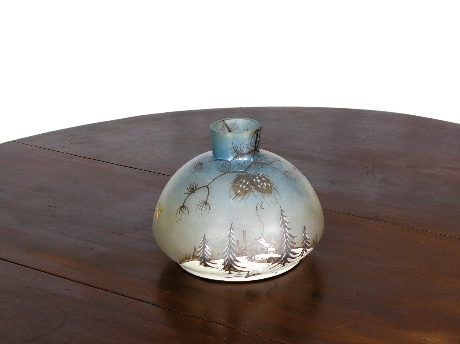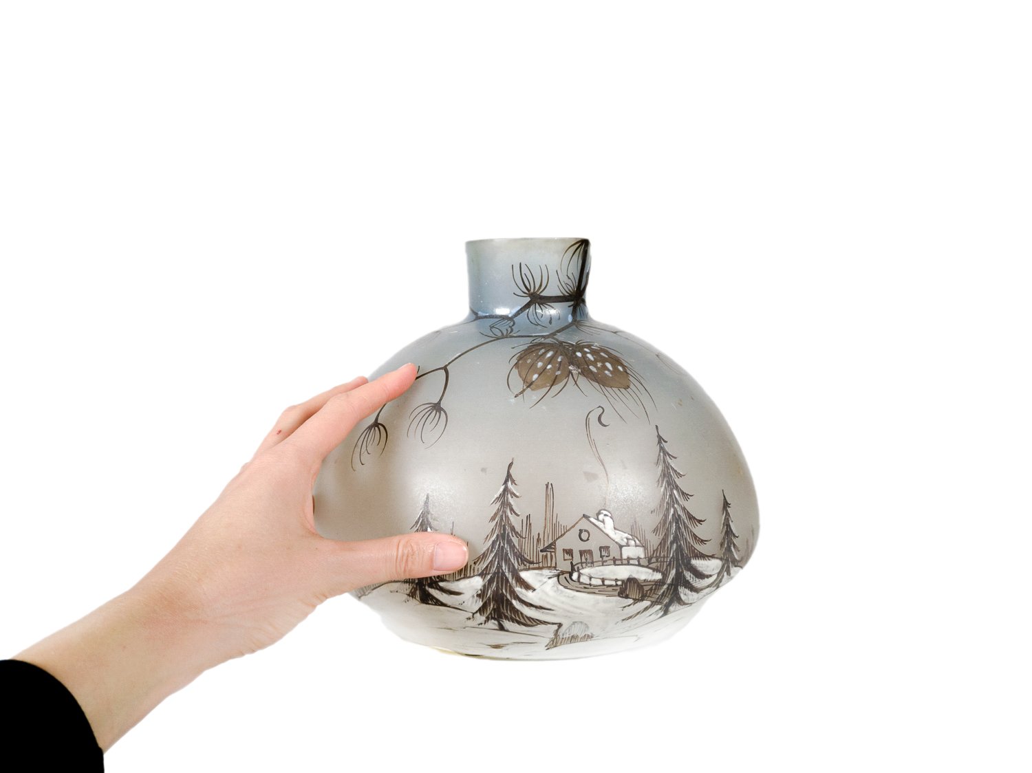 This vase is decorated with a winter landscape featuring pine trees, naturalistic details, and a house with a smoking chimney.