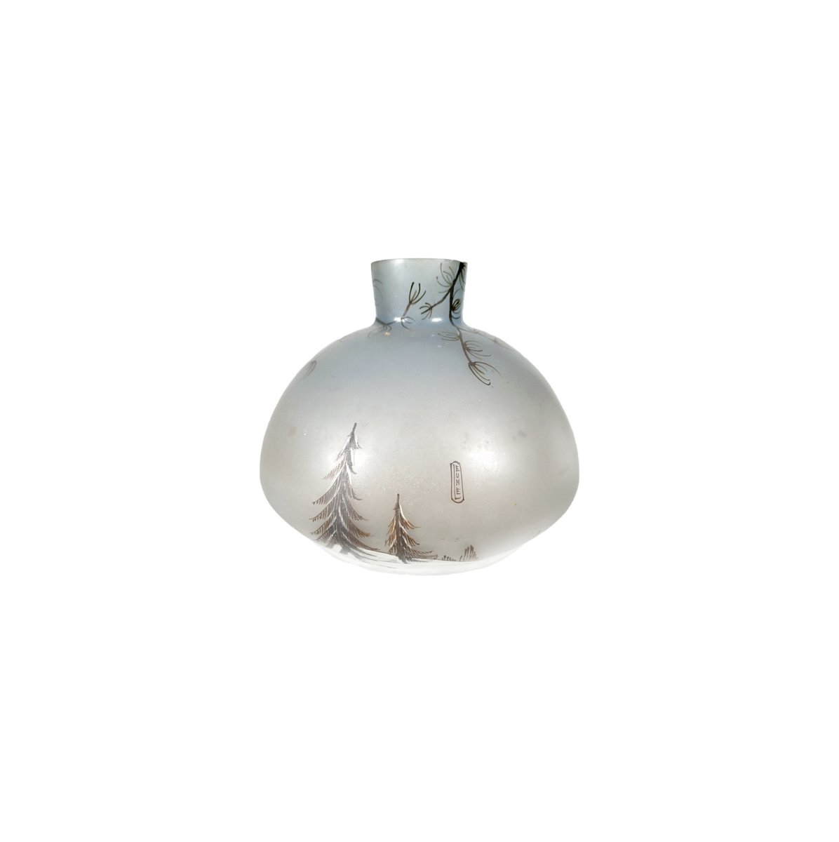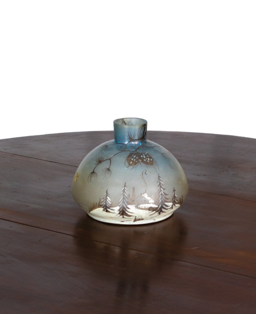 Vaso in vetro smaltato Art Nouveau dei primi del XX secolo realizzato da Leune, ispirato alle famose opere dei fratelli Daum di Nancy, in Francia. Questo vaso è decorato con un paesaggio invernale caratterizzato da pini, dettagli naturalistici e una casa con il fumo che esce dal camino. Questo vaso Art Nouveau mette in mostra la delicata maestria artigianale tipica dell'École de Nancy, dove le forme naturali e le linee fluide hanno definito una generazione di arte decorativa.
