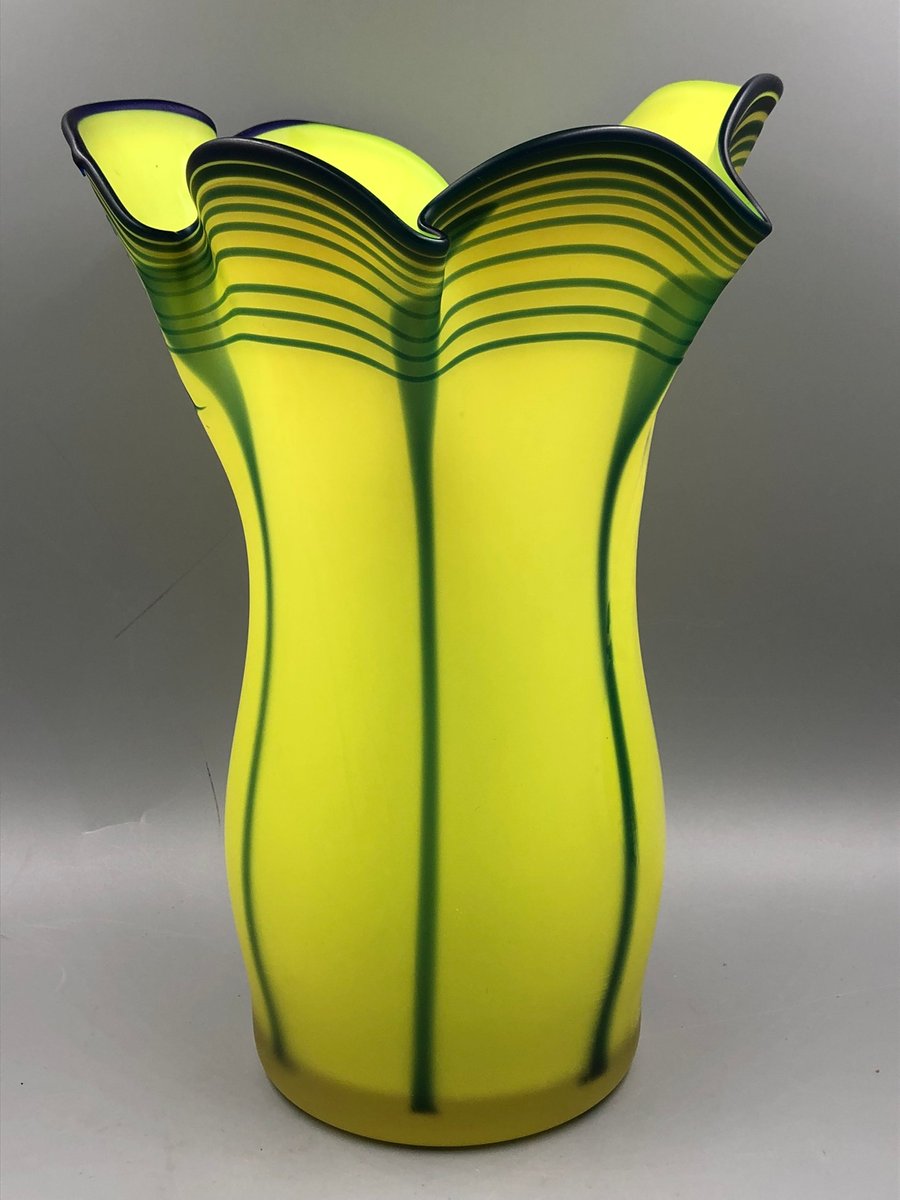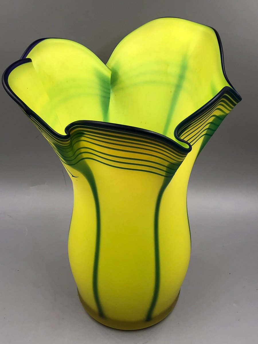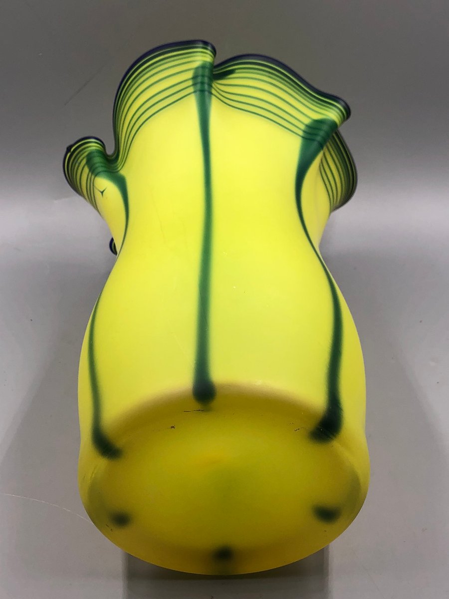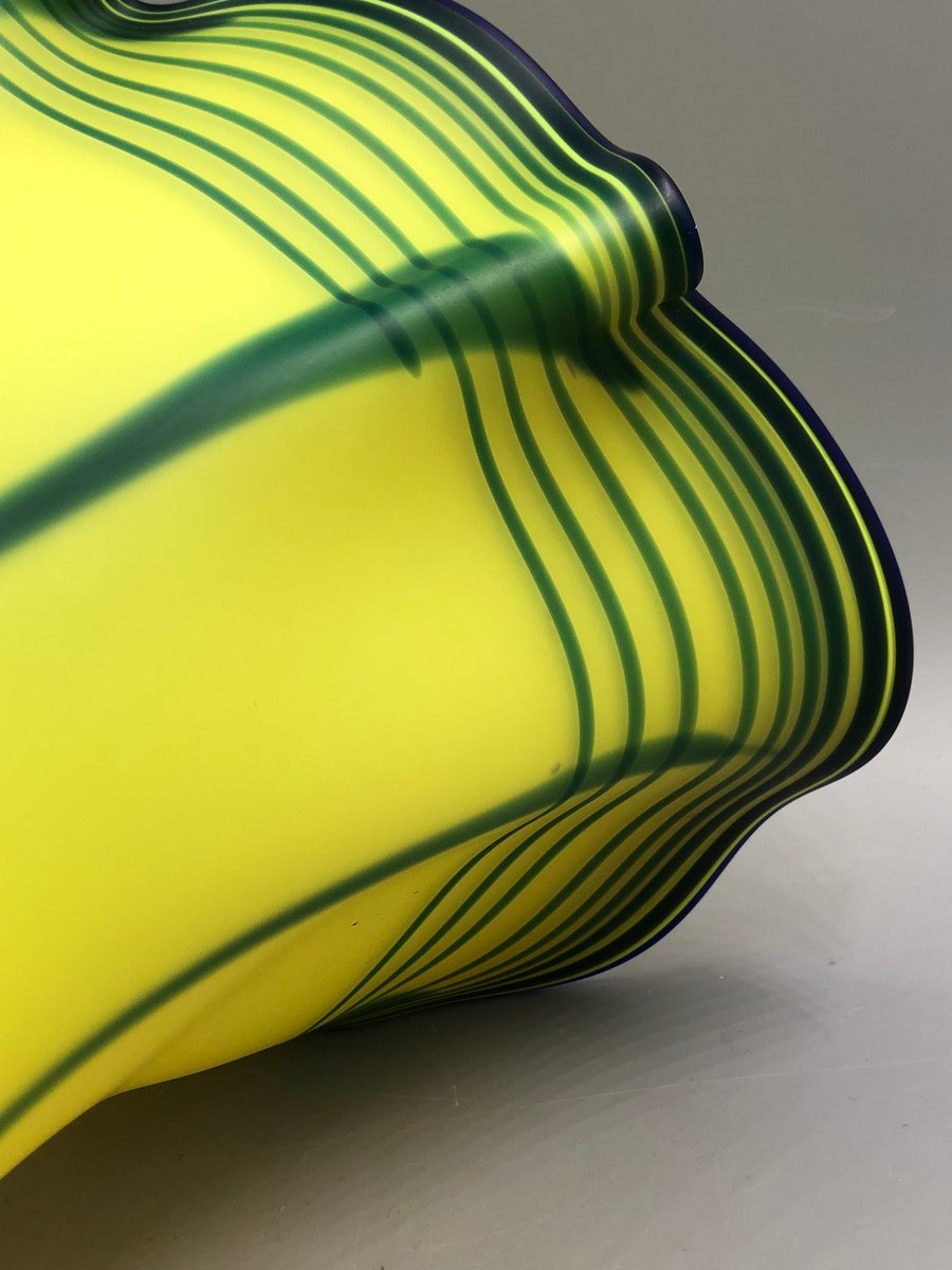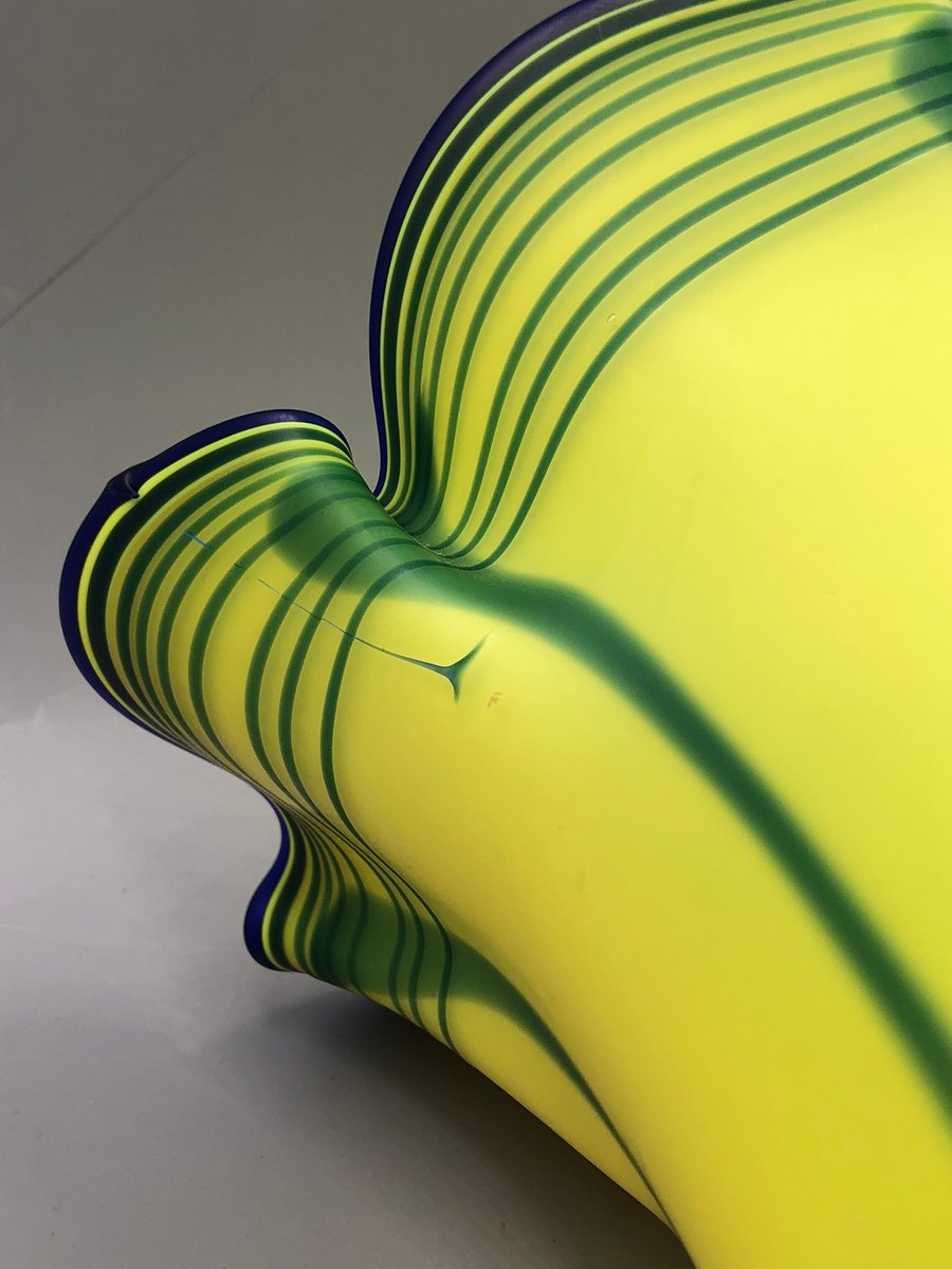 Questo pezzo unico e mozzafiato di arte vetraria colpisce per la sua forma stravagante, insolita per l'epoca, che ricorda un calice di fiori in movimento in un caldo vento estivo. L'affascinante contrasto di colori tra il giallo brillante come colore di base e il blu intenso e il verde-blu, che avvolge il vaso in linee ampie, rende questo grande oggetto unico. È un assoluto colpo d'occhio che non abbiamo mai visto prima. Un vaso in vetro veramente decorativo e moderno del XX secolo in condizioni originali incontaminate. Firmato "Eisch" sul fondo.