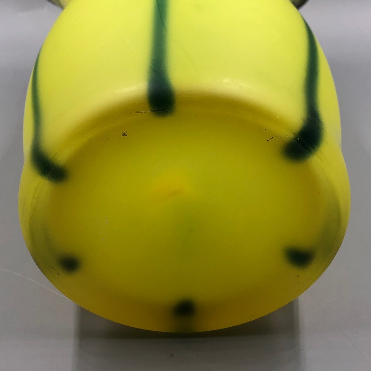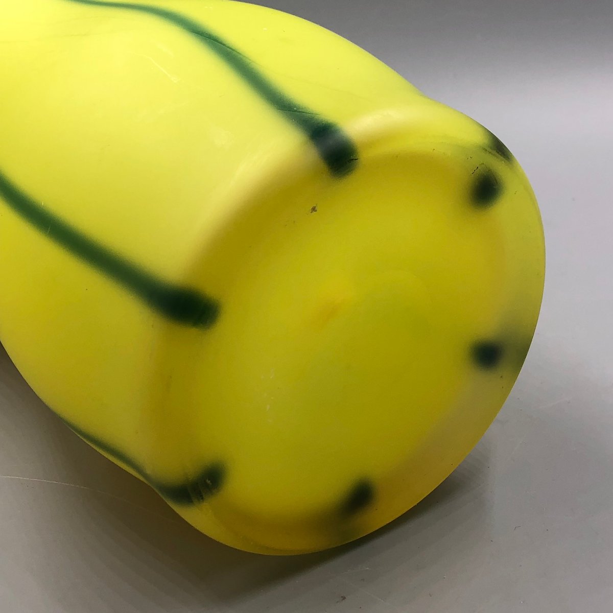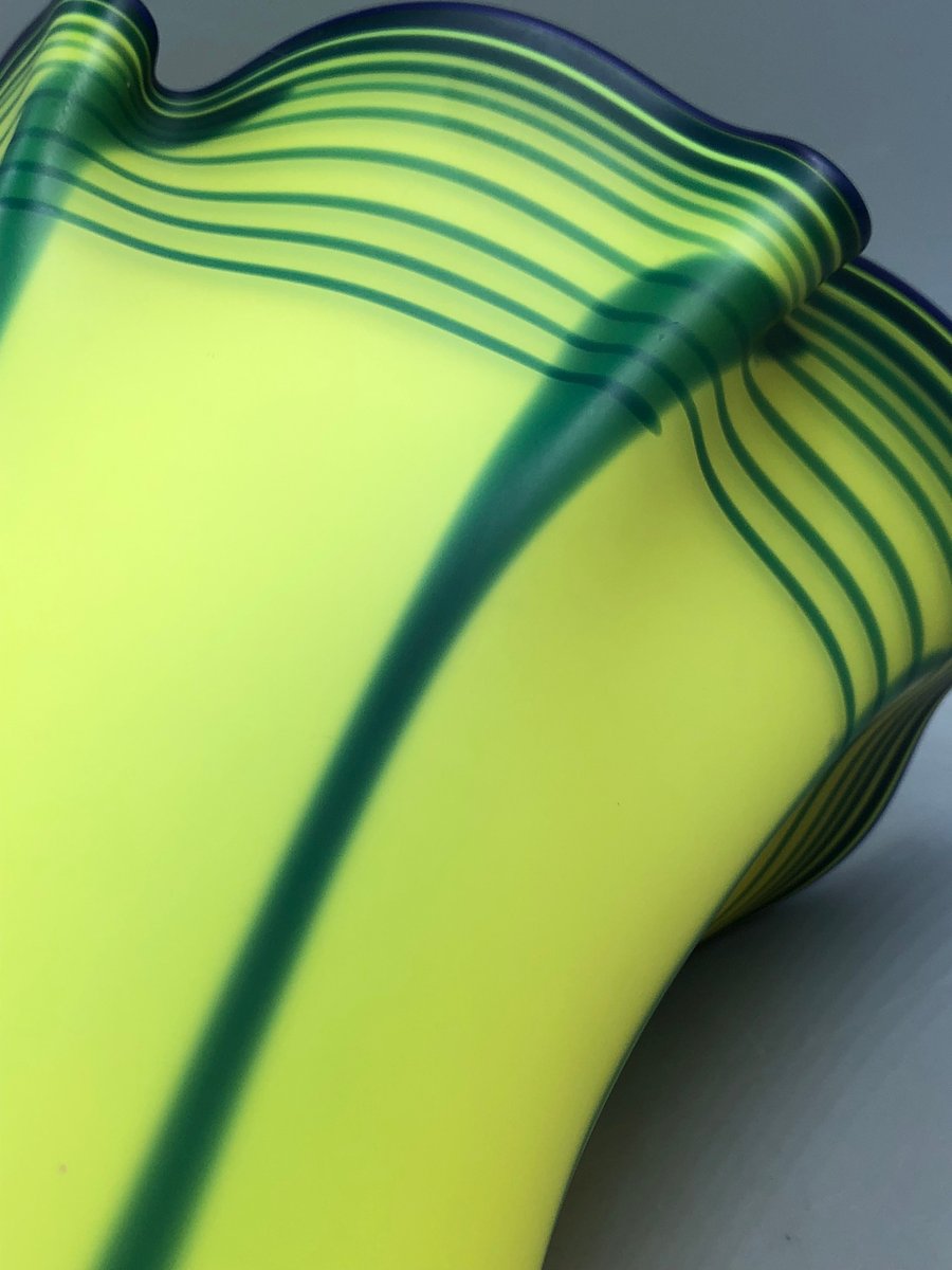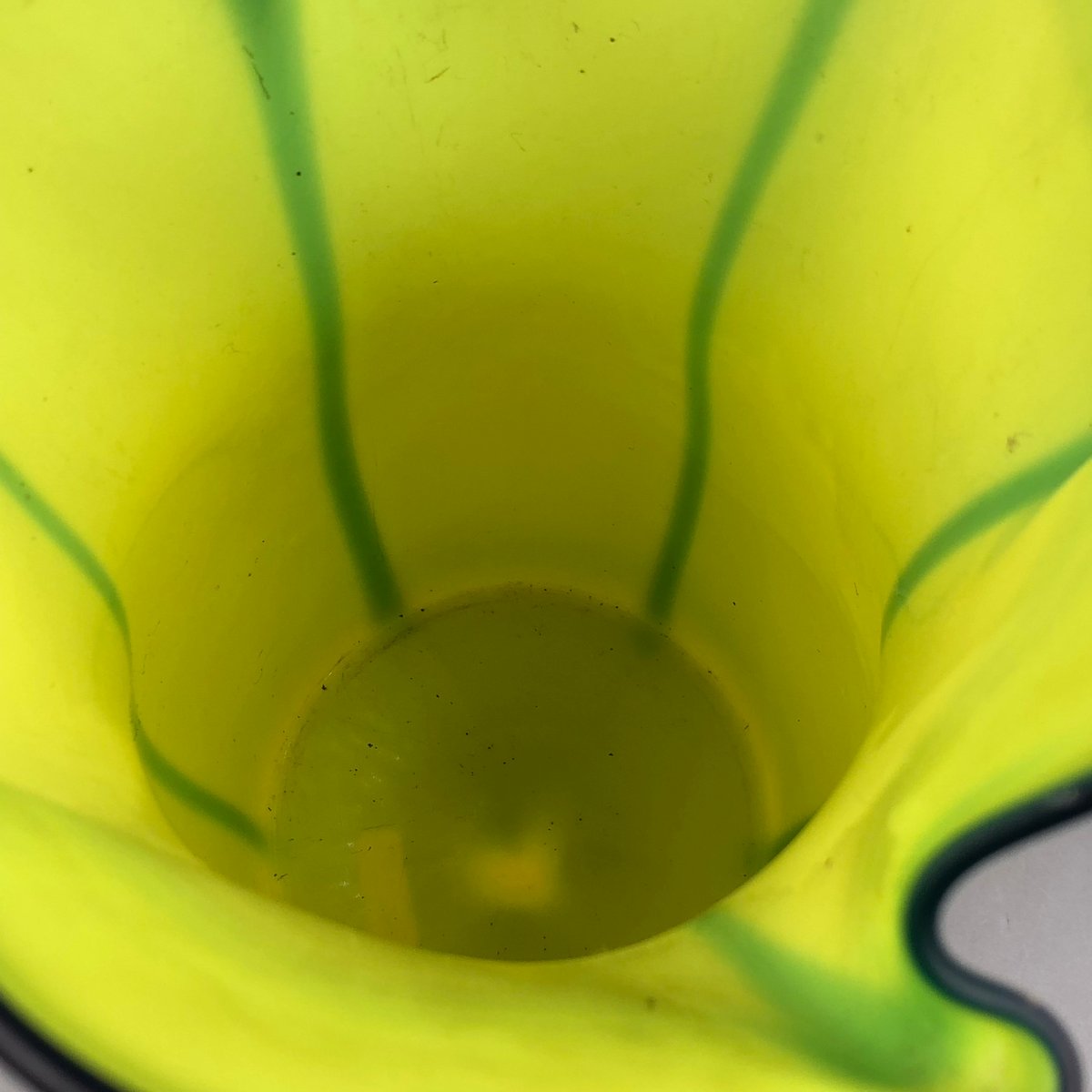 Questo pezzo unico e mozzafiato di arte vetraria colpisce per la sua forma stravagante, insolita per l'epoca, che ricorda un calice di fiori in movimento in un caldo vento estivo. L'affascinante contrasto di colori tra il giallo brillante come colore di base e il blu intenso e il verde-blu, che avvolge il vaso in linee ampie, rende questo grande oggetto unico. È un assoluto colpo d'occhio che non abbiamo mai visto prima. Un vaso in vetro veramente decorativo e moderno del XX secolo in condizioni originali incontaminate. Firmato "Eisch" sul fondo.