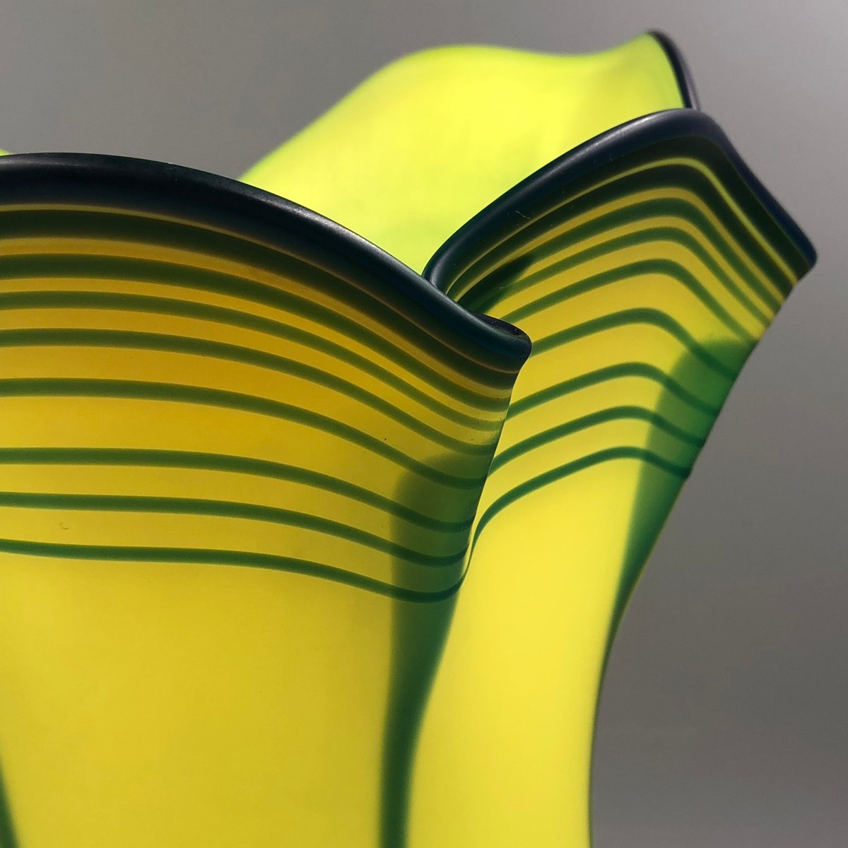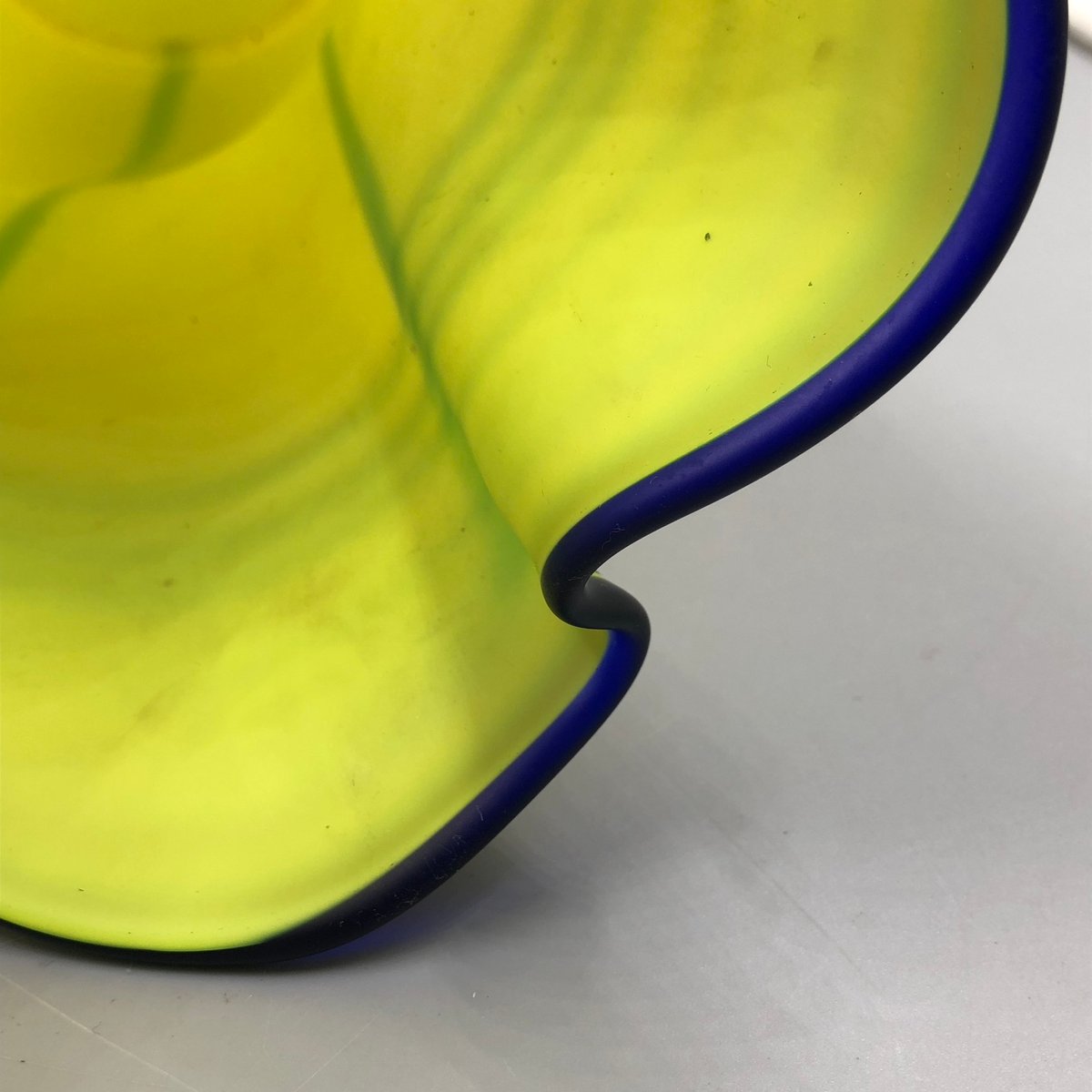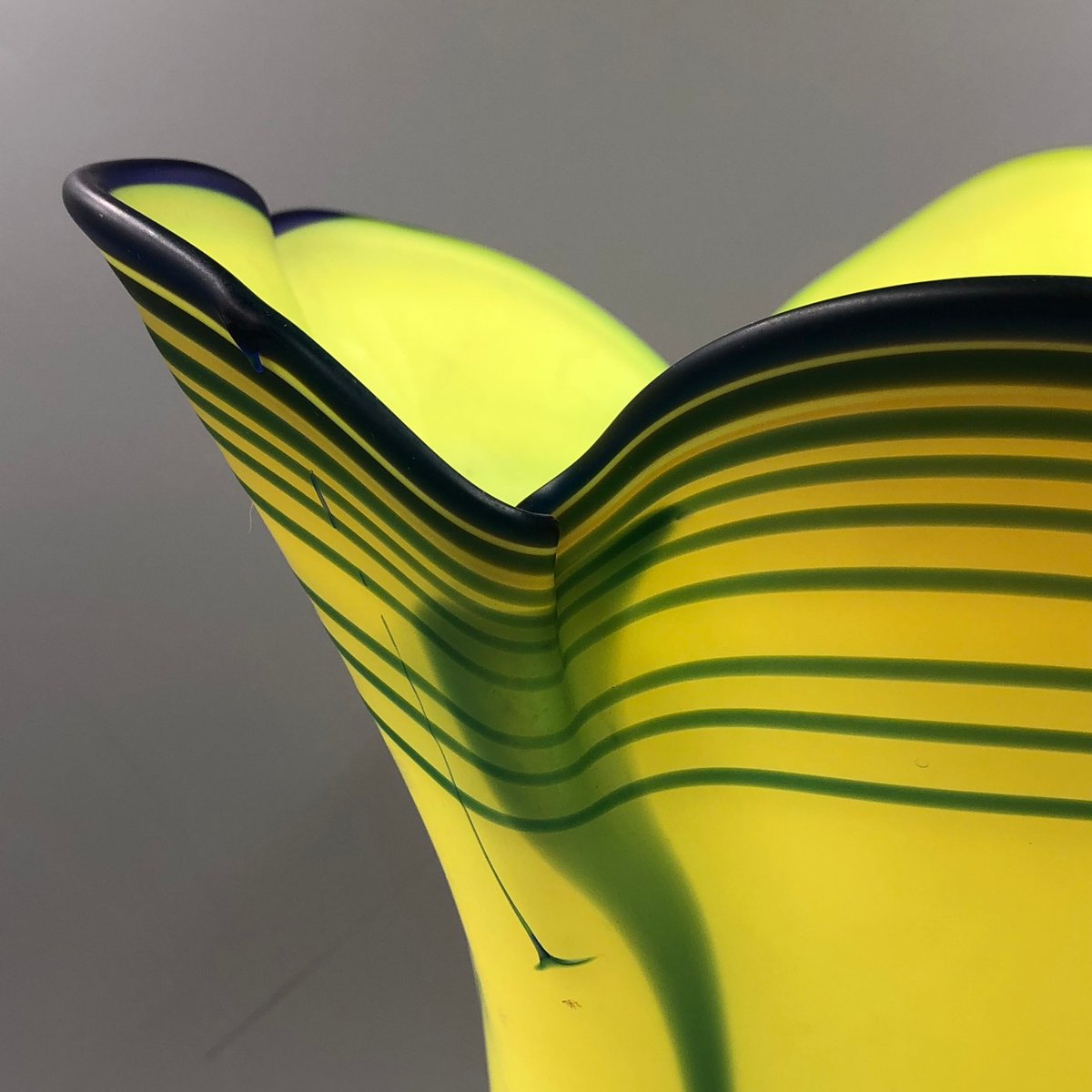 This breathtaking, unique piece of glass art impresses with its extravagant shape, which was unusual for the time and is reminiscent of a moving calyx of flowers in a warm summer wind. The fascinating contrasting colors of bright yellow as the base color and deep blue to blue-green, which wraps around the vase in sweeping lines, make this great object unique. It is an absolute eye-catcher that we have never seen before. A truly decorative, modern 20th century glass vase in pristine original condition. Signed with "Eisch" on the bottom.
