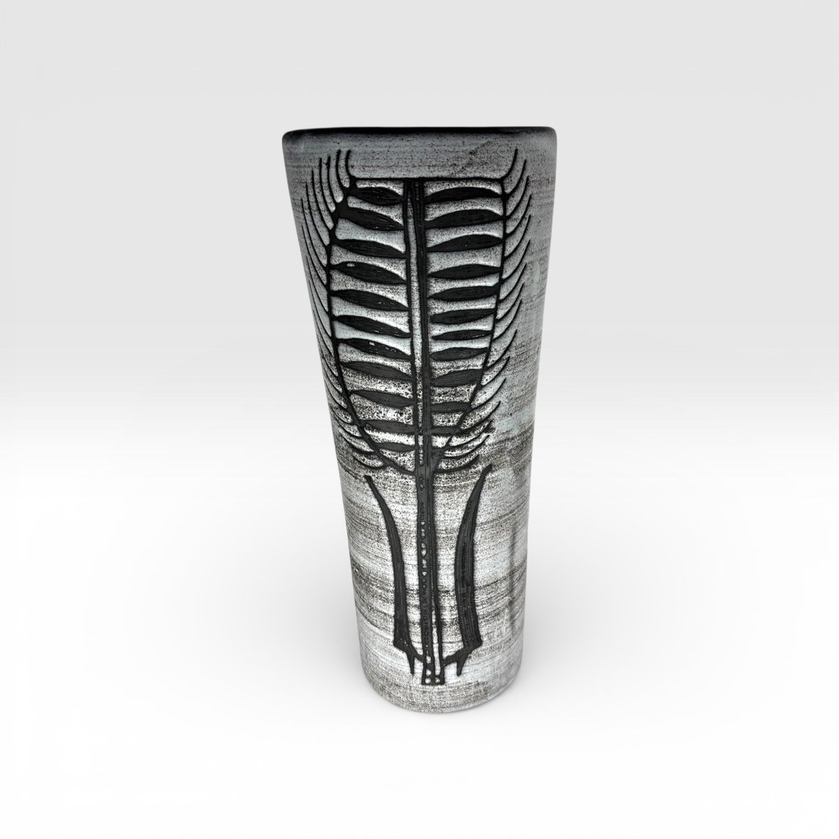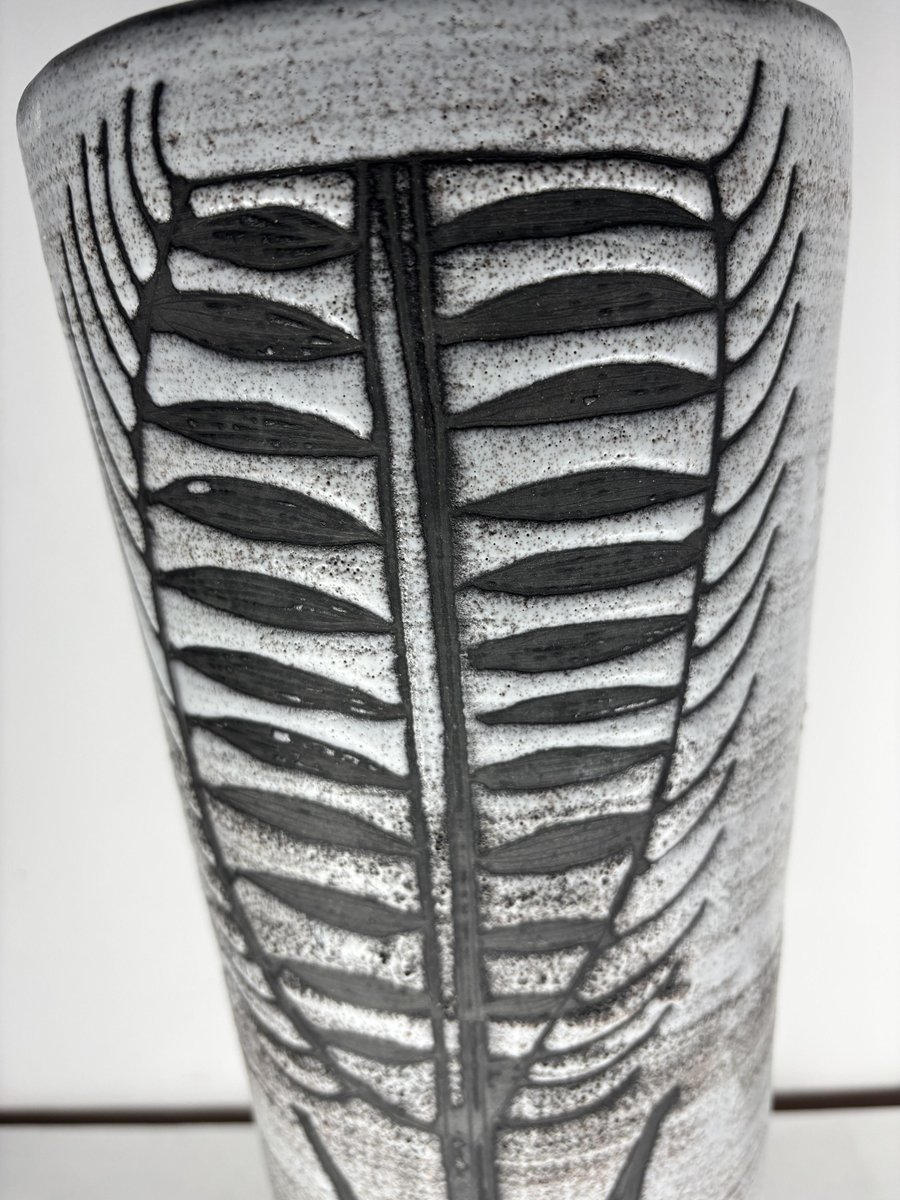 Grande vaso in ceramica realizzato nel laboratorio Dieulefit da Jacques Pouchain, Francia, 1960 circa. Questo vaso ha una forma cilindrica slanciata, accentuata da una decorazione incisa verticalmente con motivi vegetali stilizzati. Il motivo scuro, reso in rilievo e incisione, contrasta con uno sfondo grigio sfumato dalla texture leggermente granulosa, caratteristica della ceramica Dieulefit. L'effetto complessivo è una composizione grafica sobria e una forte presenza scultorea.