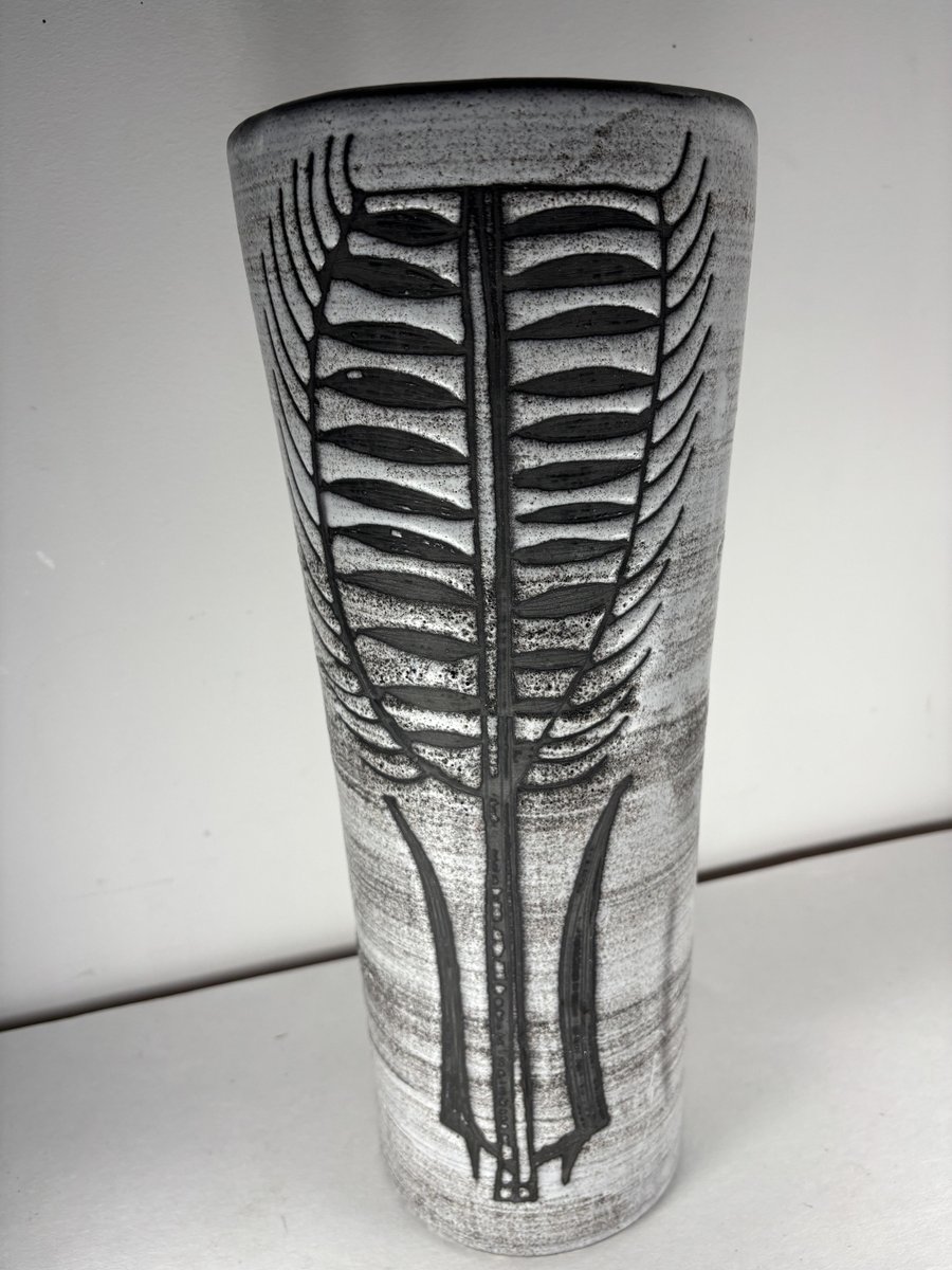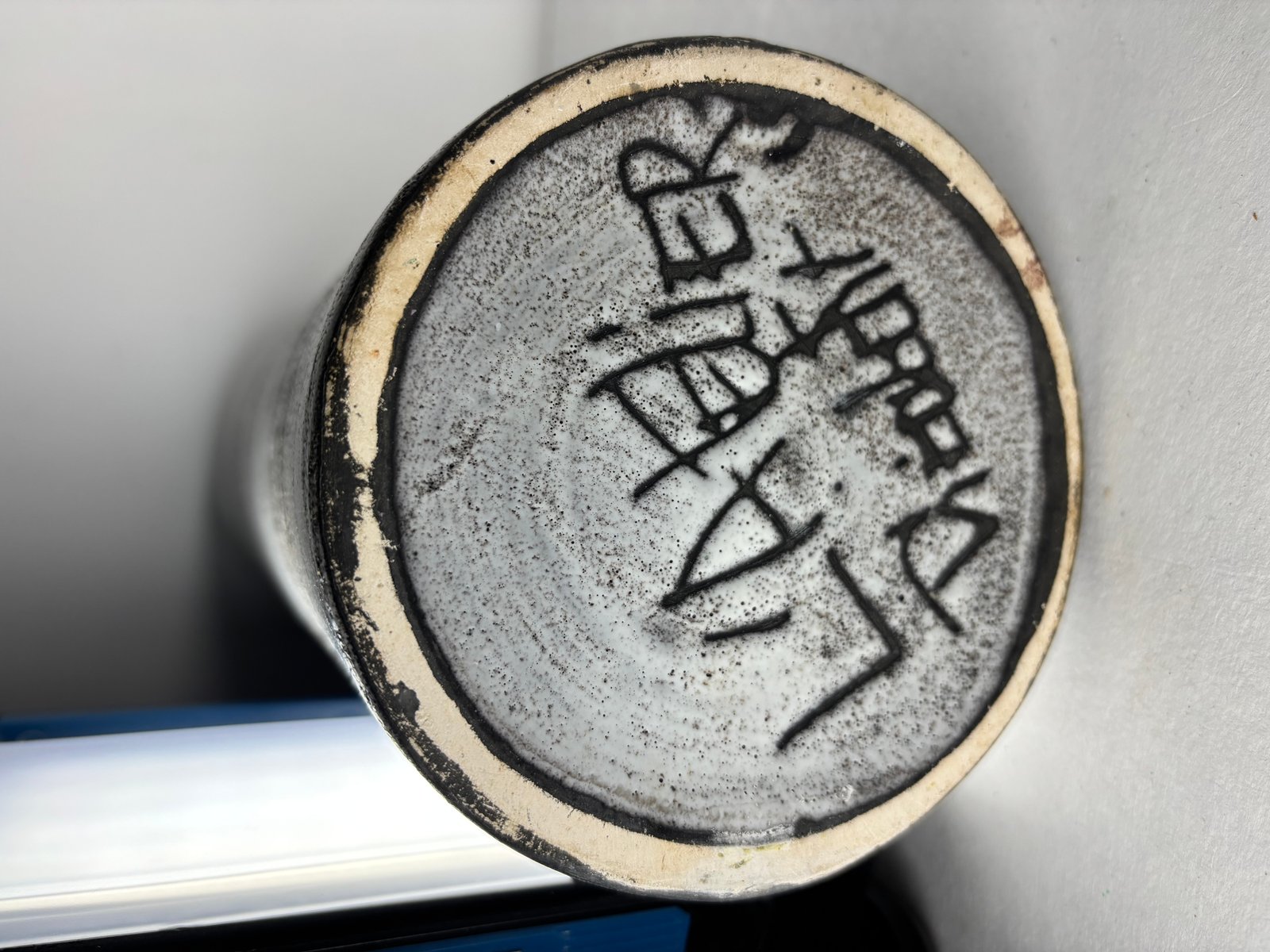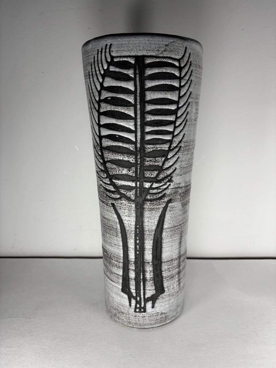 Il vaso può essere utilizzato come oggetto decorativo autonomo o come elemento scultoreo in un interno contemporaneo o in una galleria. Dimensioni Altezza: 38 cm Diametro: 16 cm Peso 3,7 kg Condizioni Ottime condizioni vintage. Nessuna scheggiatura, crepa o riparazione. Lievi tracce legate alla produzione e alla cottura, visibili principalmente sulla base, coerenti con la produzione artigianale di questo periodo.