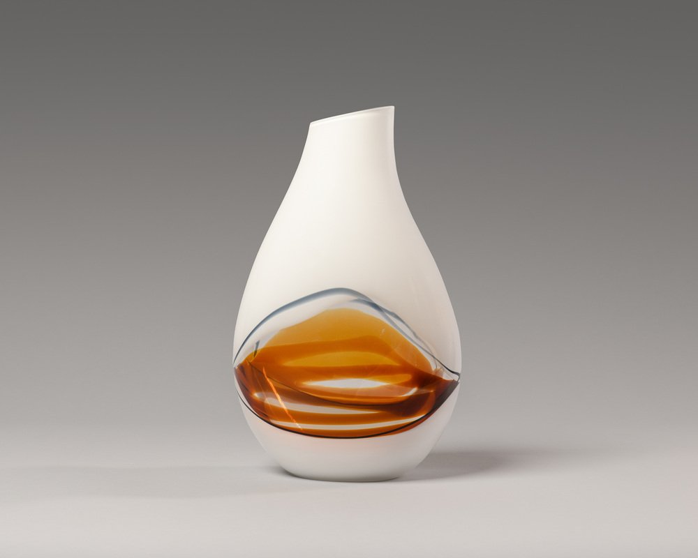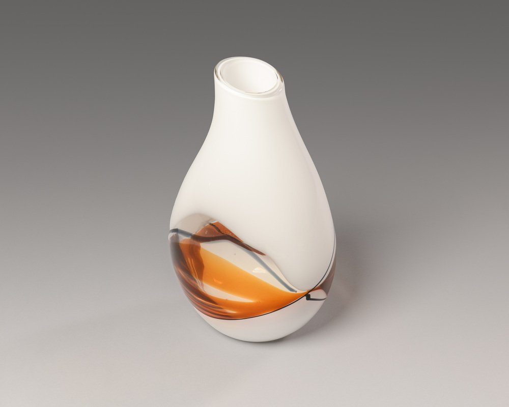Vaso asimmetrico in vetro bianco con decorazione grafica ambrata su vetro trasparente, della linea "Lips" disegnata da Livio Seguso e prodotta da Seguso AV (Arte Vetro) a metà degli anni Settanta.