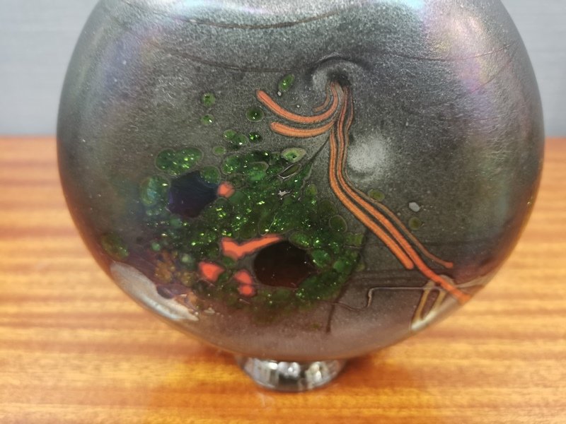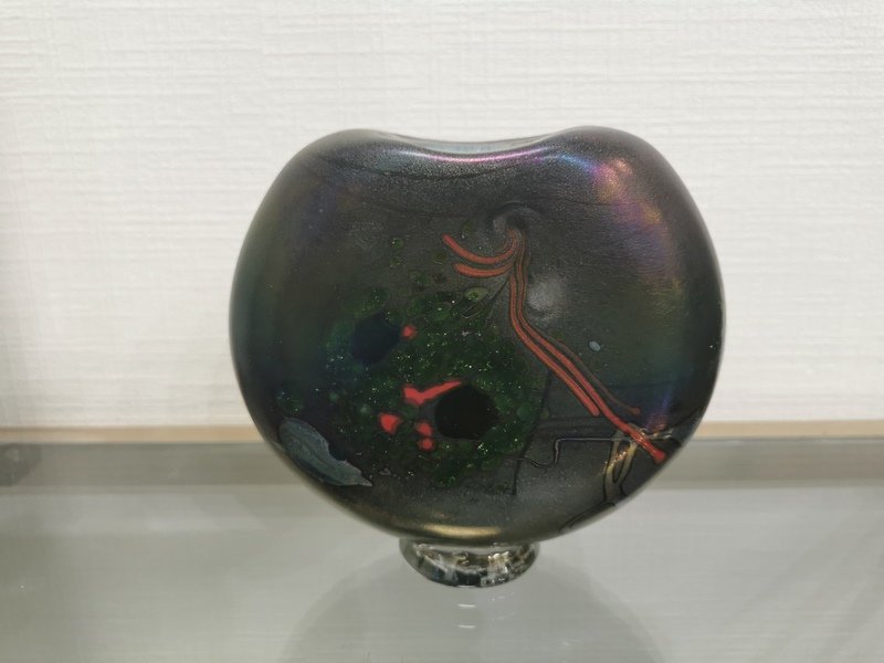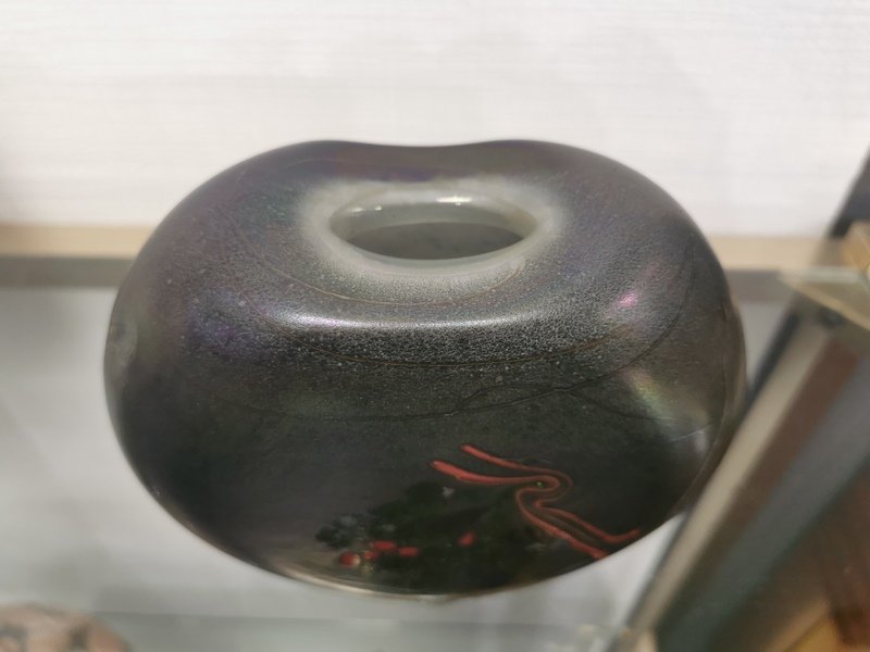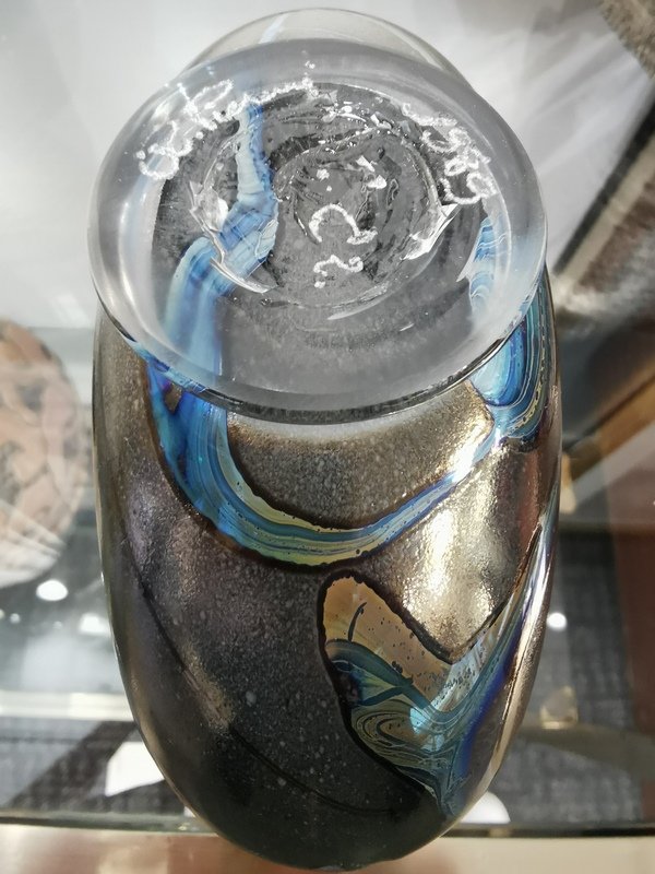 A friend of the Studio Glass Movement, the master glassmaker has chosen to turn away from tableware in favor of unique pieces, vases, bottles and other sculptures. After an initial period of classically inspired vases, he reduced his palette with his vases with feet and necks connected by a cord.