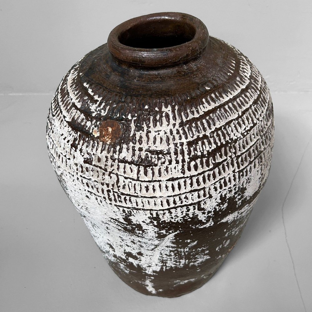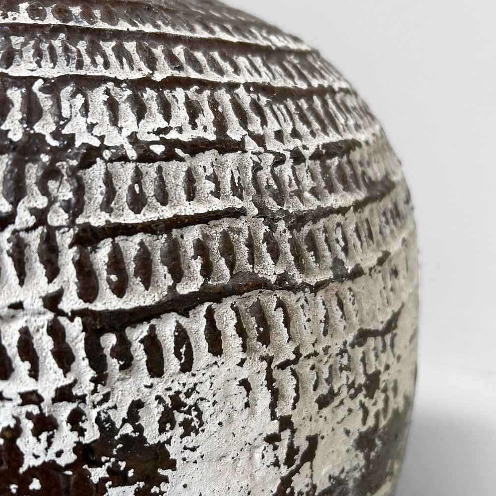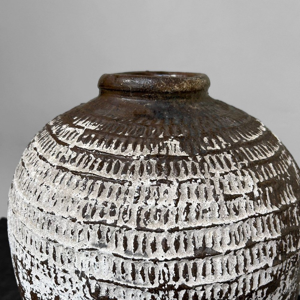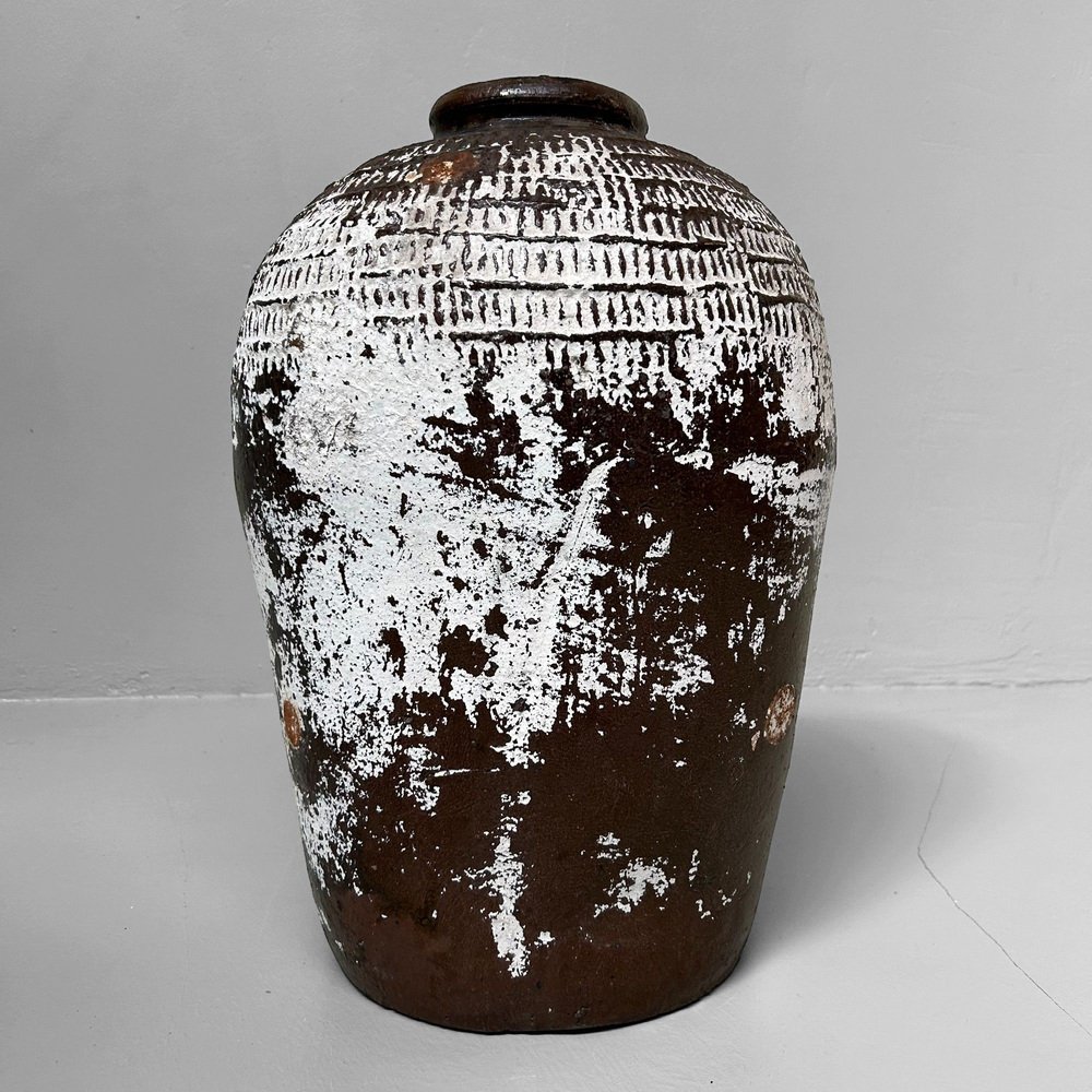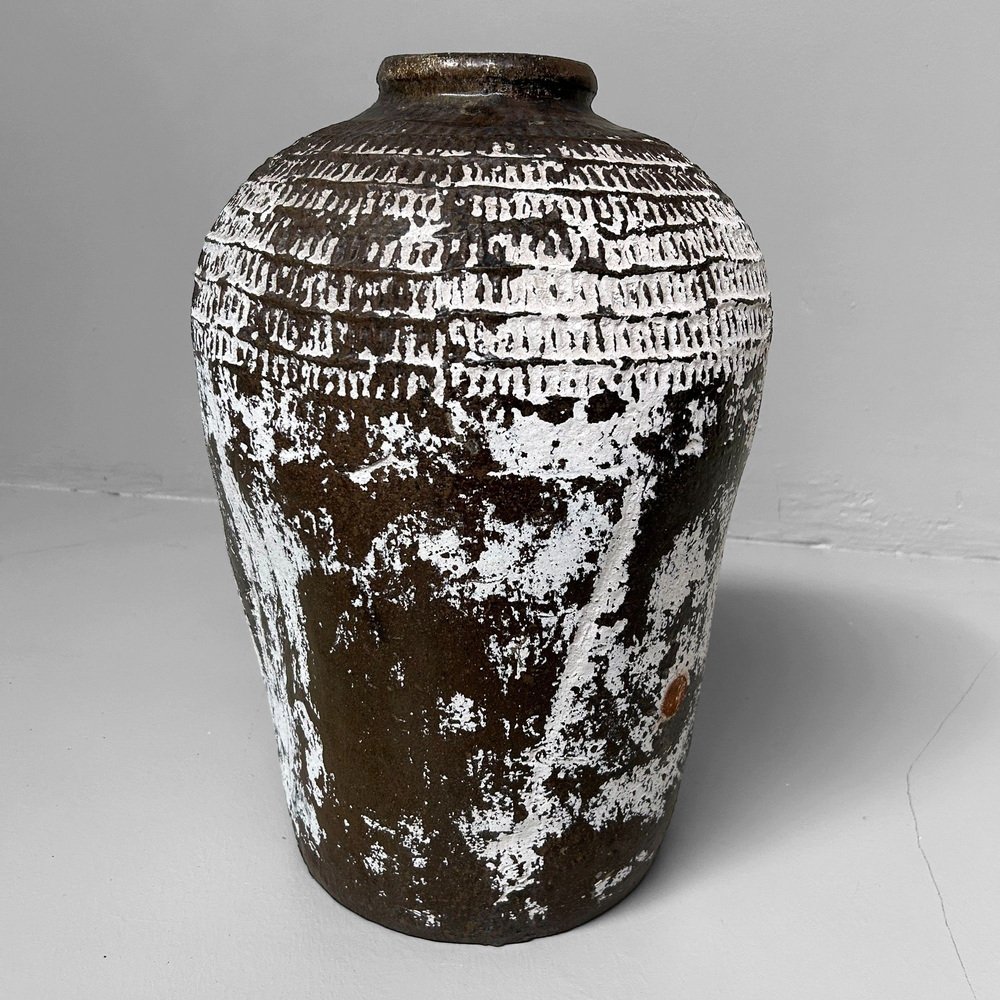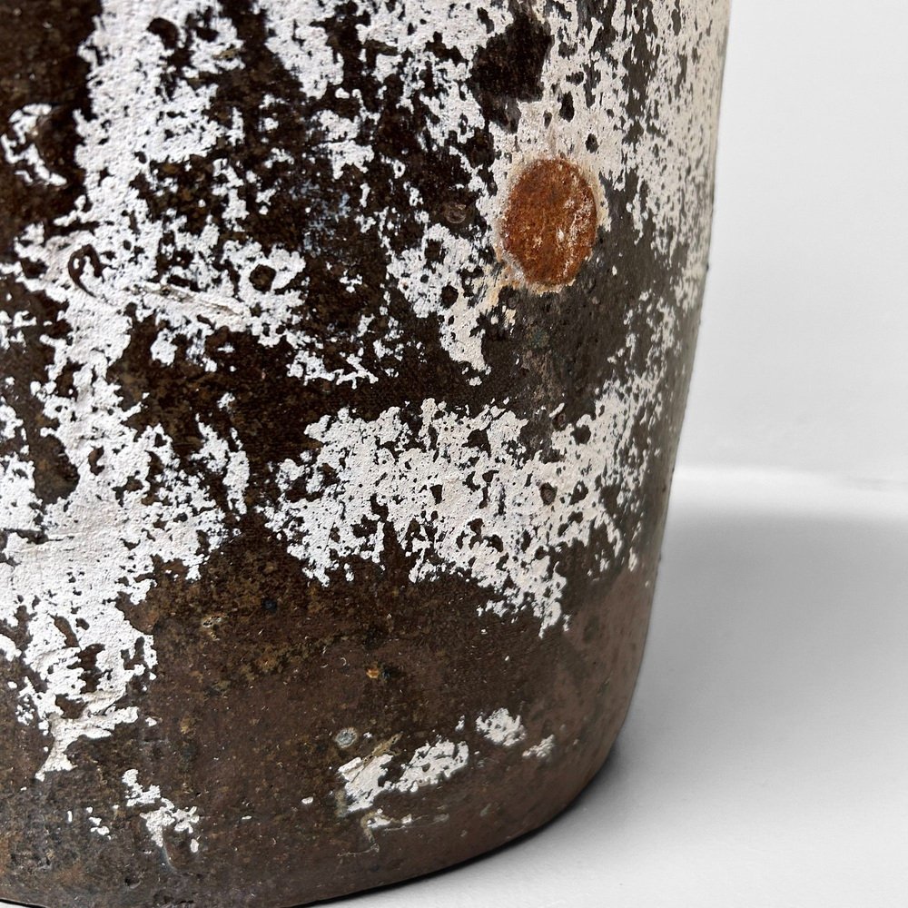 Il vaso ha una forma robusta e leggermente affusolata con un collo stretto e leggermente rialzato. La consistenza della ceramica è ruvida e organica, con una base marrone-nero profondo ricoperta da un sottile smalto bianco cenere. Lo smalto è stato applicato in modo non uniforme, creando un bellissimo motivo di erosione e vibrazione che ricorda la tradizionale ceramica cotta a legna.