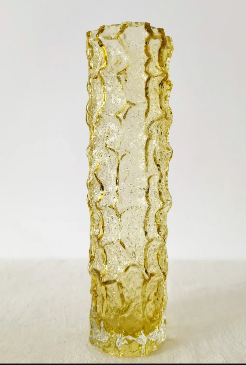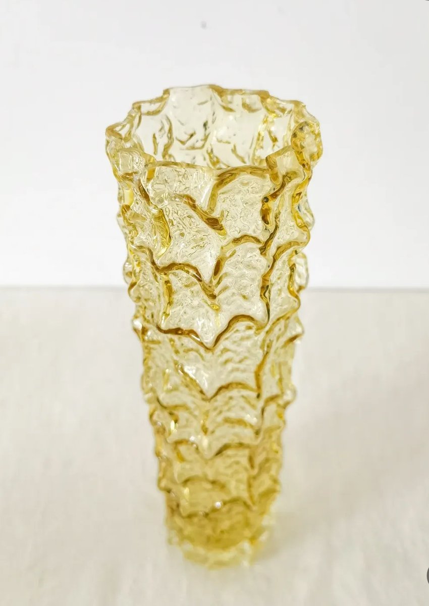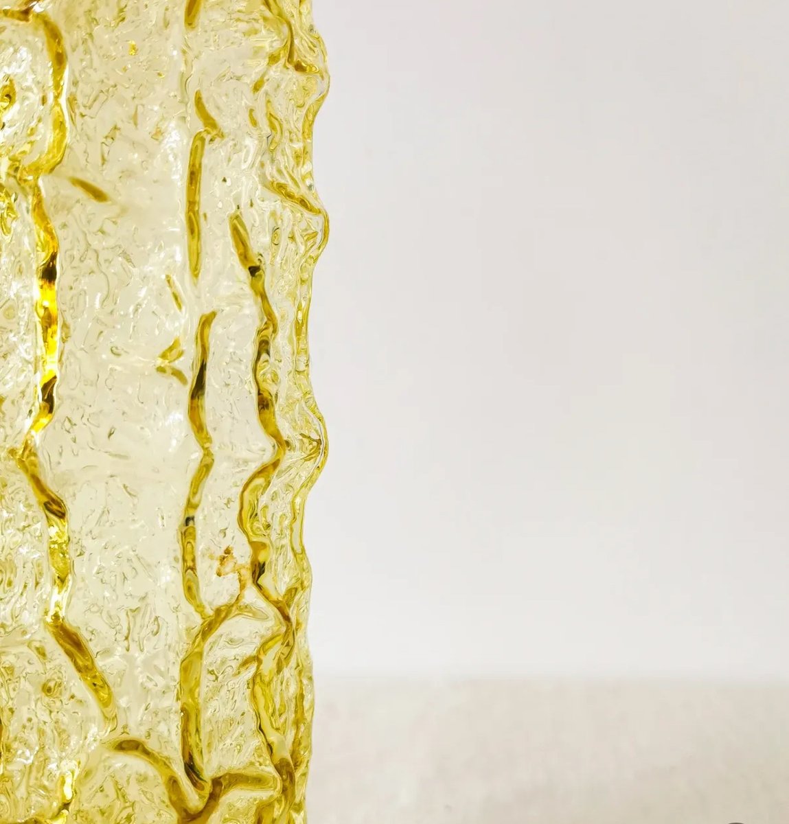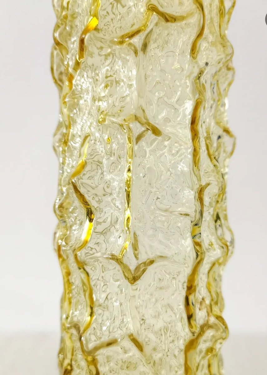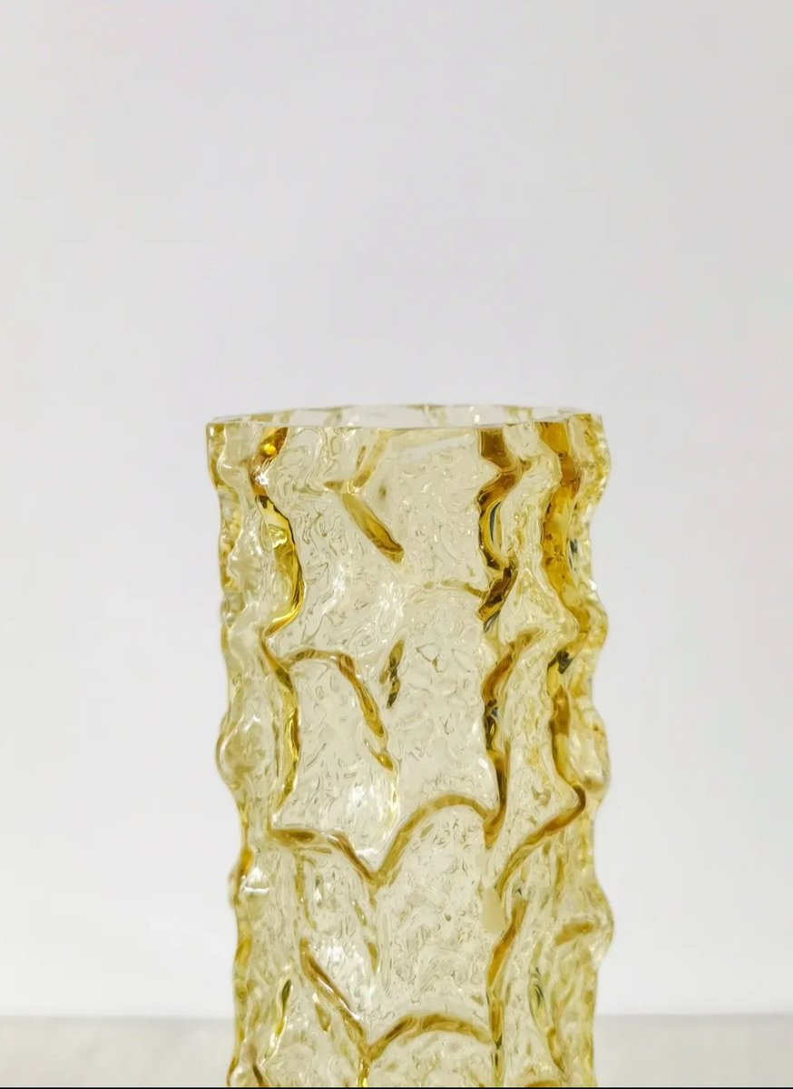Questo sorprendente vaso vintage presenta un'audace superficie strutturata a corteccia in vetro pressato color ambra. La struttura ha uno stile decisamente di metà secolo, che ricorda l'estetica organica brutalista popolare nel design scandinavo e mitteleuropeo degli anni Sessanta e Settanta.